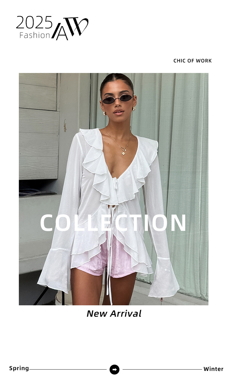 프랑스 쉬폰 V 넥 호른 소매 러플 긴 소매 셔츠 2025 유럽과 미국의 봄과 여름 패션 새로운 국경 탑스토어 가기