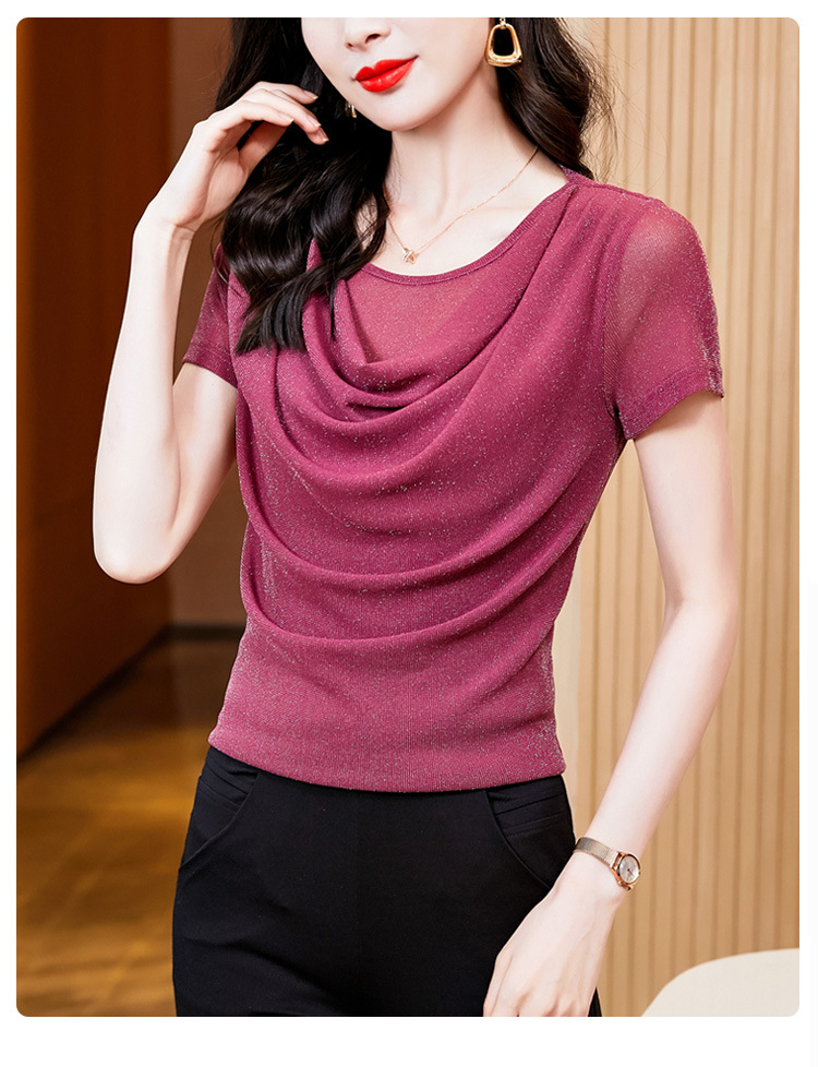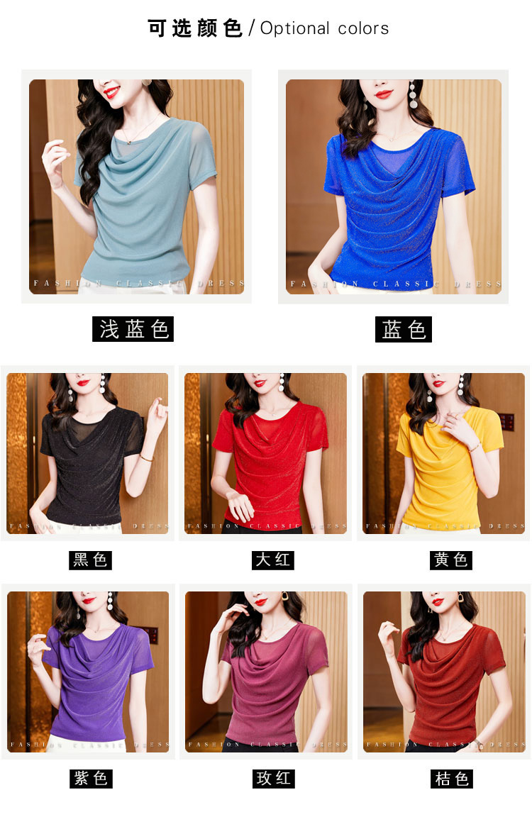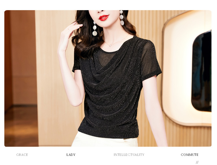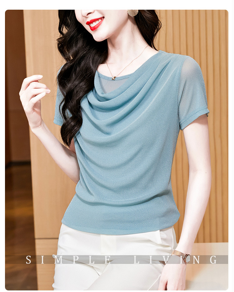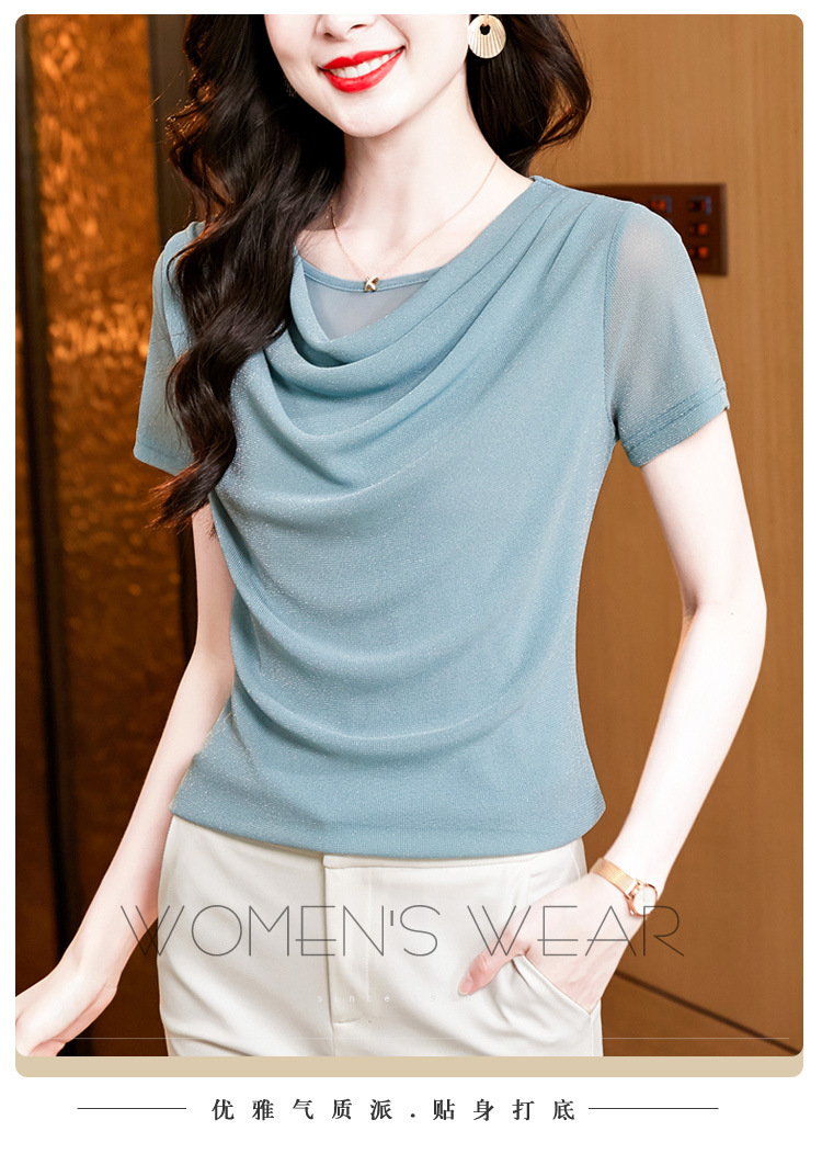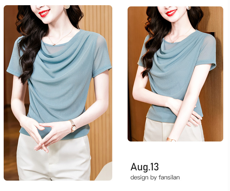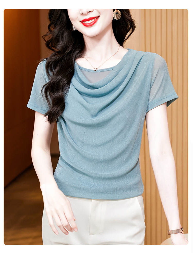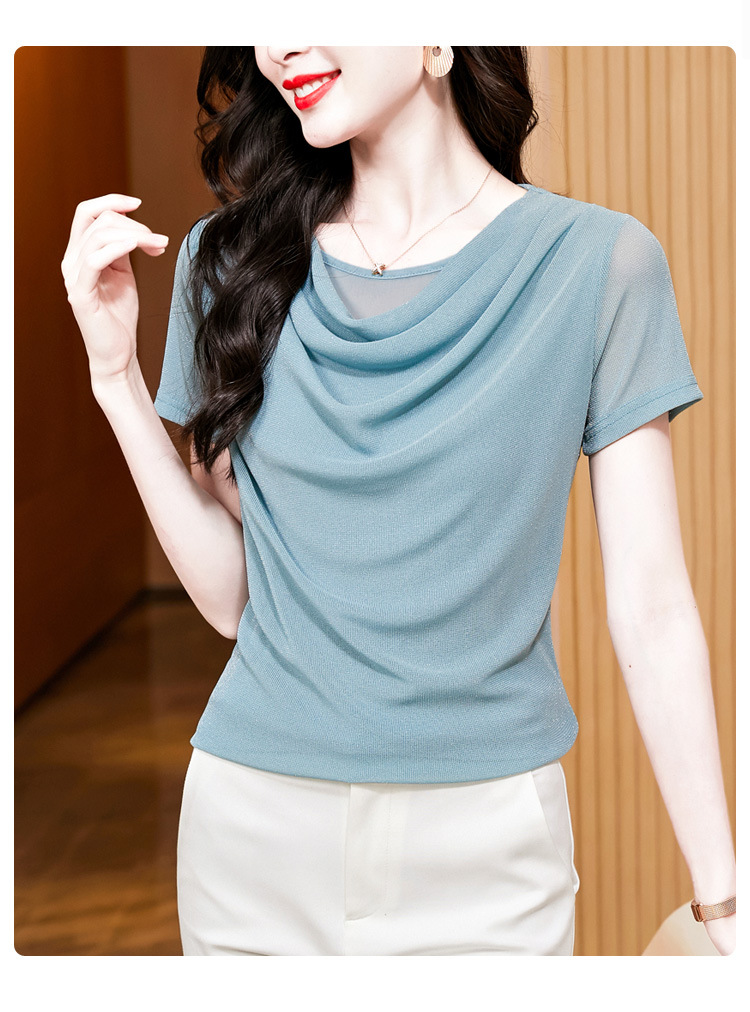 2025 여름 새로운 외국 스타일 조커 슬림 슬림 단색 스윙 칼라 메쉬 짧은 소매 기본 셔츠 티셔츠 도매스토어 가기