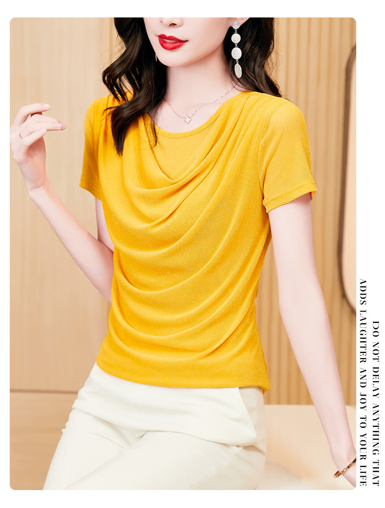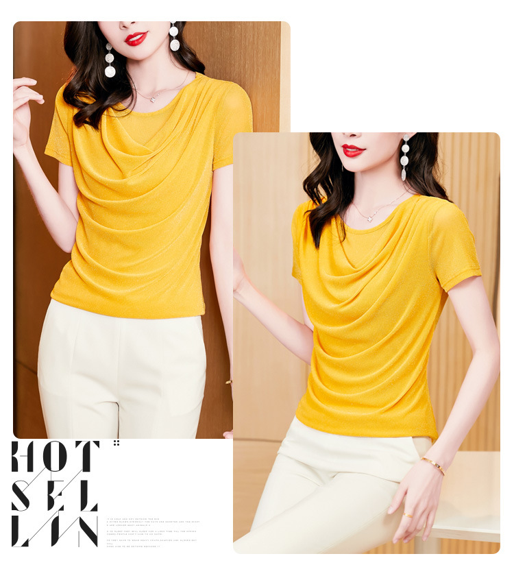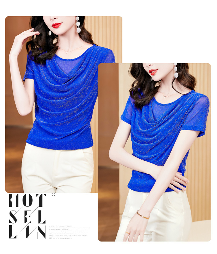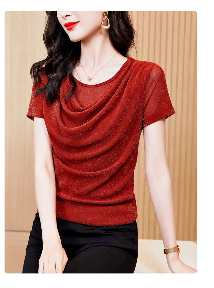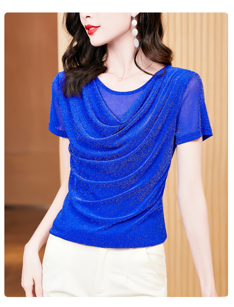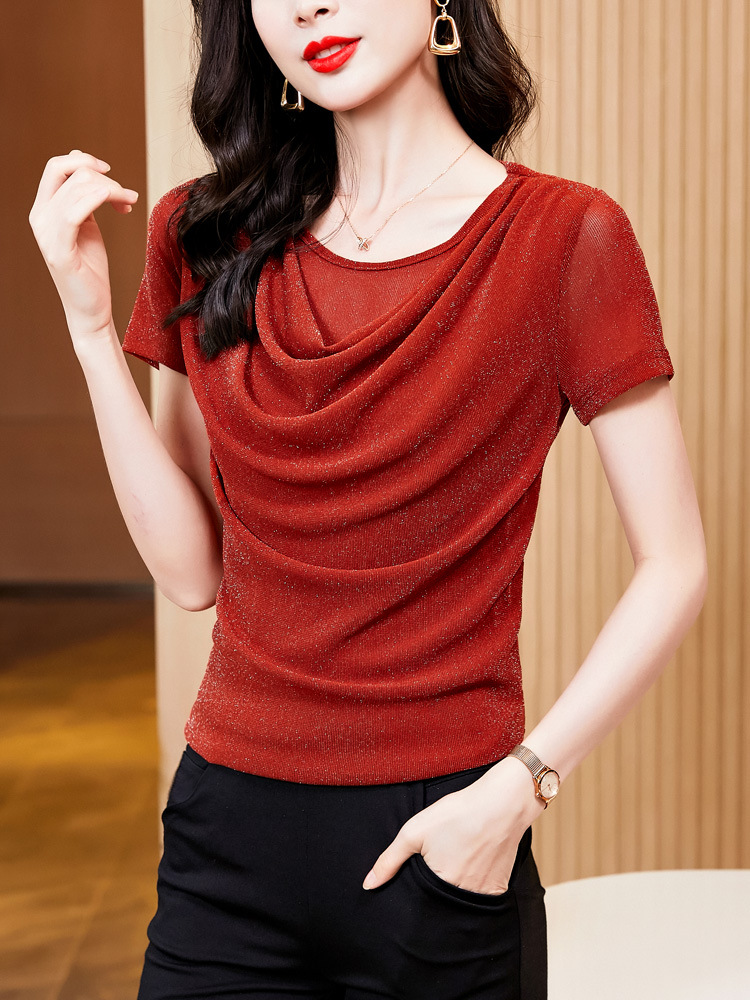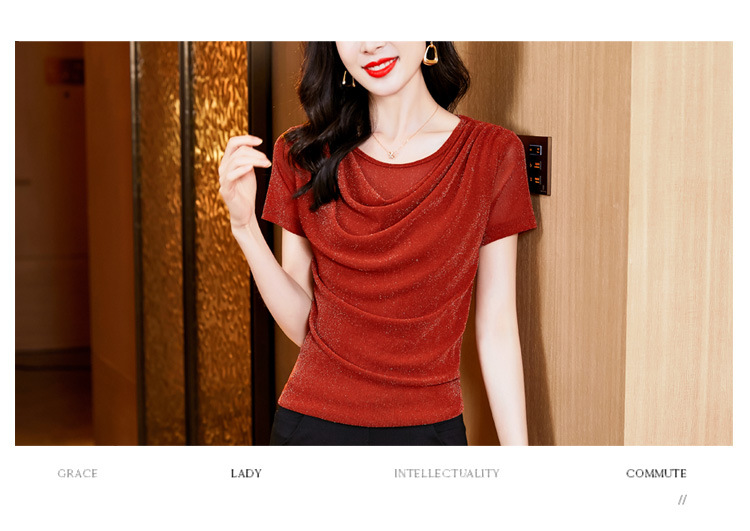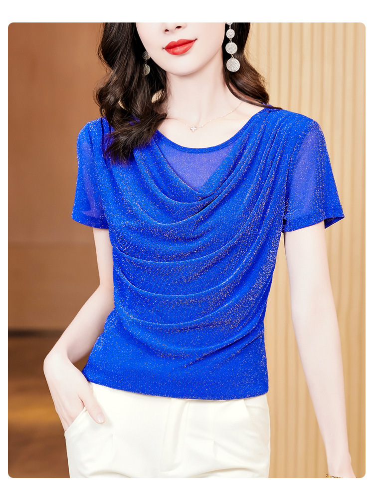 2025 여름 새로운 외국 스타일 조커 슬림 슬림 단색 스윙 칼라 메쉬 짧은 소매 기본 셔츠 티셔츠 도매스토어 가기