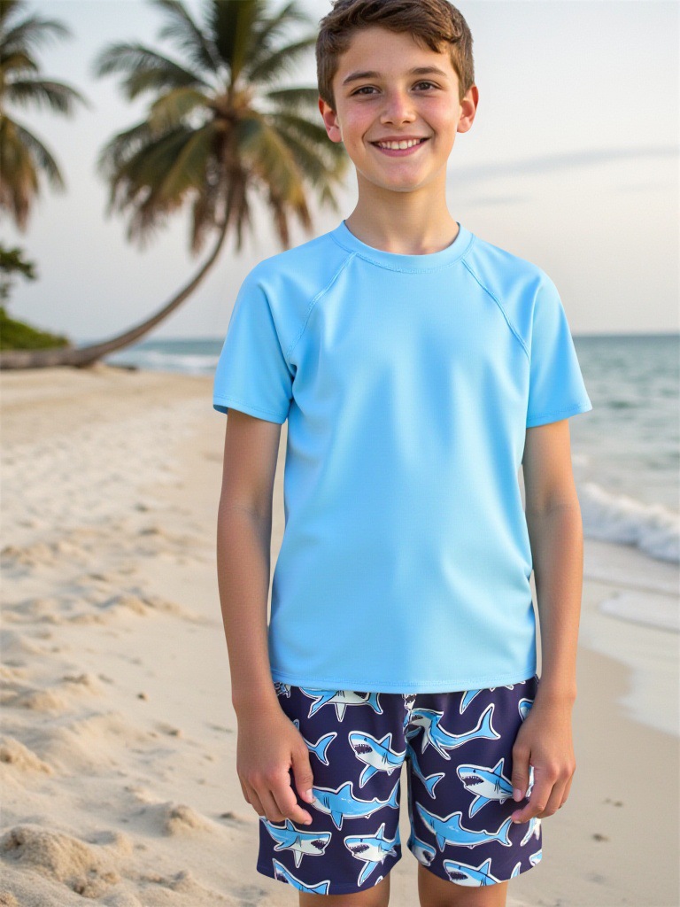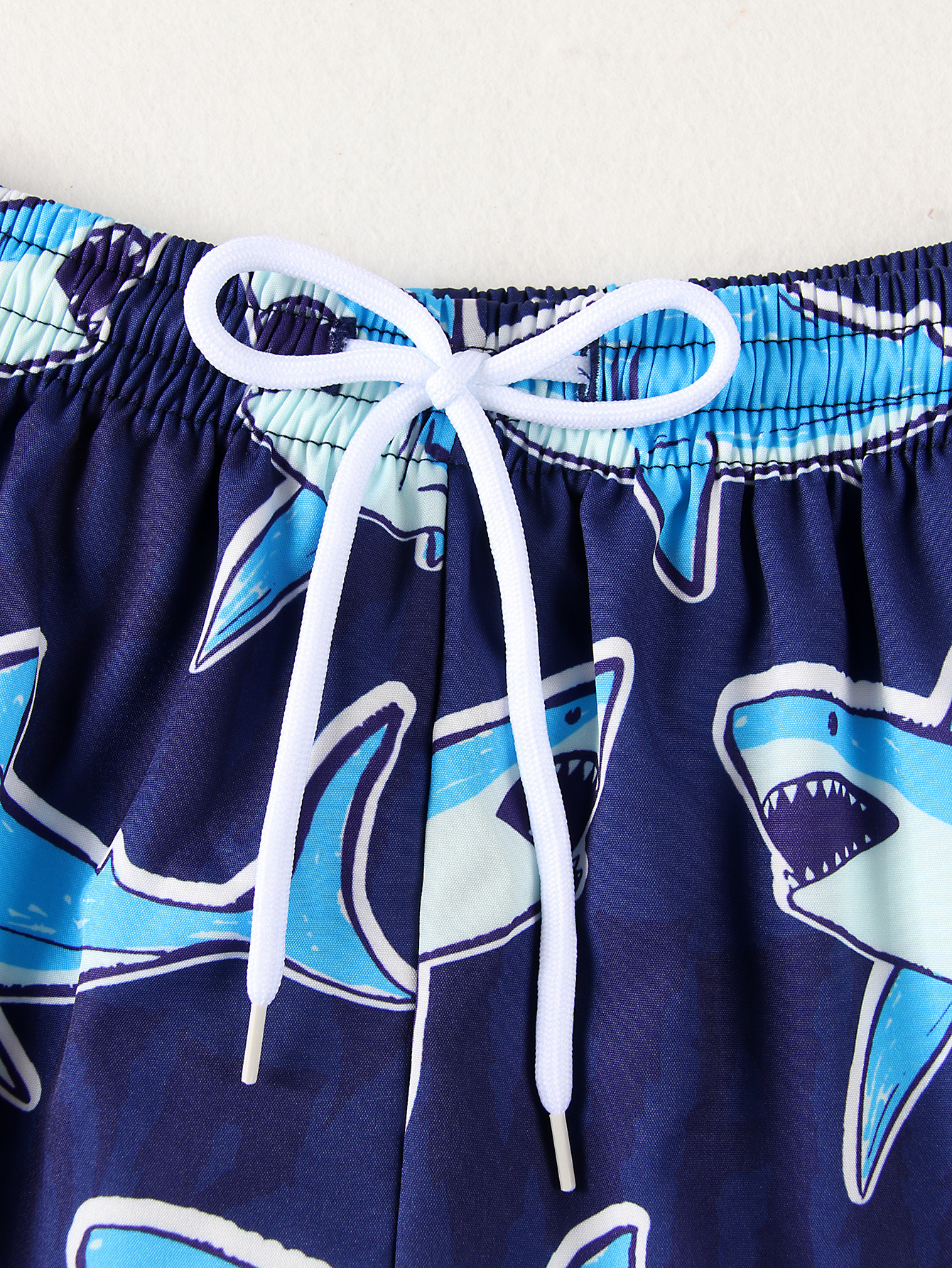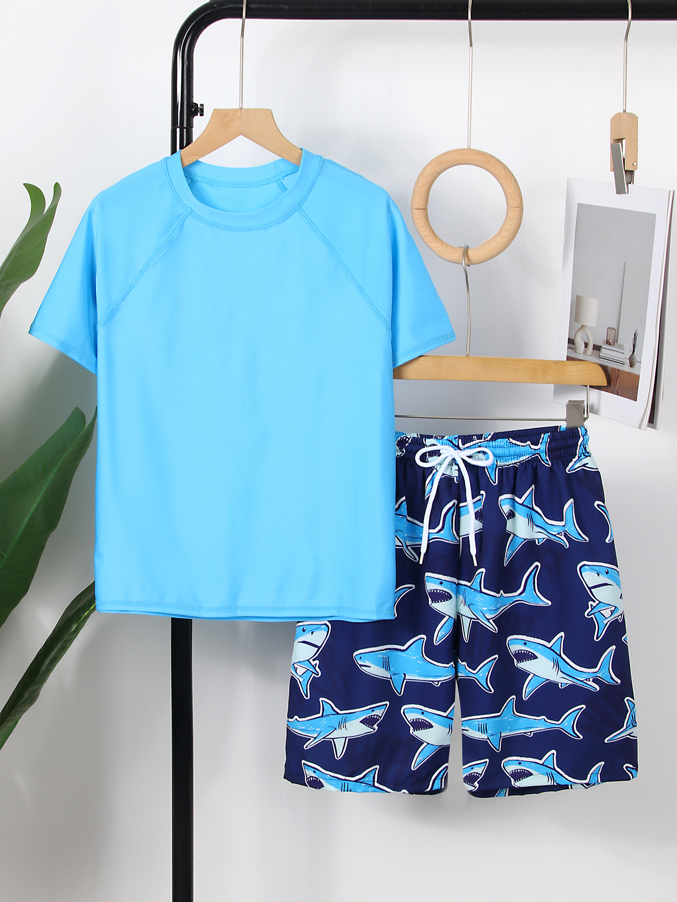 남아용 비치팬츠 수영복 세트, 중대형 아동용 스플릿 반팔 수영복, 자외선 차단 속건성 샤크반바지 수영복