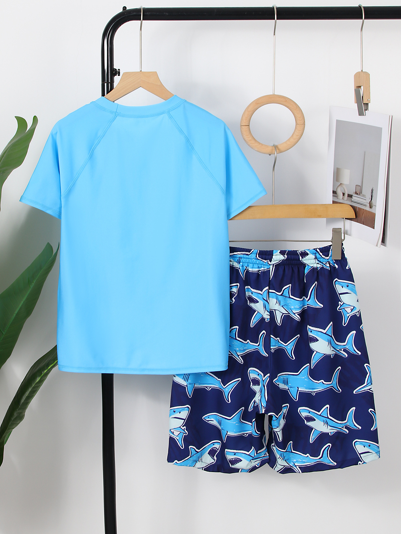 남아용 비치팬츠 수영복 세트, 중대형 아동용 스플릿 반팔 수영복, 자외선 차단 속건성 샤크반바지 수영복스토어 가기