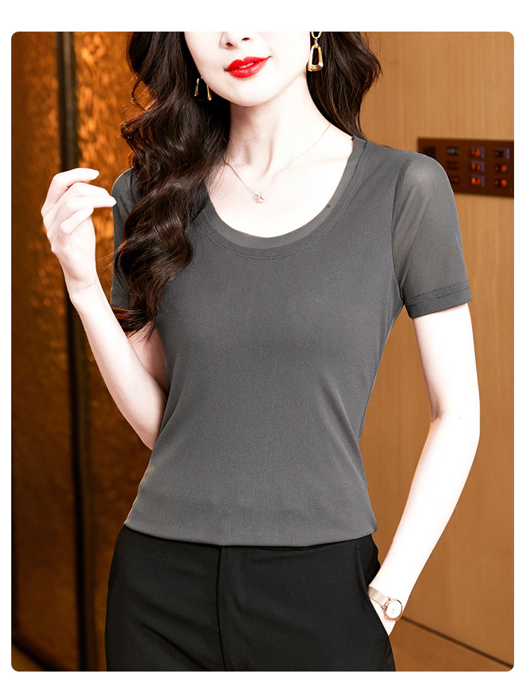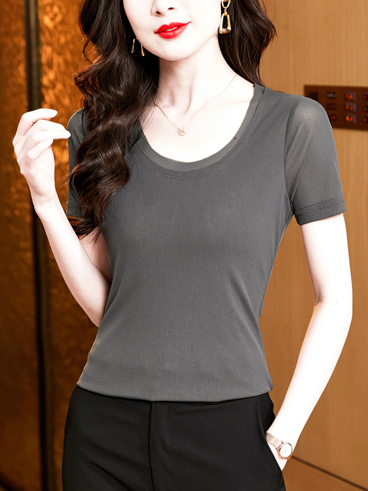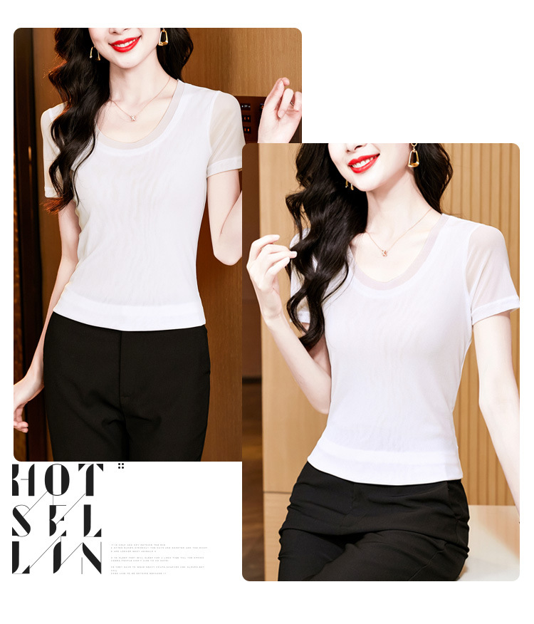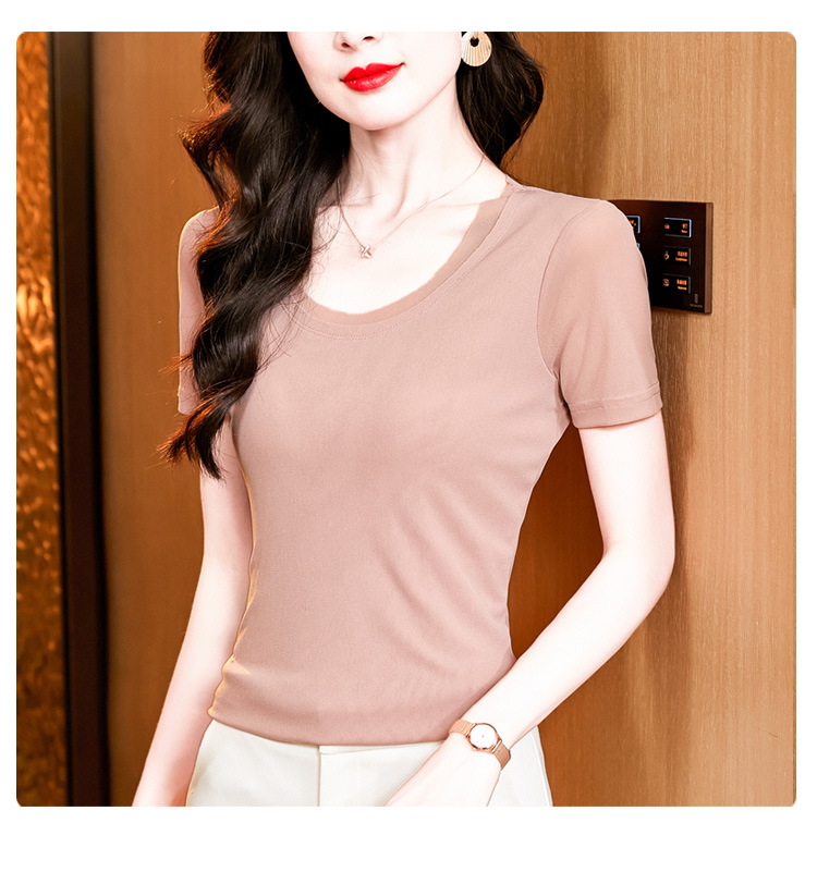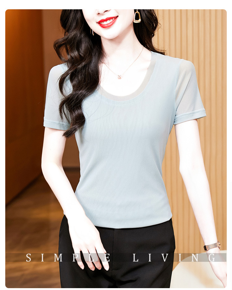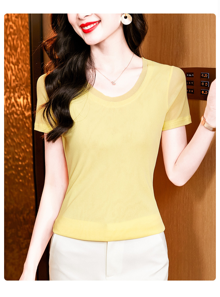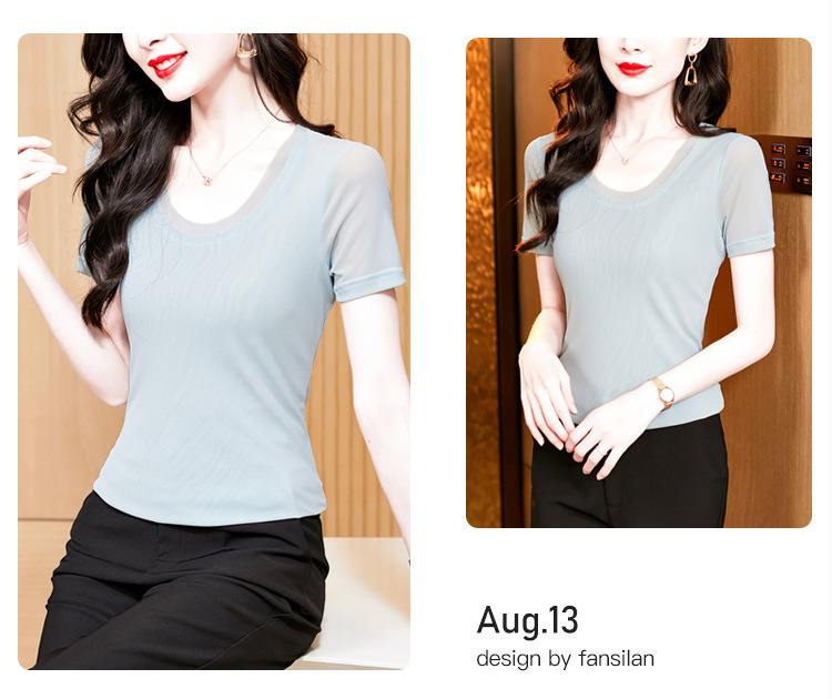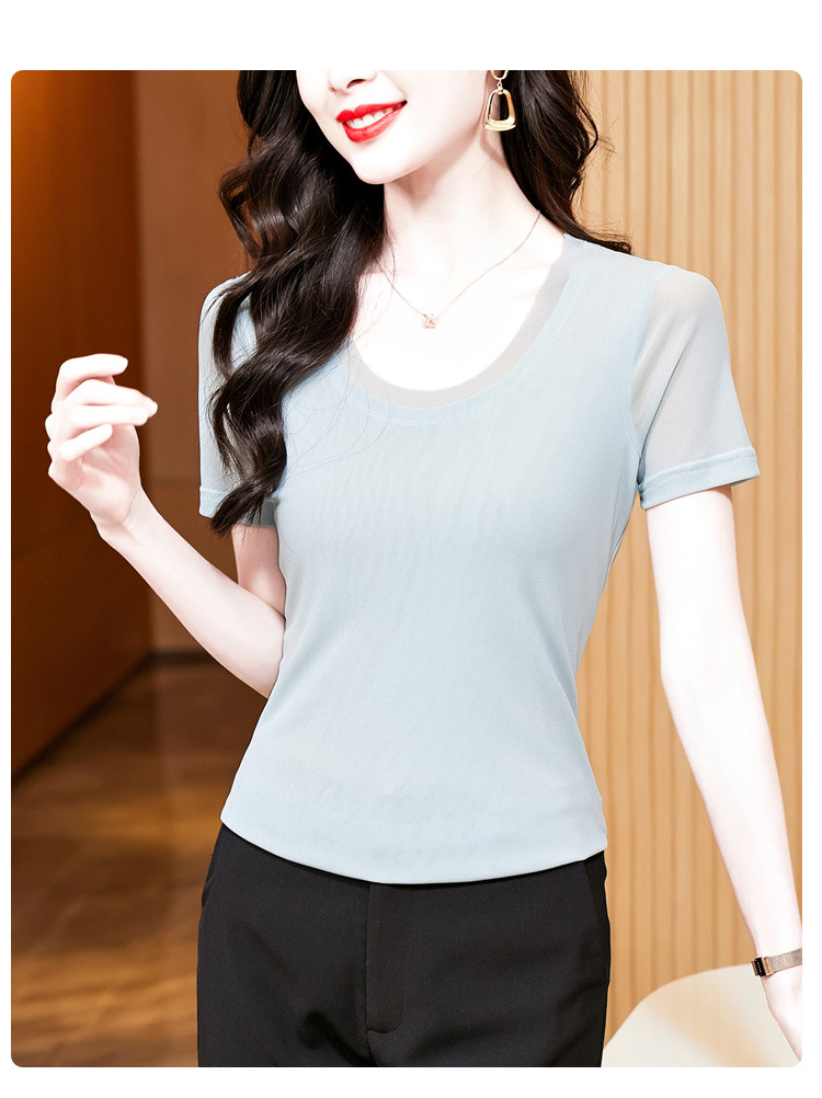 2025 여름 새로운 외국 스타일 조커 둥근 목 단색 슬림 짧은 소매 메쉬베이스 셔츠 여성 도매