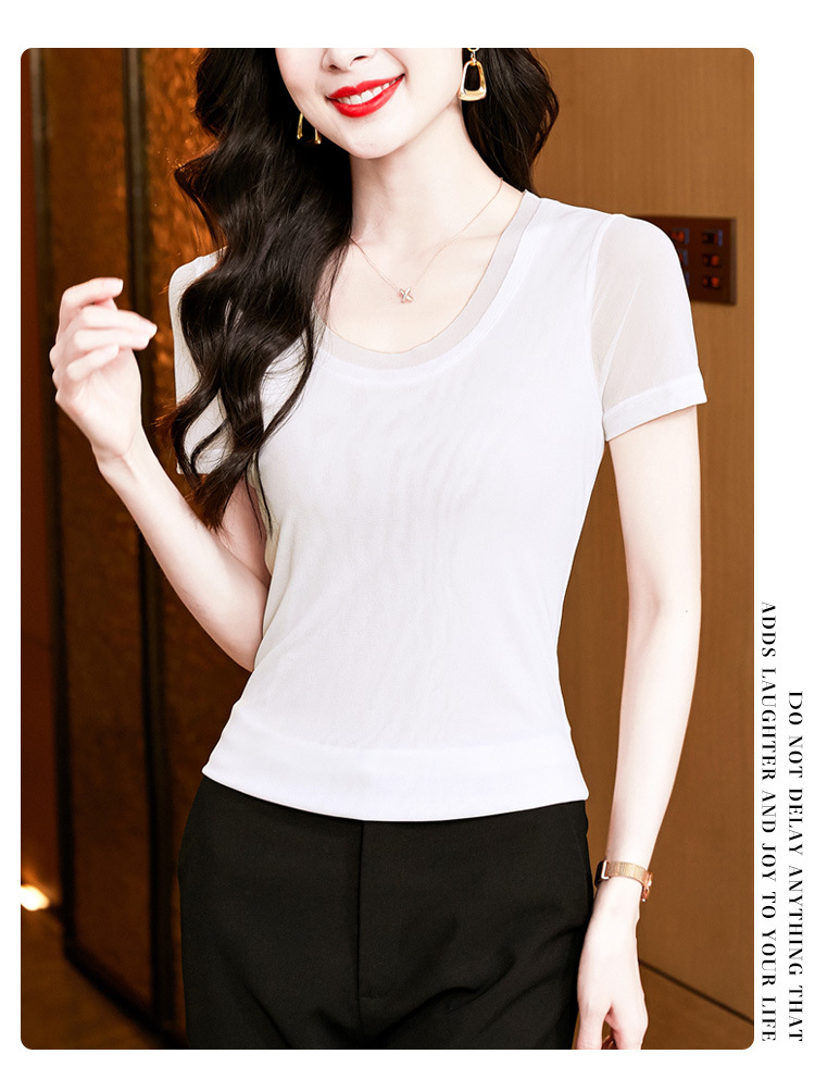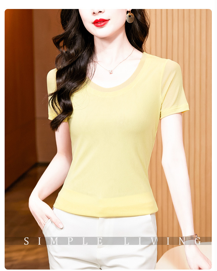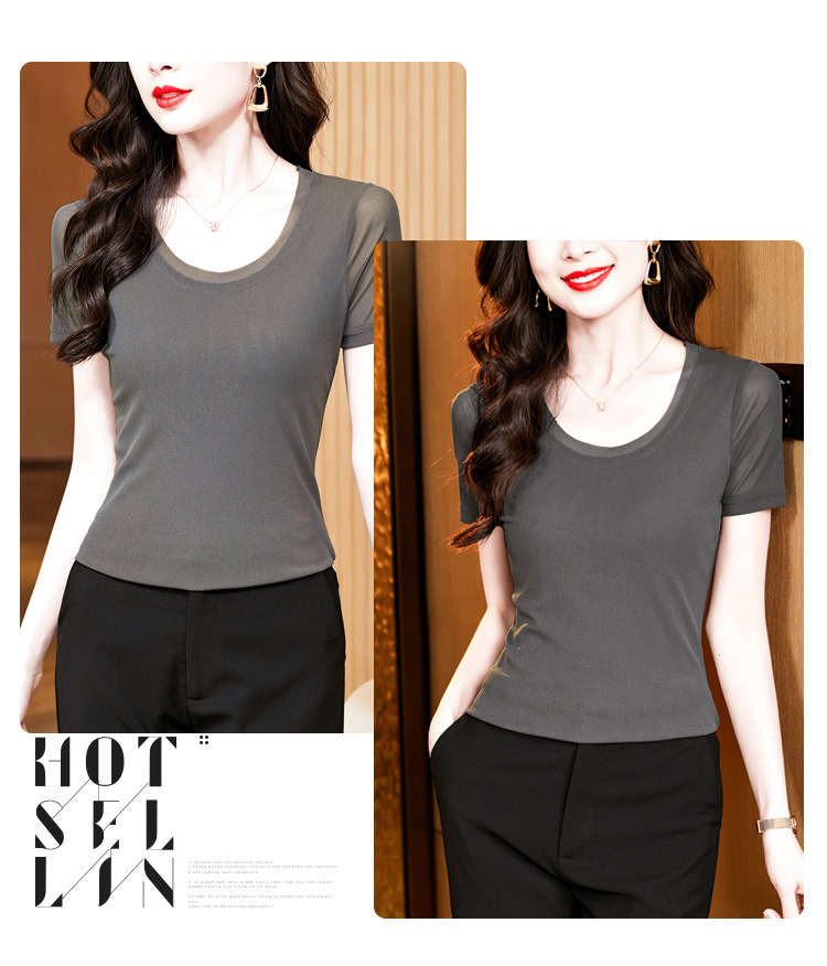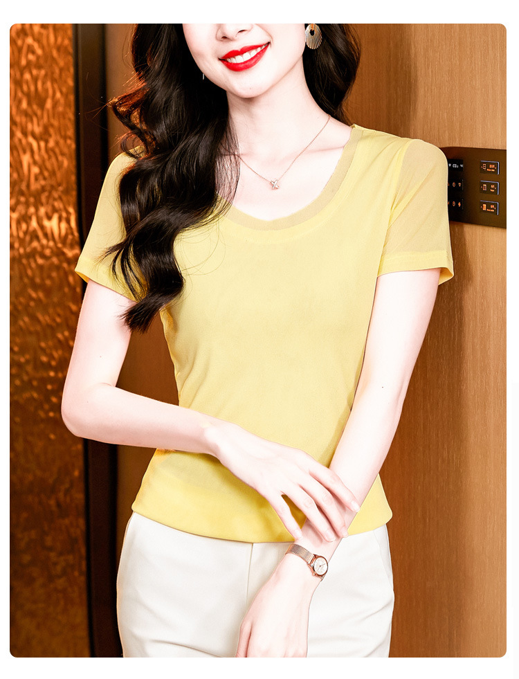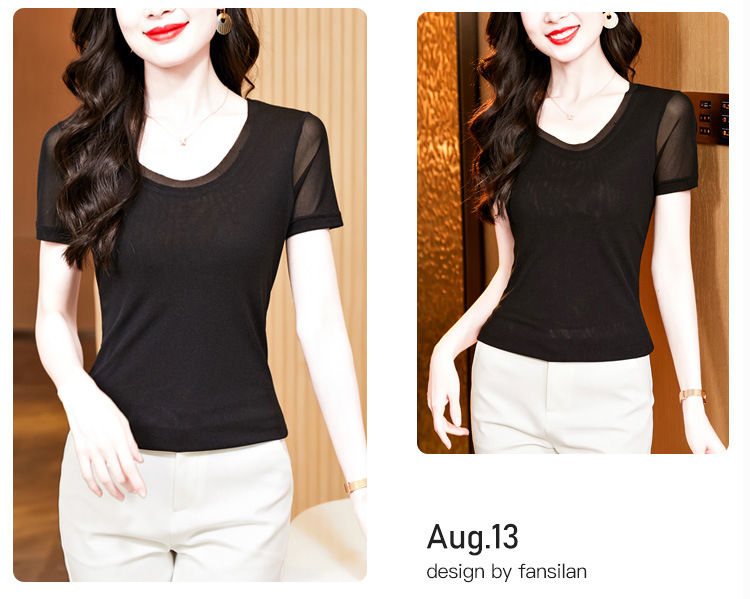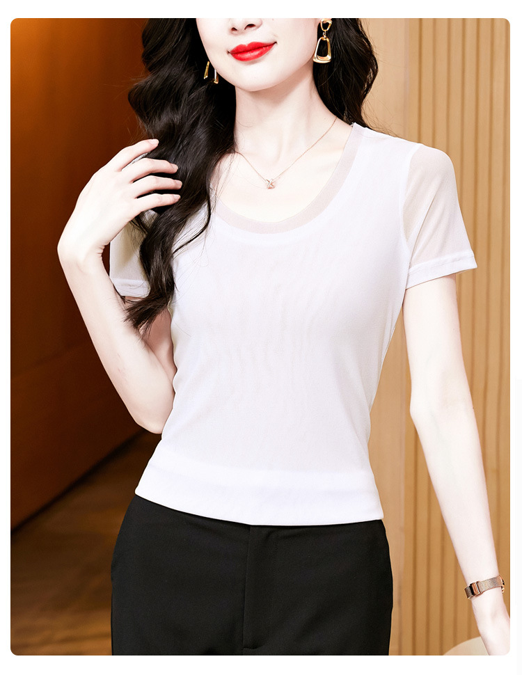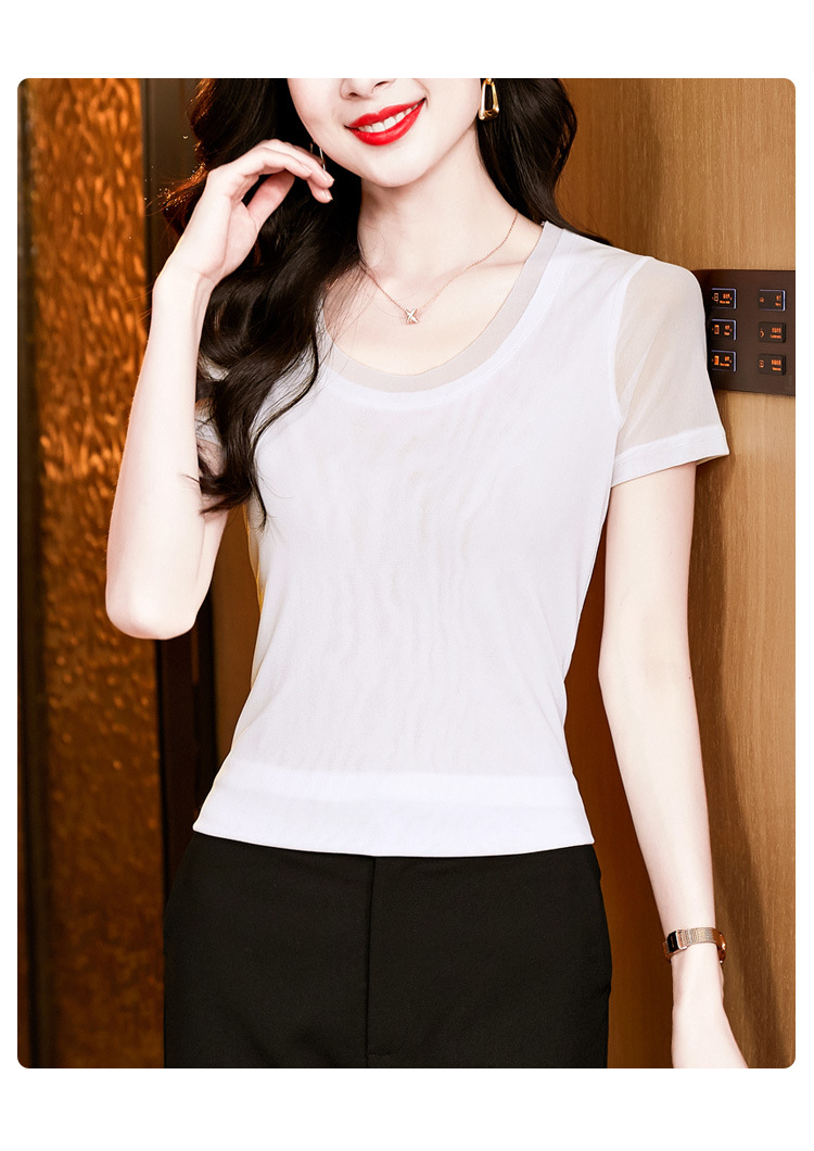 2025 여름 새로운 외국 스타일 조커 둥근 목 단색 슬림 짧은 소매 메쉬베이스 셔츠 여성 도매