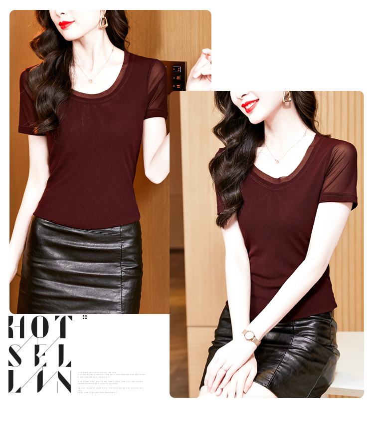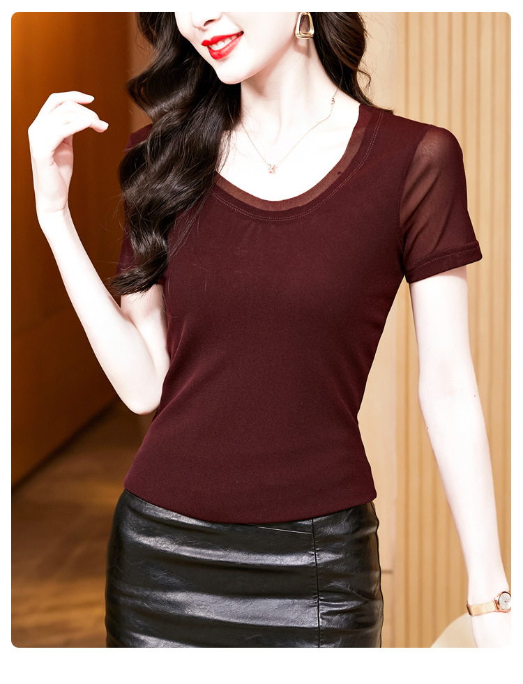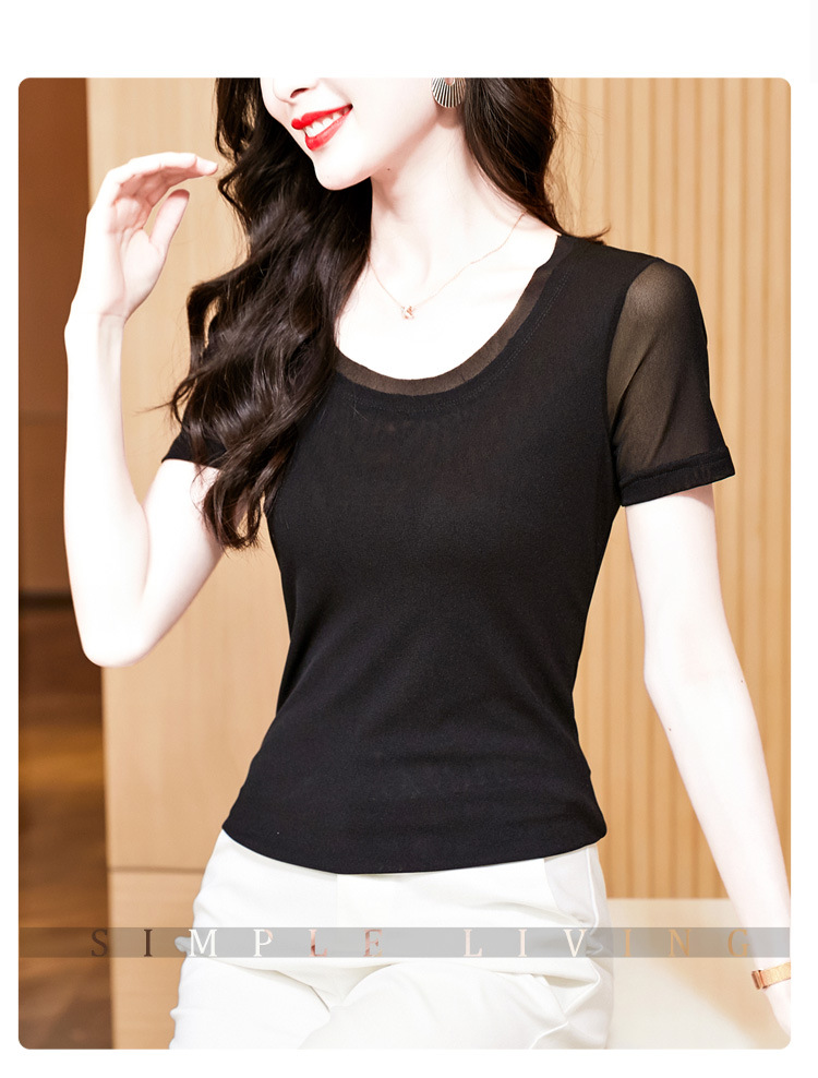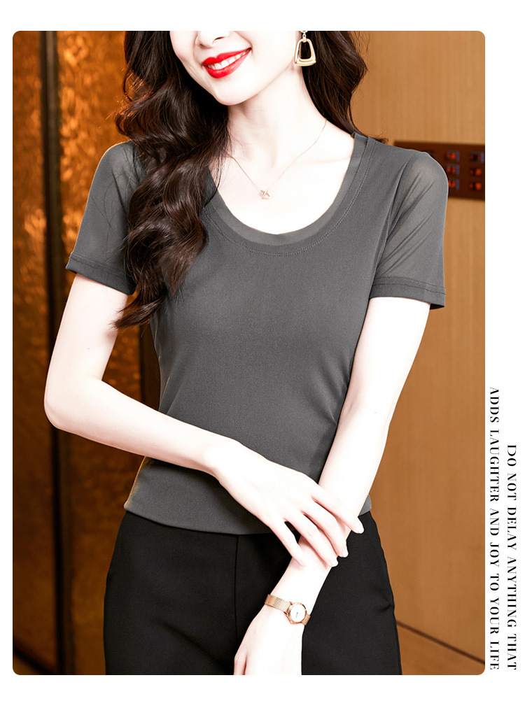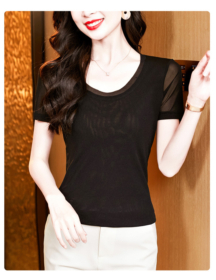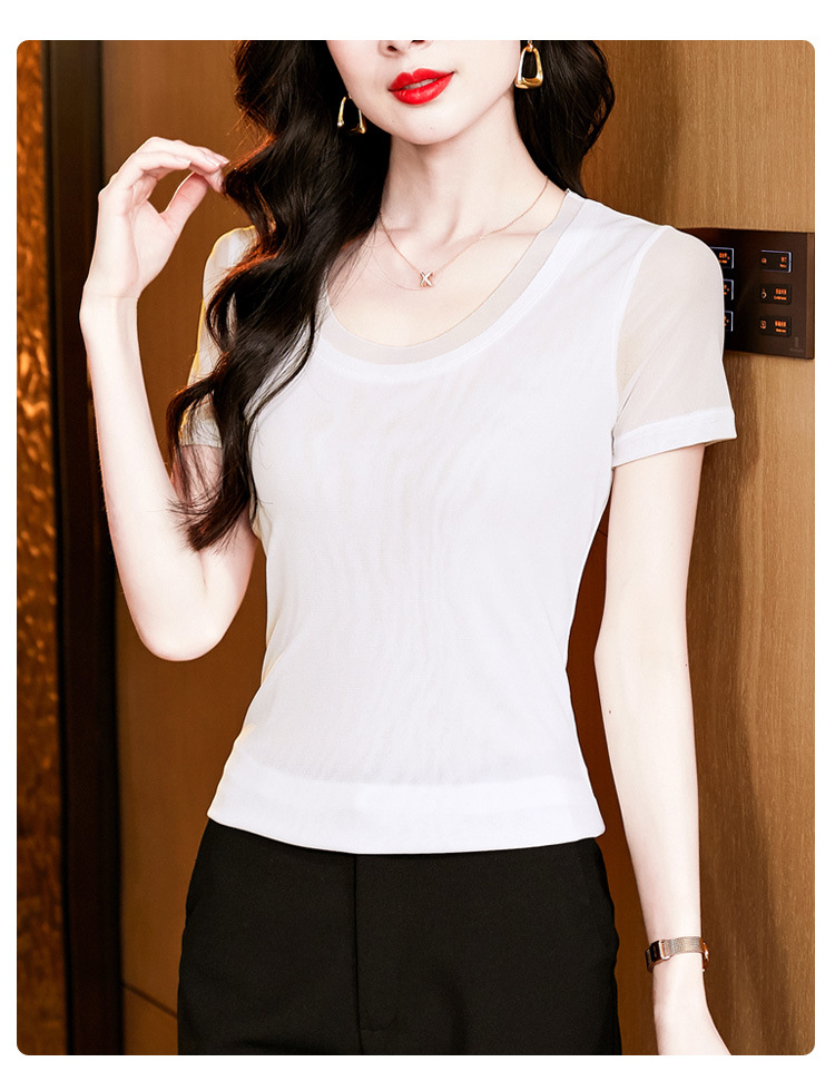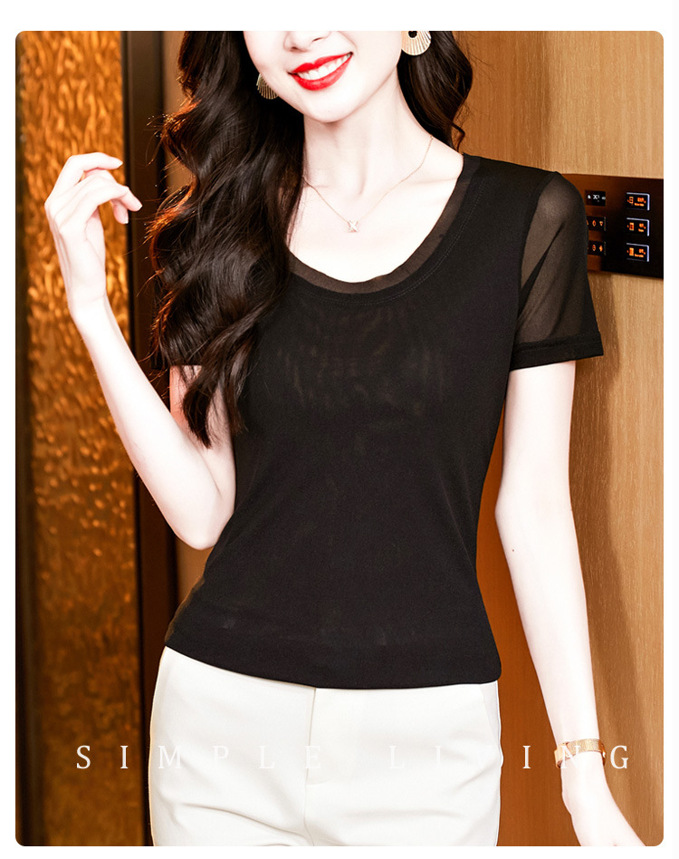 2025 여름 새로운 외국 스타일 조커 둥근 목 단색 슬림 짧은 소매 메쉬베이스 셔츠 여성 도매