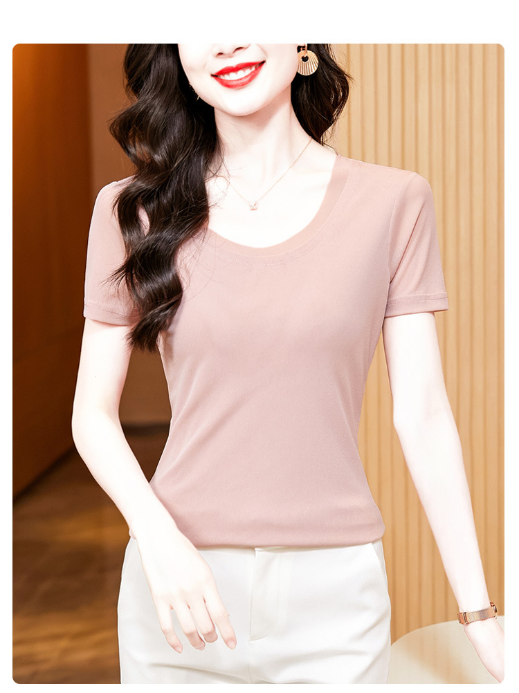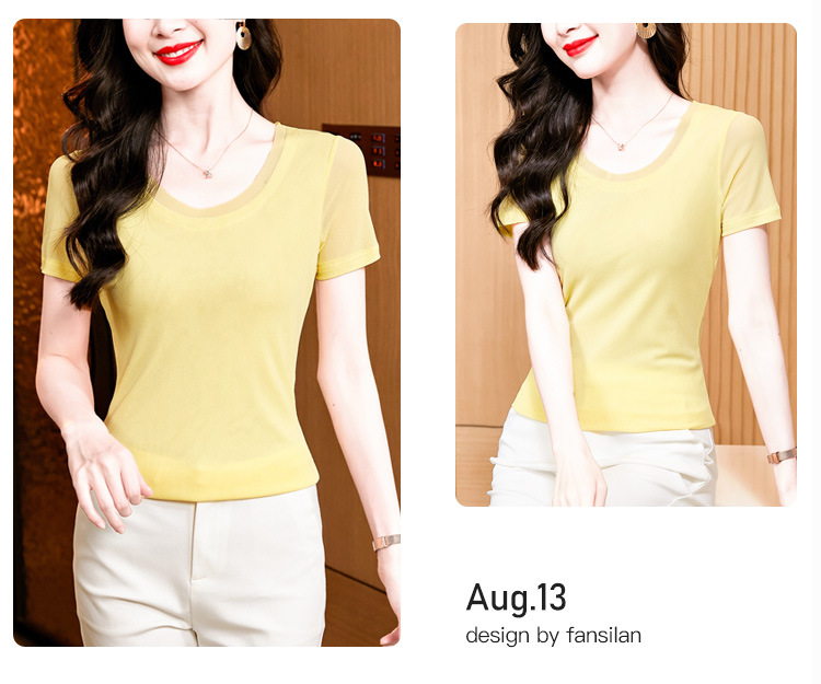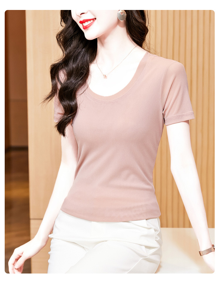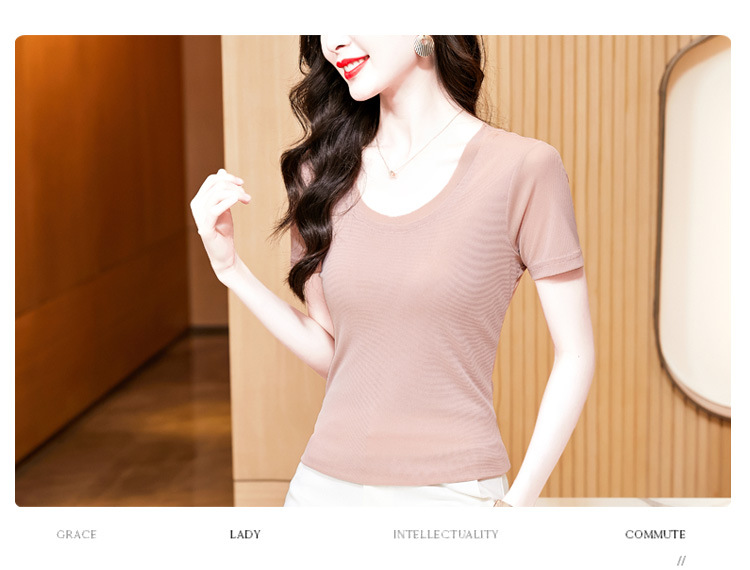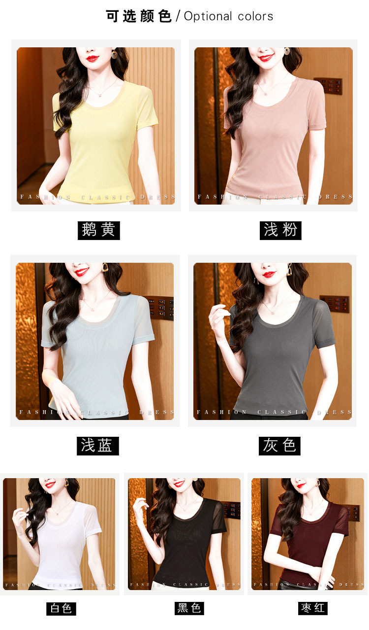 2025 여름 새로운 외국 스타일 조커 둥근 목 단색 슬림 짧은 소매 메쉬베이스 셔츠 여성 도매스토어 가기