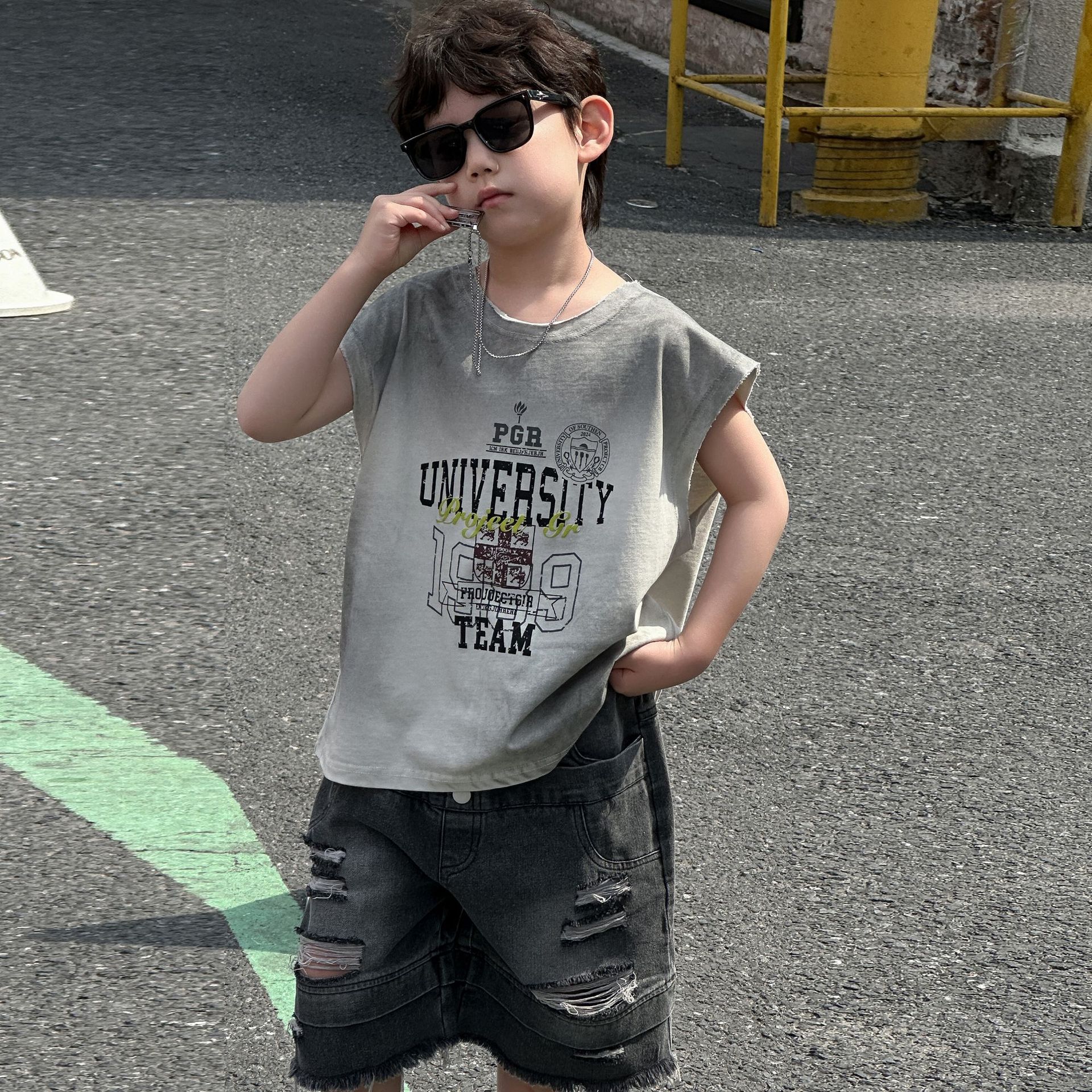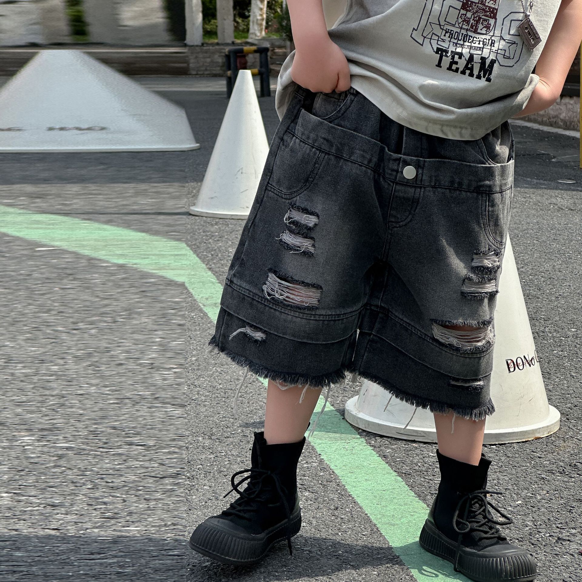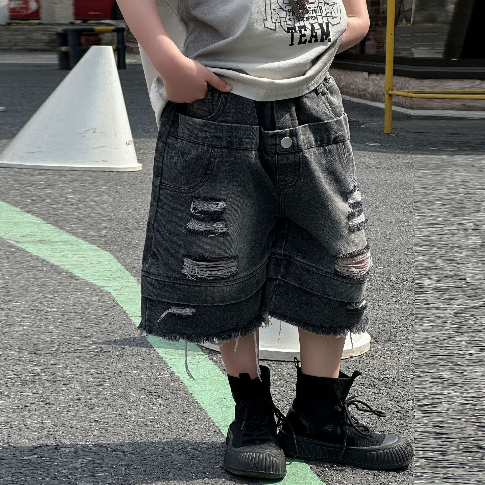 소년의 여름 트렌디 브랜드 와이드 다리 반바지 2025 새로운 어린이 느슨한 청바지 소년 5 점 바지 중 바지 아동복스토어 가기