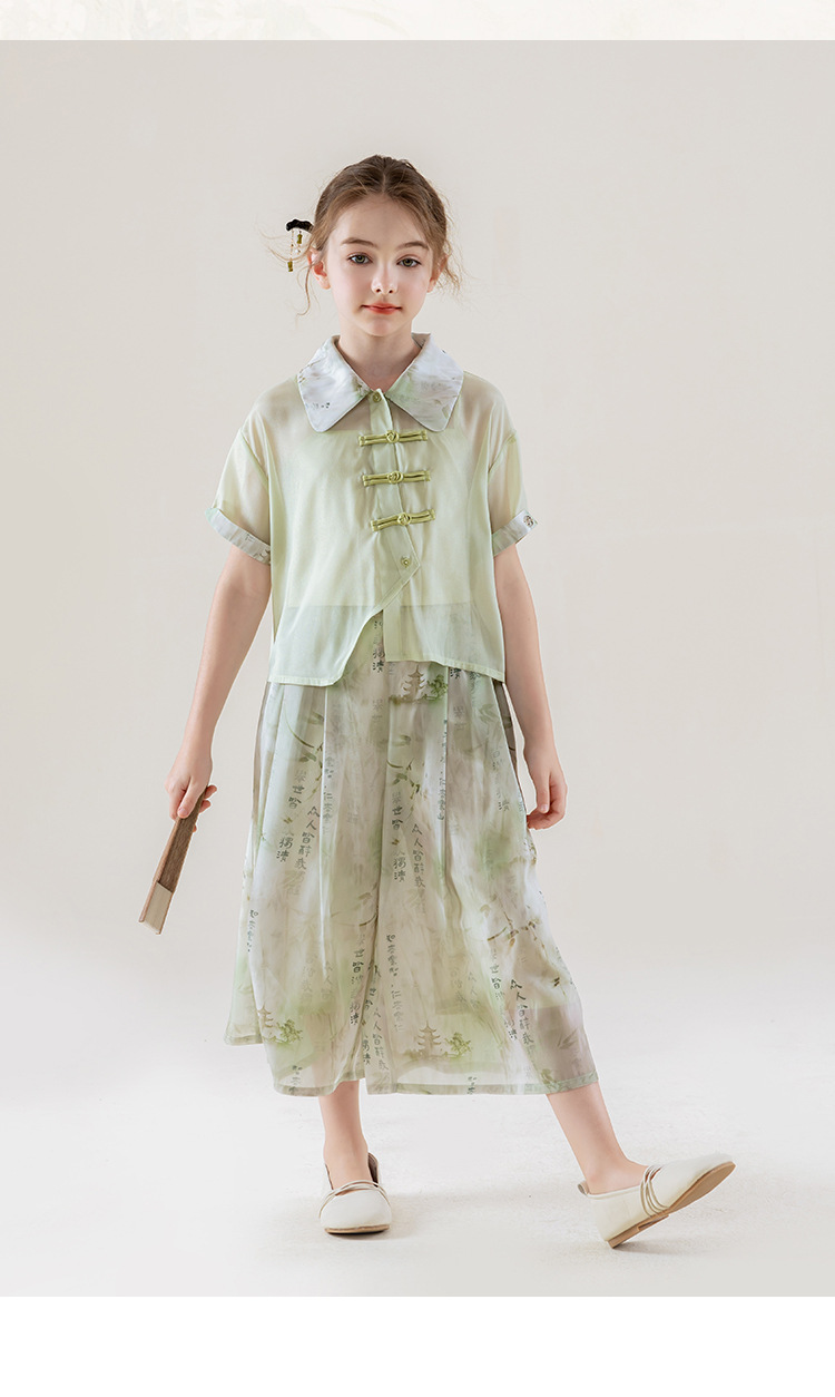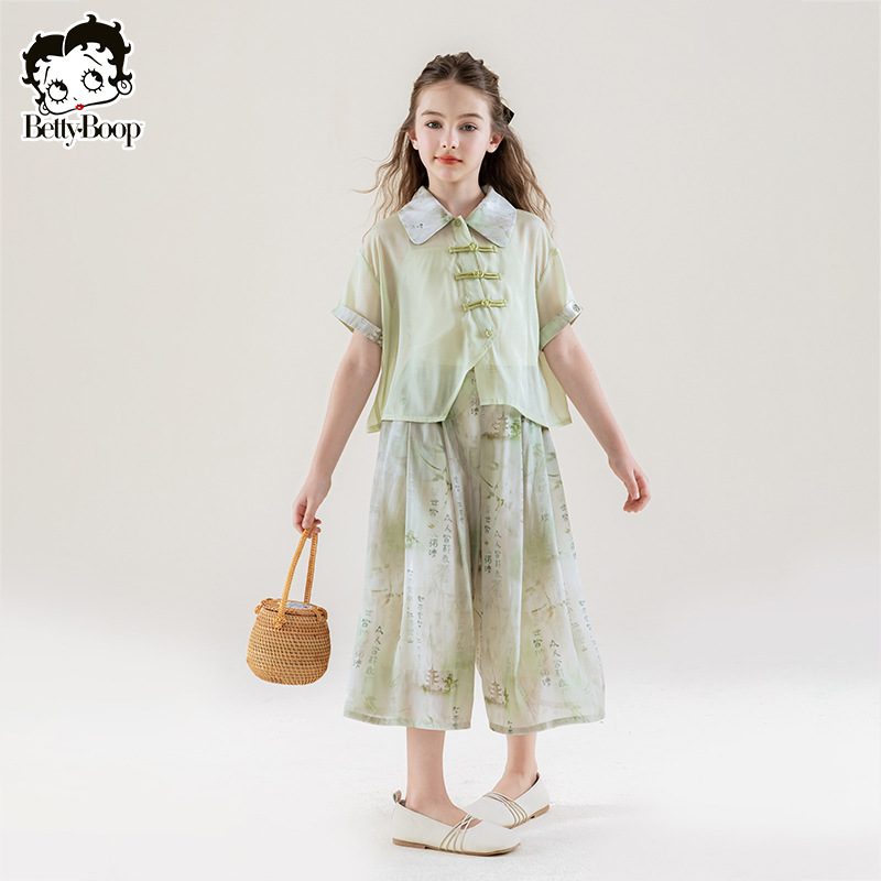 쿨 베티 소녀의 새로운 중국 스타일 셔츠 자른 바지 국가 스타일 세트 2025 여름 어린이 서양식 3 피스 세트