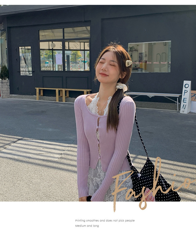 봄과 여름 새로운 한국식 보라색 낮은 둥근 목 중공 버튼 긴팔 니트 카디건 여성의 봄 새로운 슬림 핏 인테리어스토어 가기