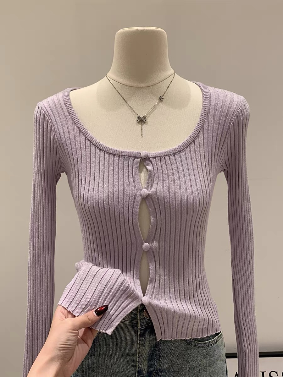 봄과 여름 새로운 한국식 보라색 낮은 둥근 목 중공 버튼 긴팔 니트 카디건 여성의 봄 새로운 슬림 핏 인테리어