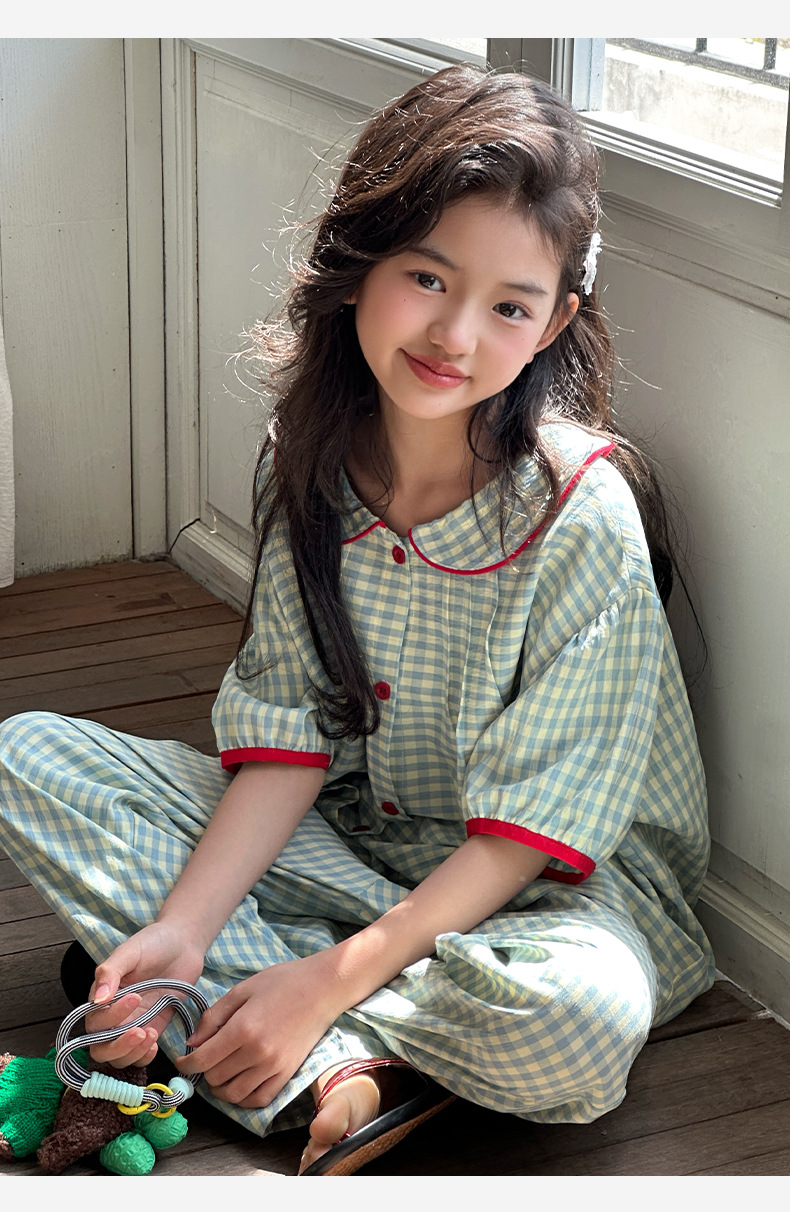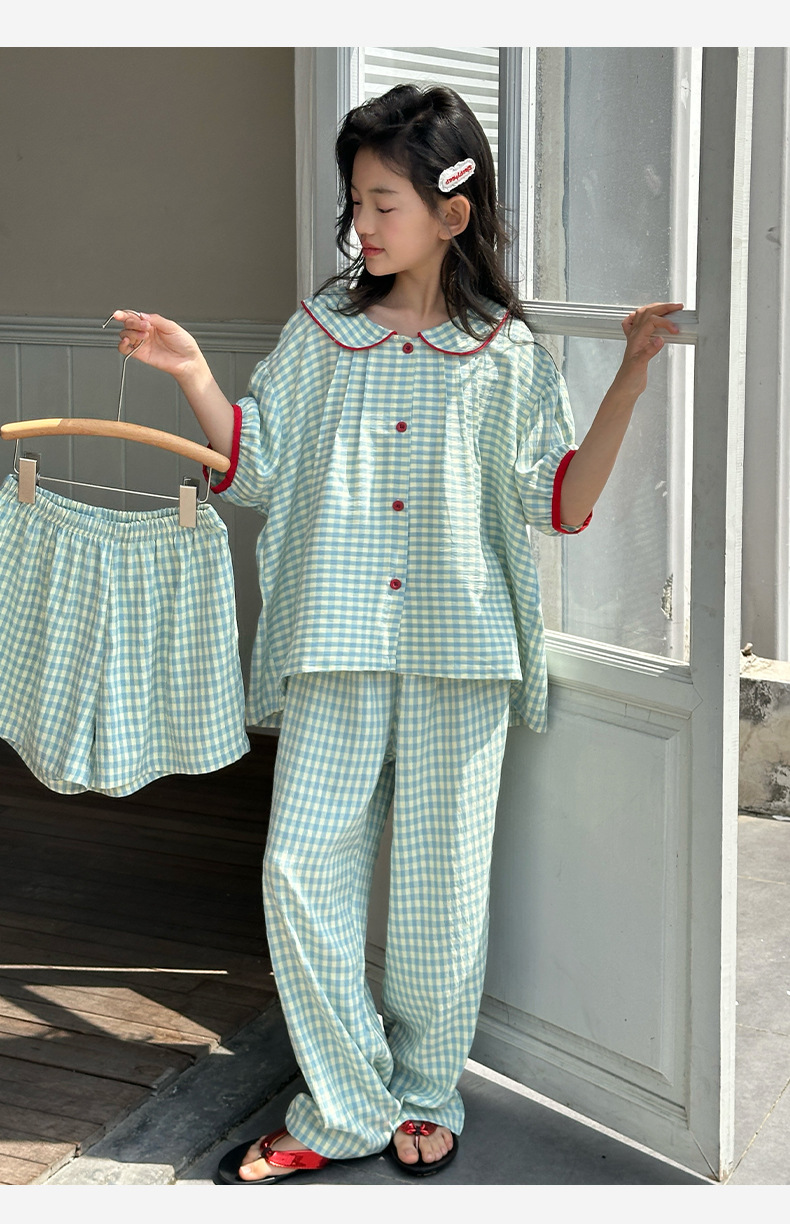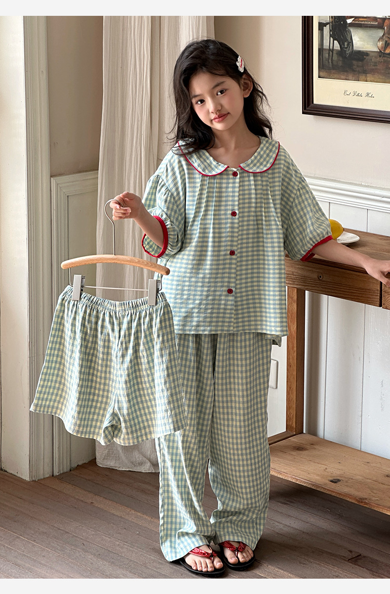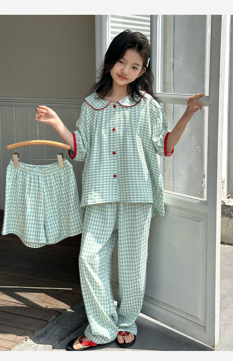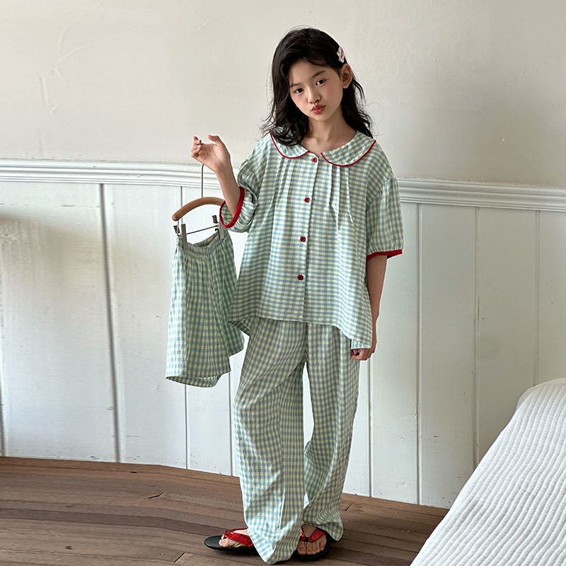 소녀 격자 무늬 잠옷 여름 2025 새로운 어린이 온라인 인기 외국식 홈 옷 3 피스 세트 큰 어린이 에어컨 옷스토어 가기