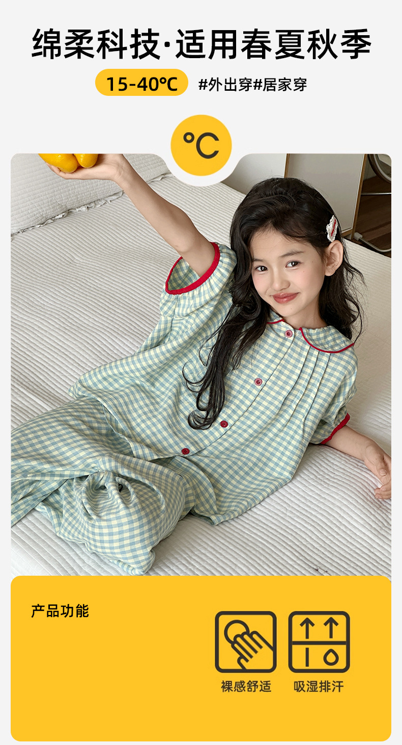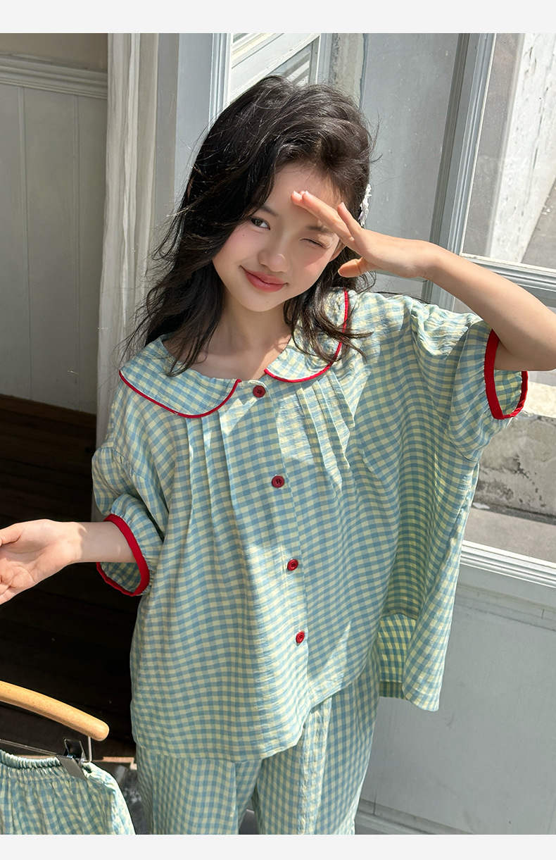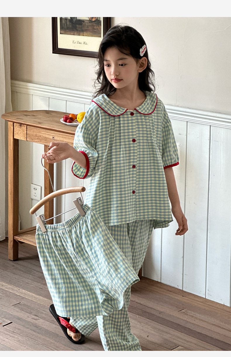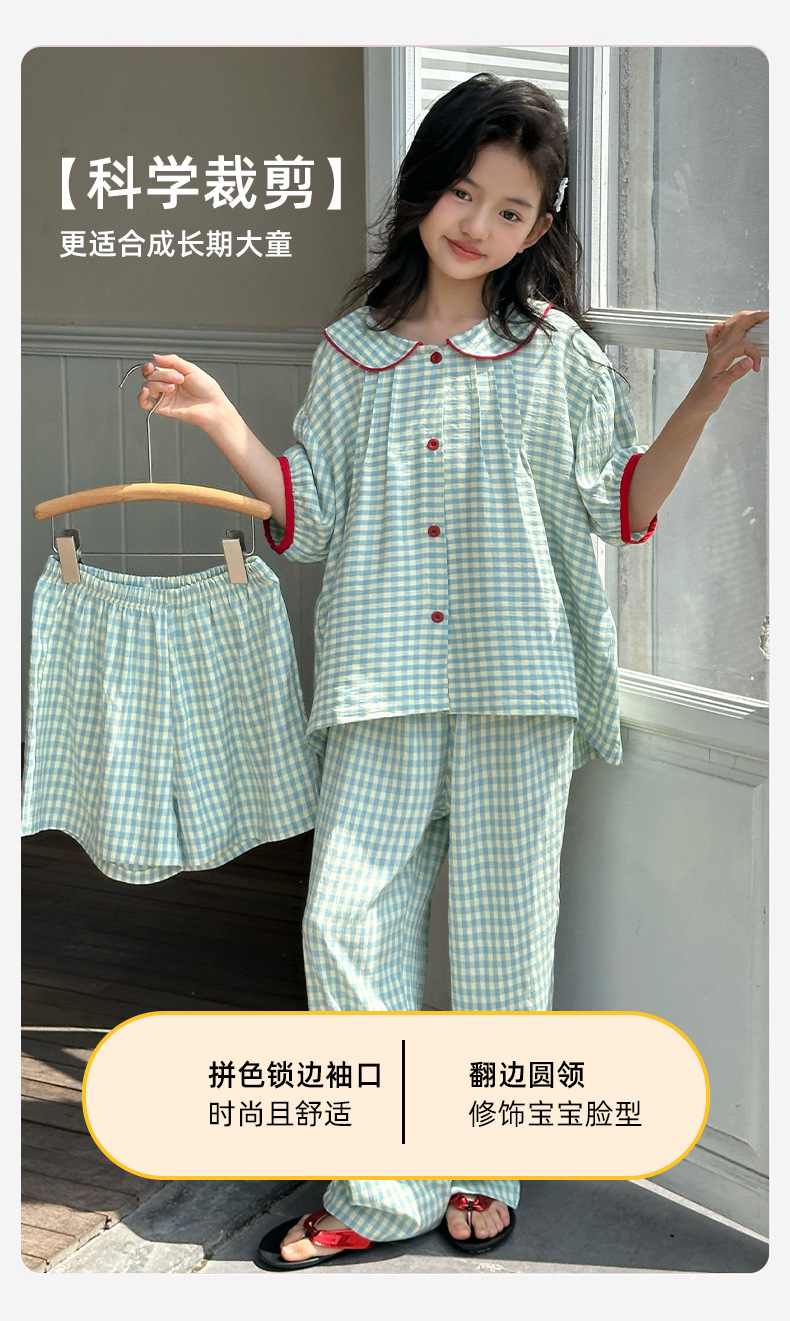 소녀 격자 무늬 잠옷 여름 2025 새로운 어린이 온라인 인기 외국식 홈 옷 3 피스 세트 큰 어린이 에어컨 옷스토어 가기