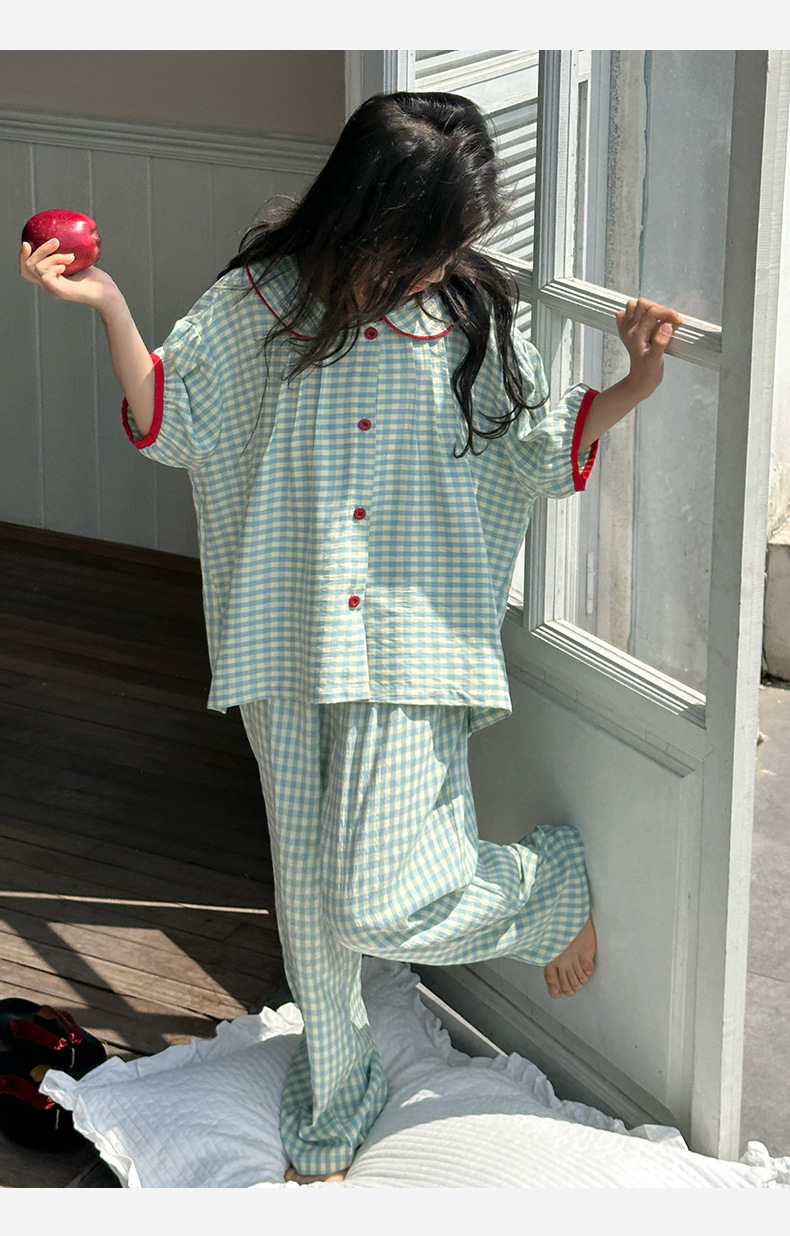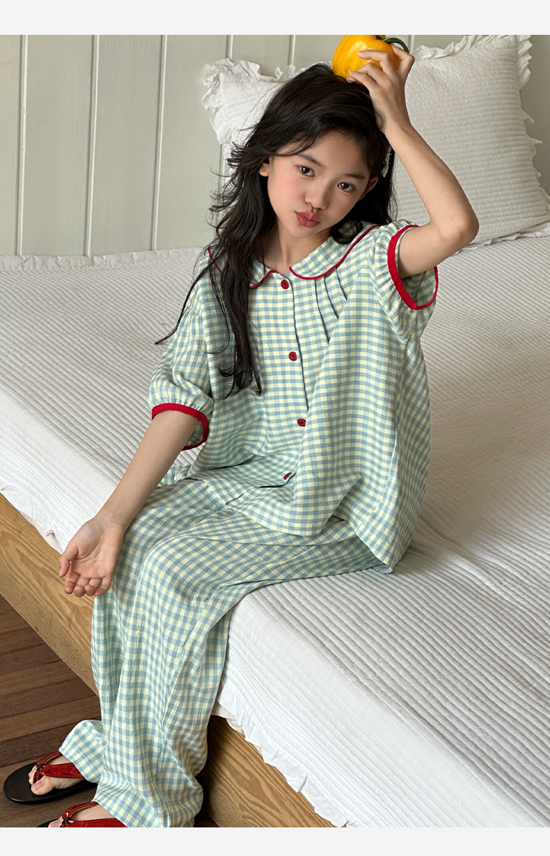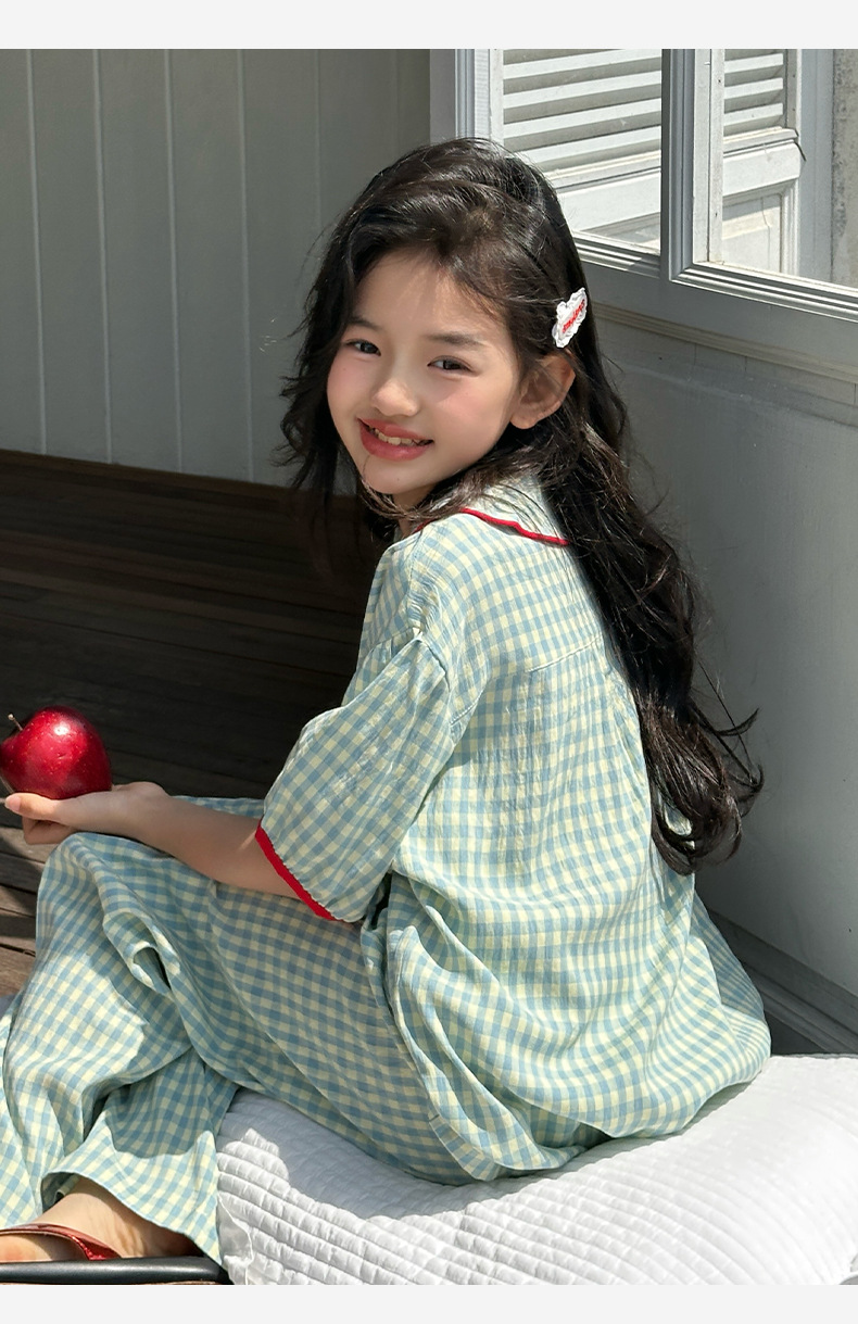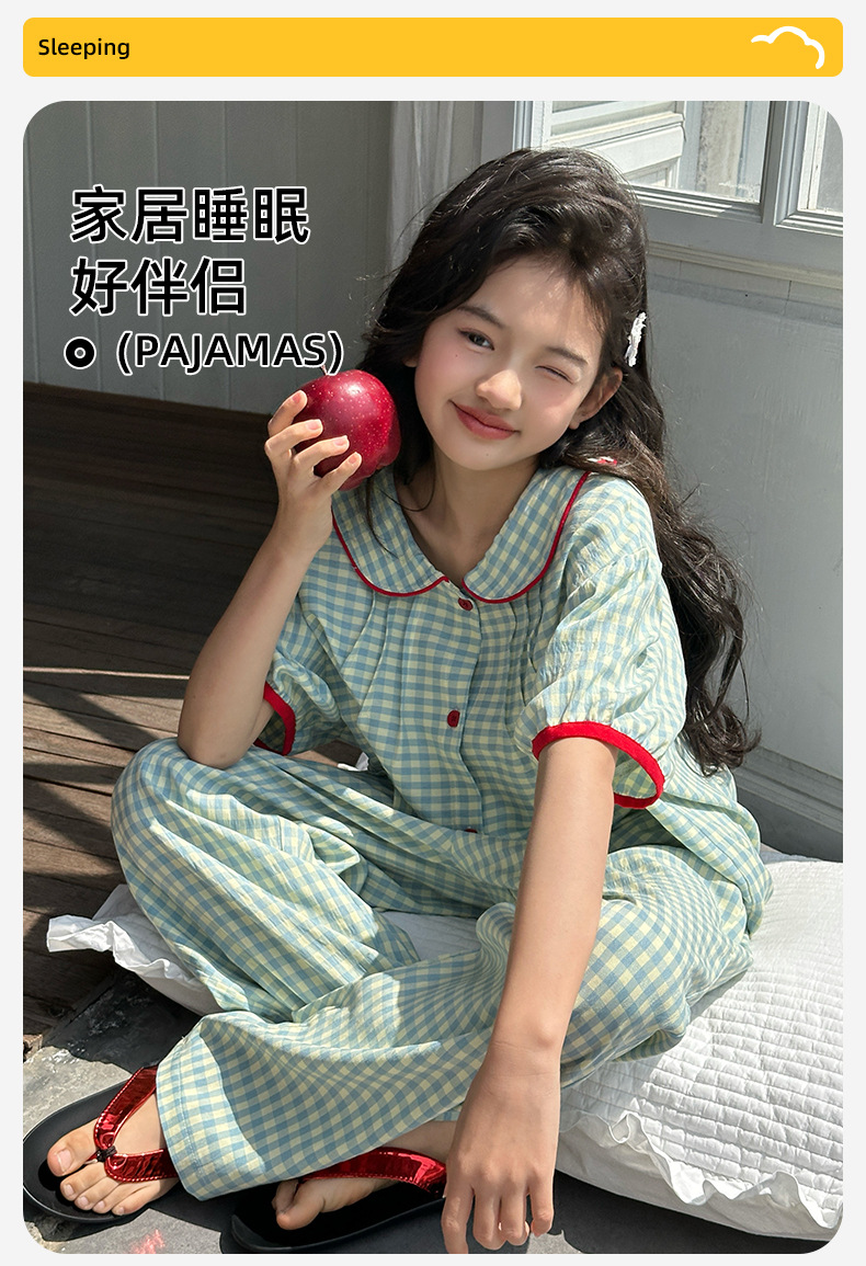 소녀 격자 무늬 잠옷 여름 2025 새로운 어린이 온라인 인기 외국식 홈 옷 3 피스 세트 큰 어린이 에어컨 옷스토어 가기