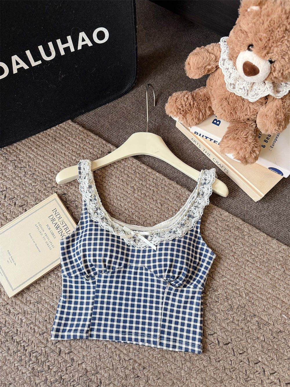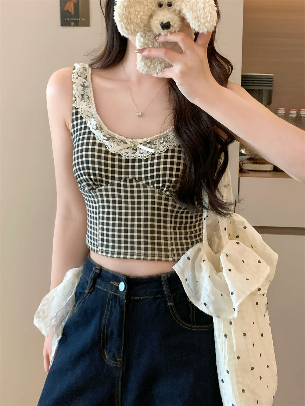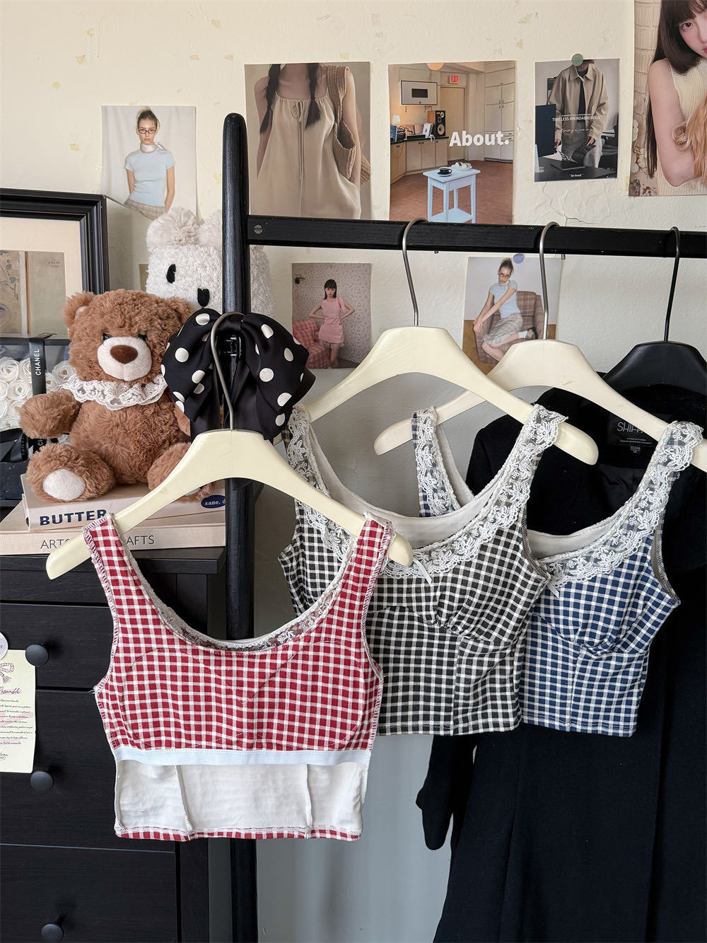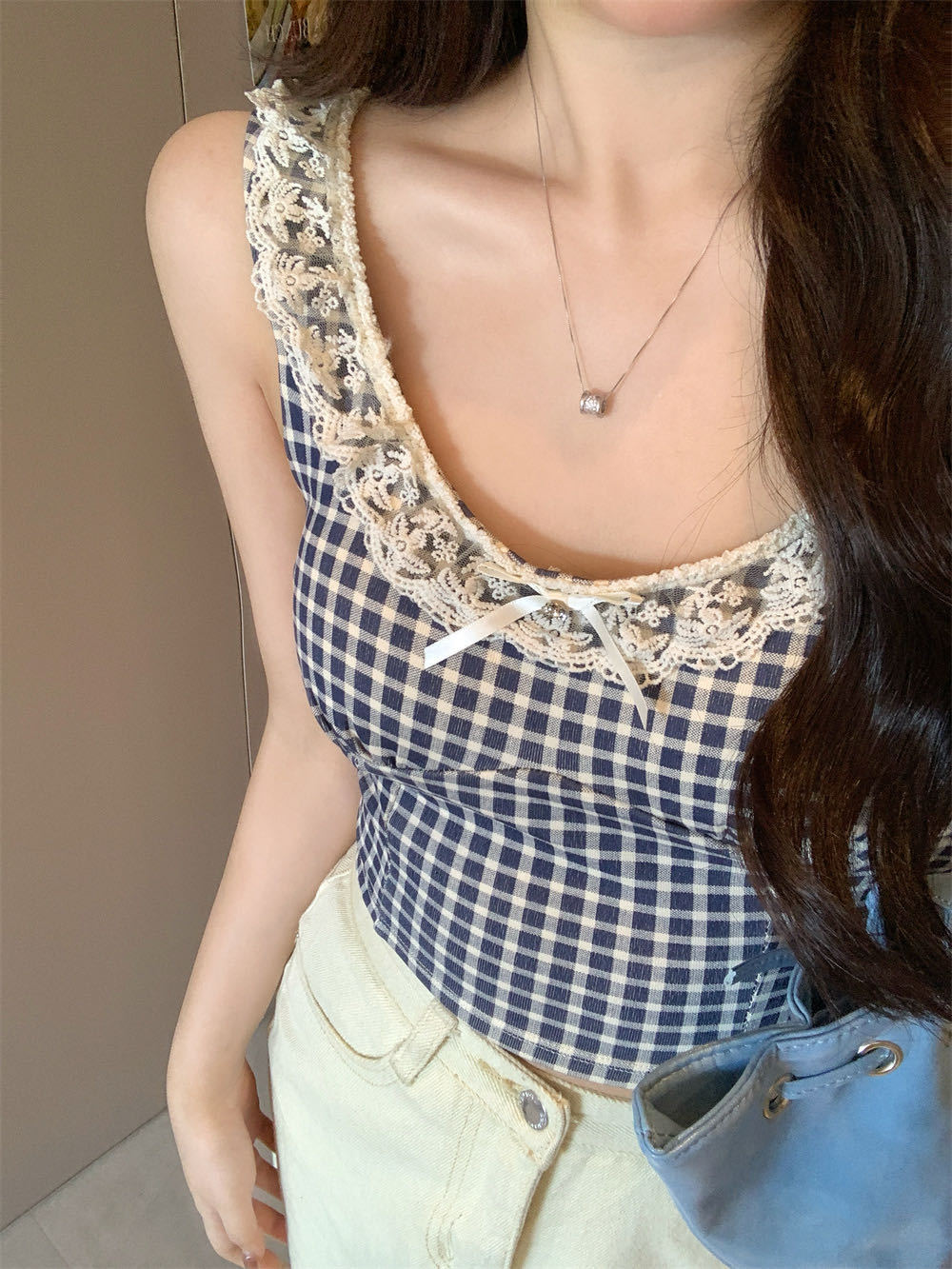 10103 # 레트로 가리 레이스 스티칭 활 작은 슬링 탑 여름 달콤한 격자 무늬 짧은 조끼