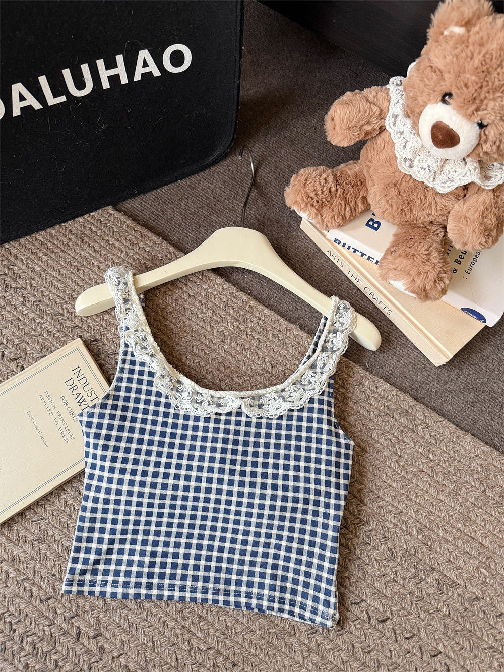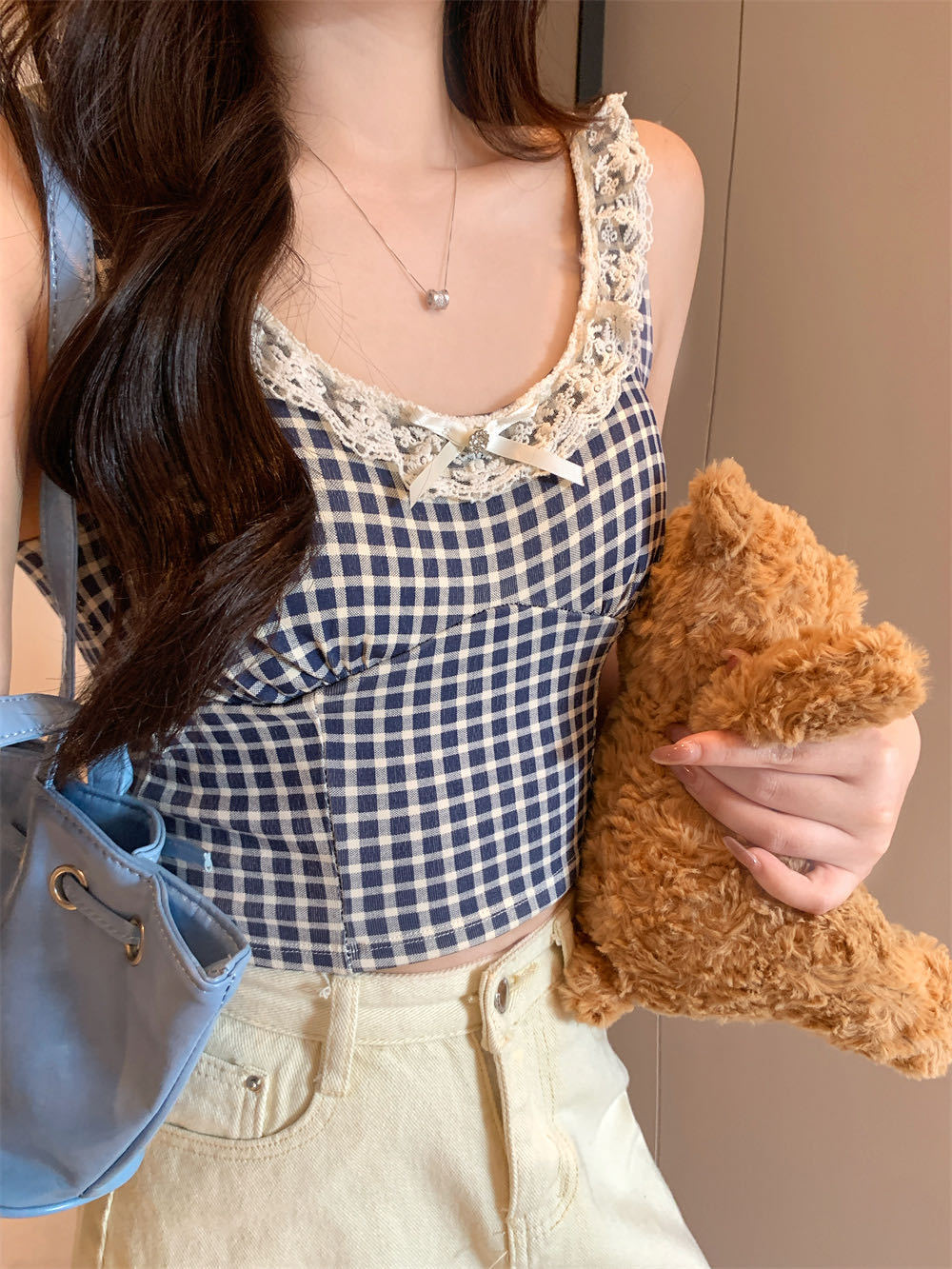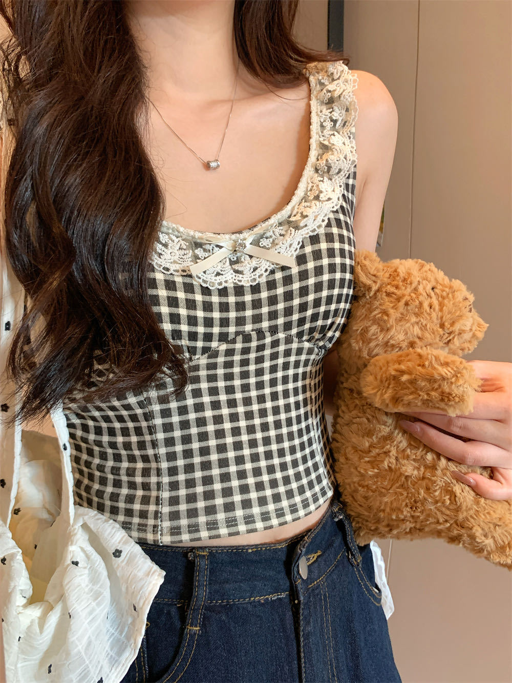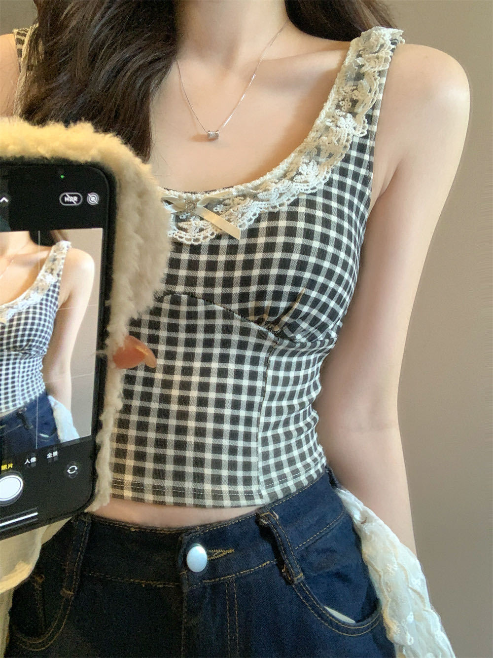 10103 # 레트로 가리 레이스 스티칭 활 작은 슬링 탑 여름 달콤한 격자 무늬 짧은 조끼