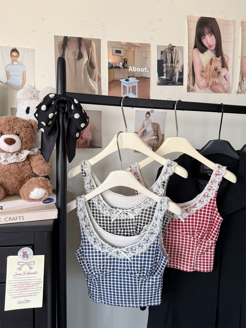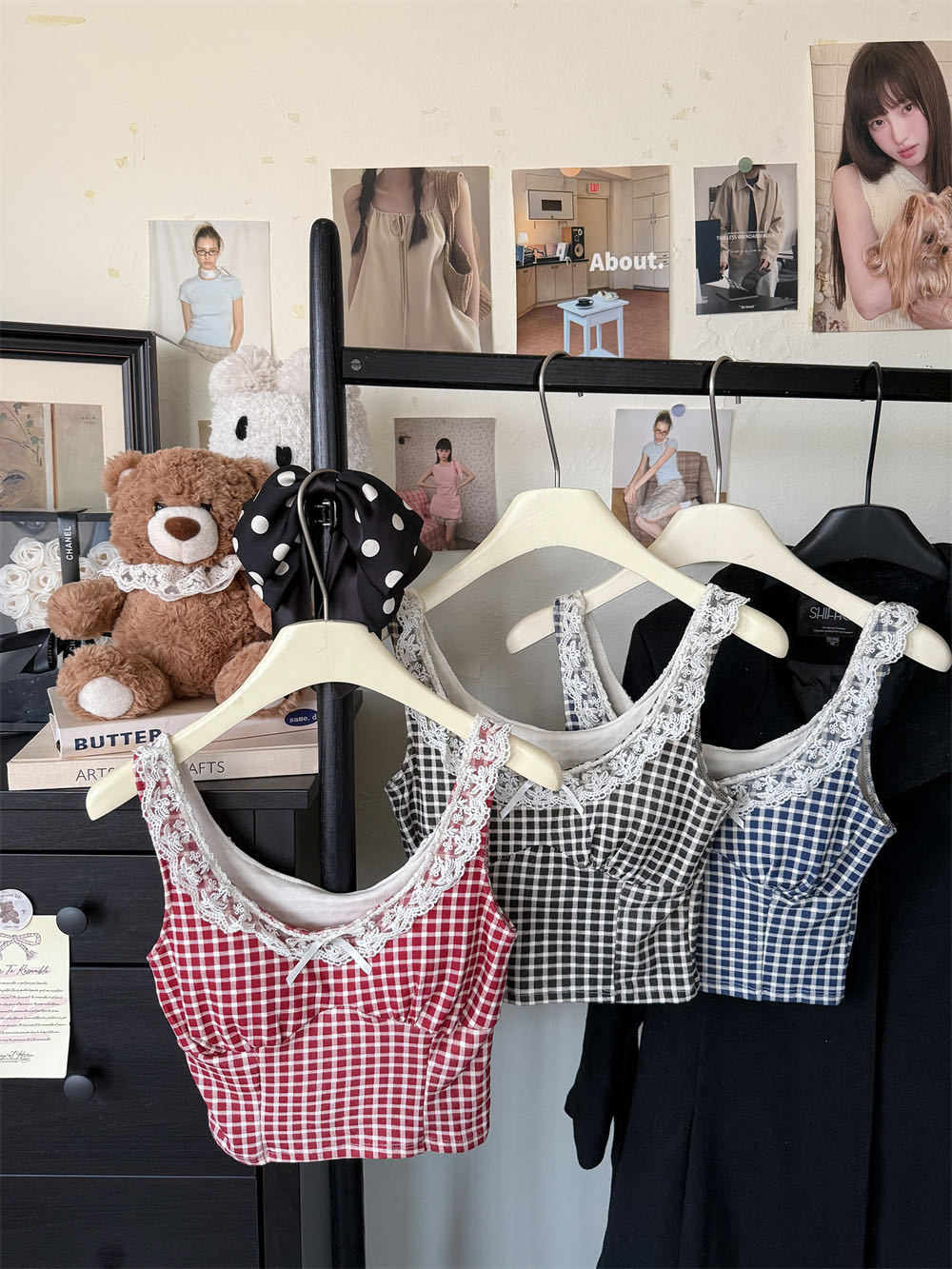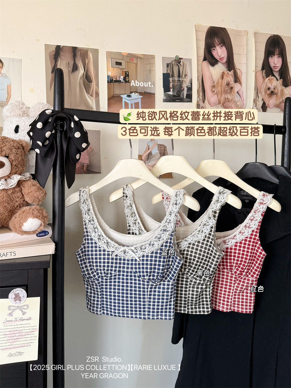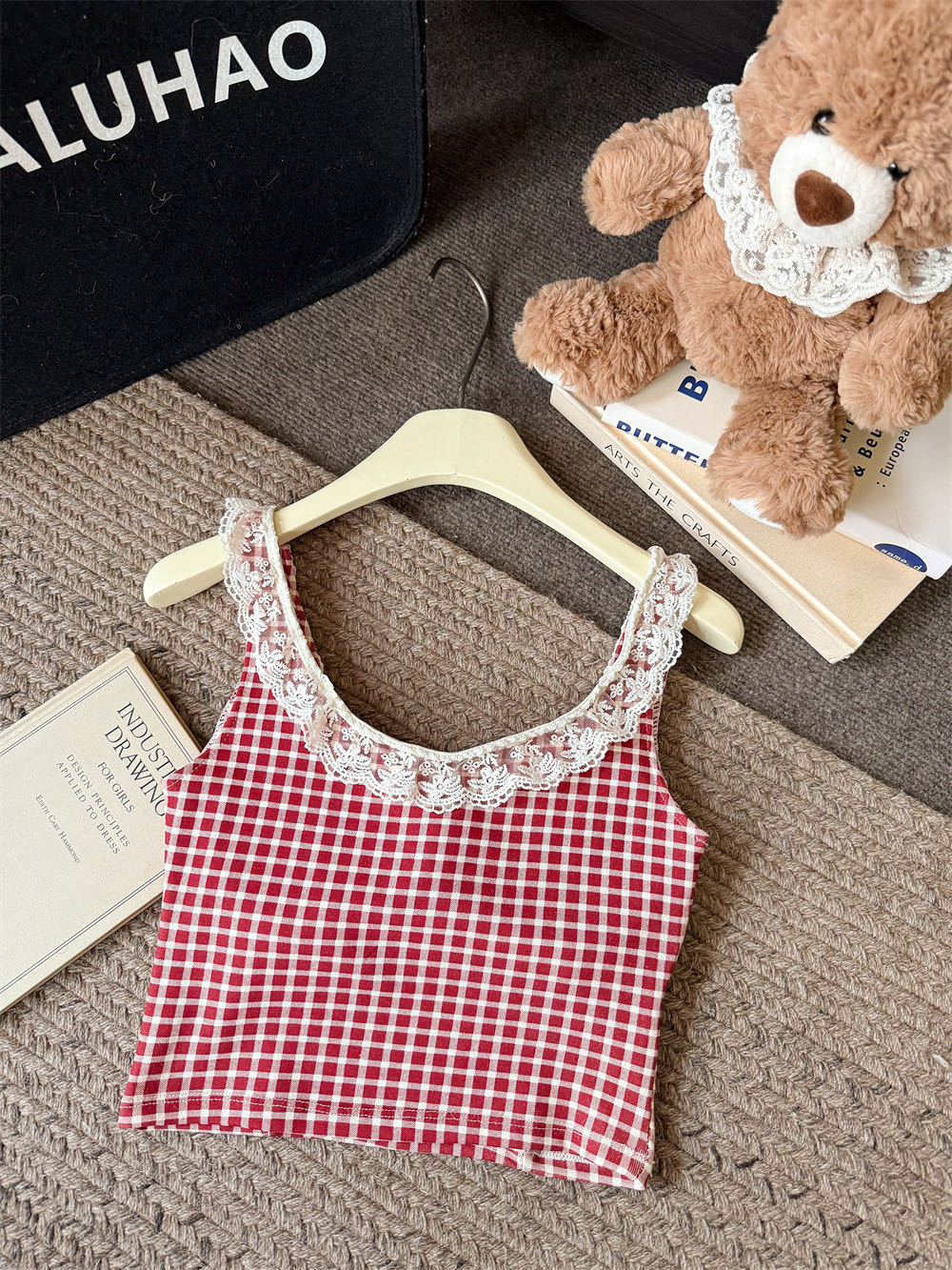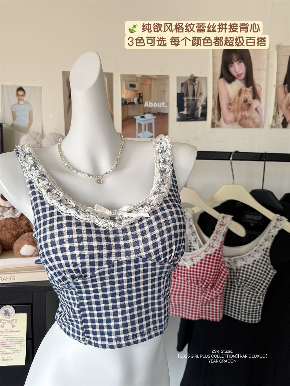 10103 # 레트로 가리 레이스 스티칭 활 작은 슬링 탑 여름 달콤한 격자 무늬 짧은 조끼