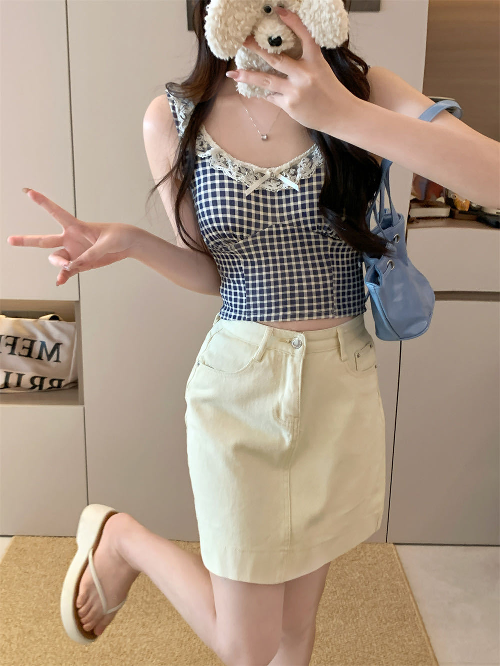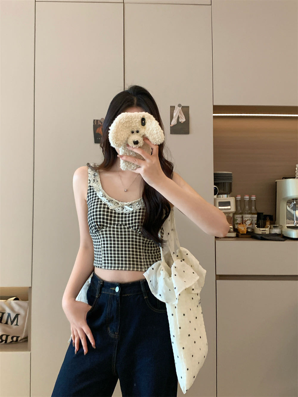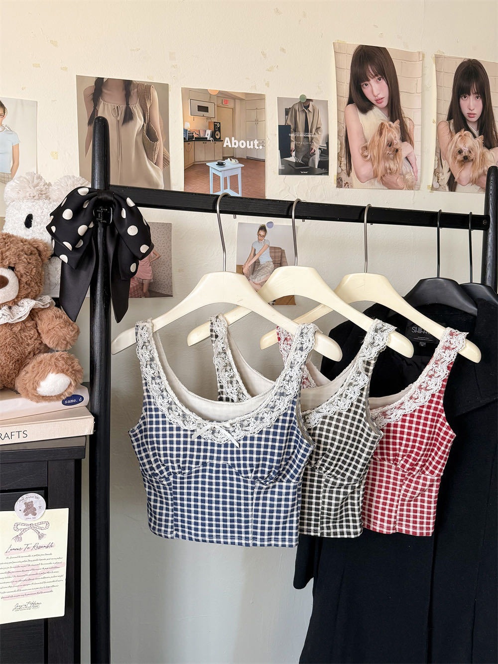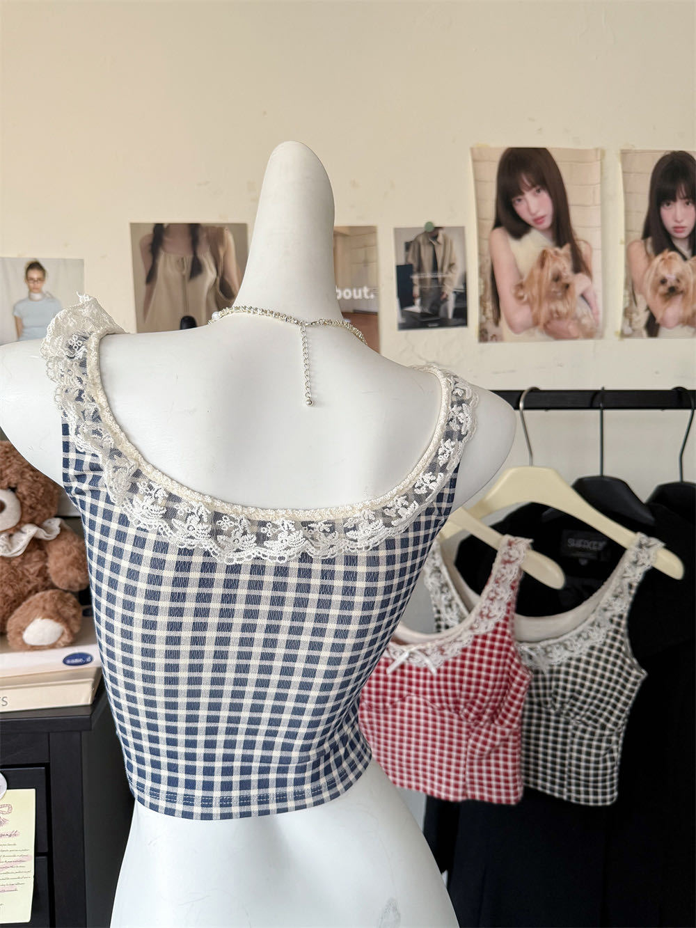 10103 # 레트로 가리 레이스 스티칭 활 작은 슬링 탑 여름 달콤한 격자 무늬 짧은 조끼