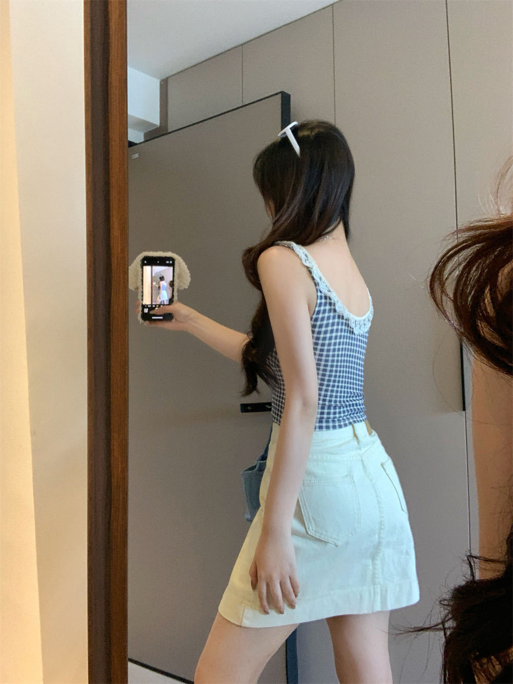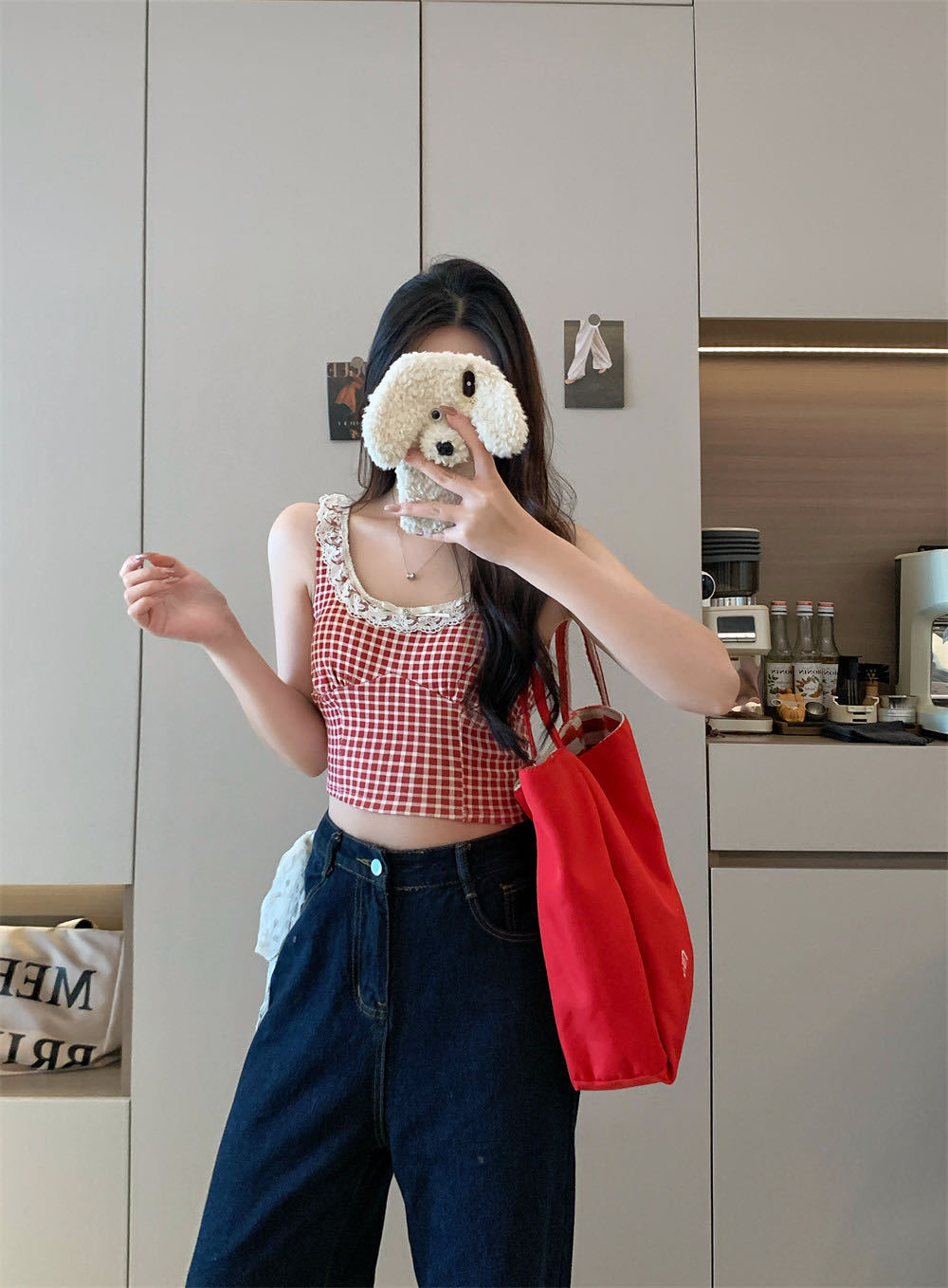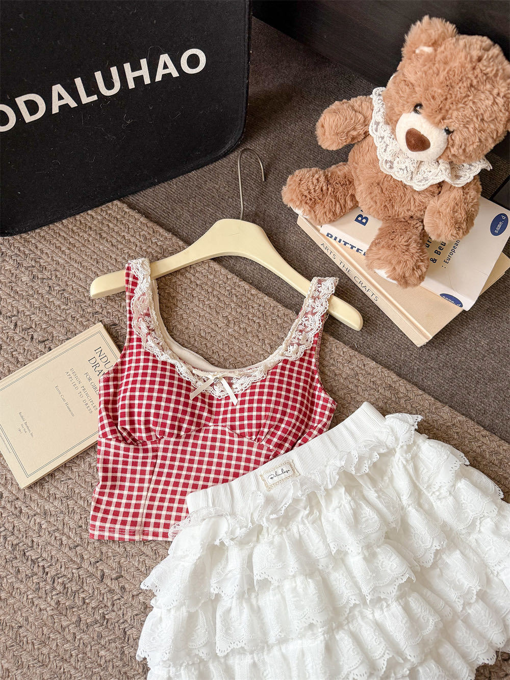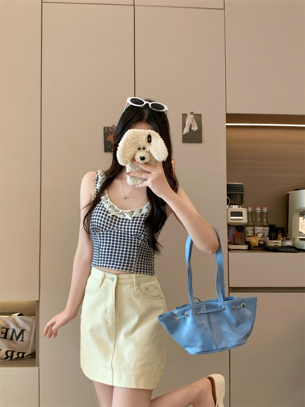 10103 # 레트로 가리 레이스 스티칭 활 작은 슬링 탑 여름 달콤한 격자 무늬 짧은 조끼