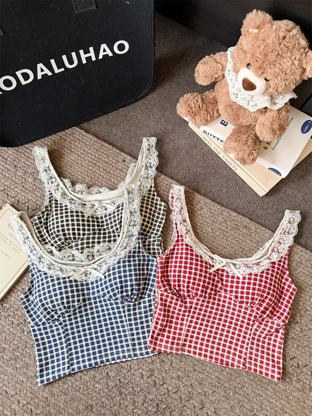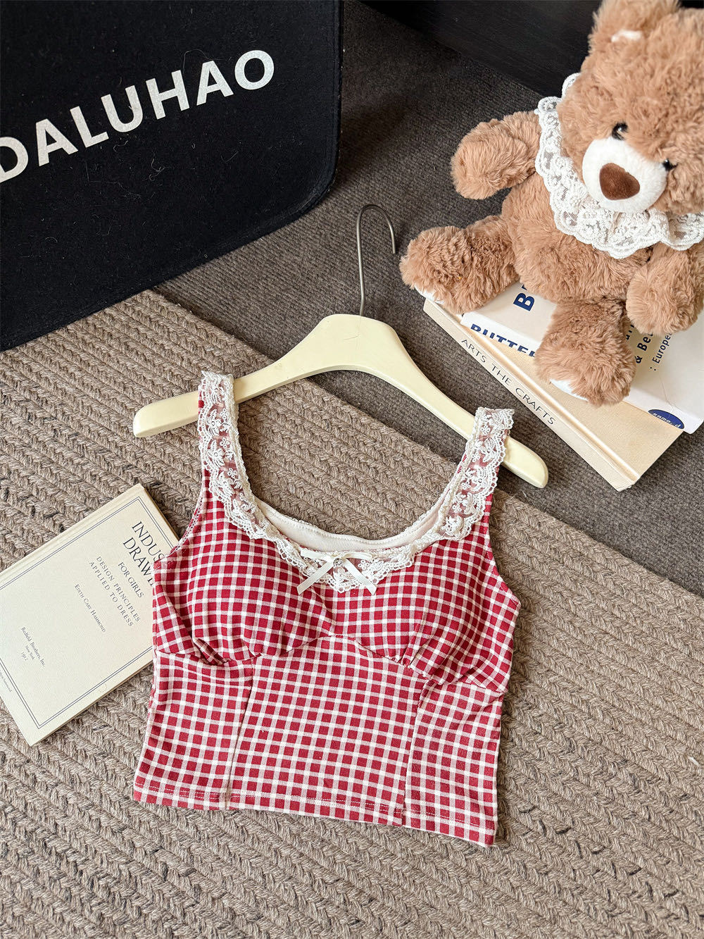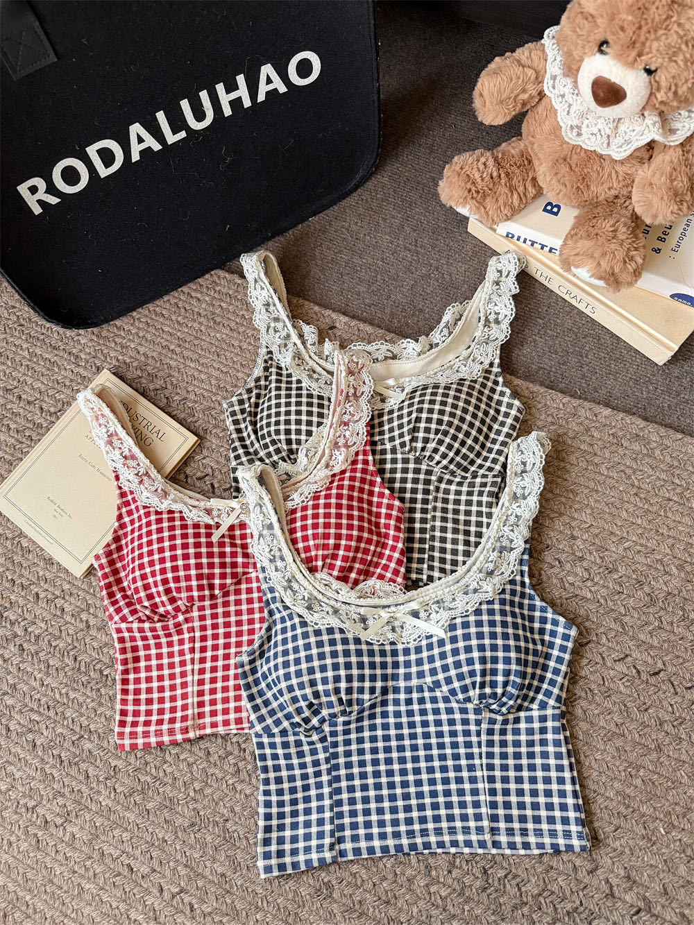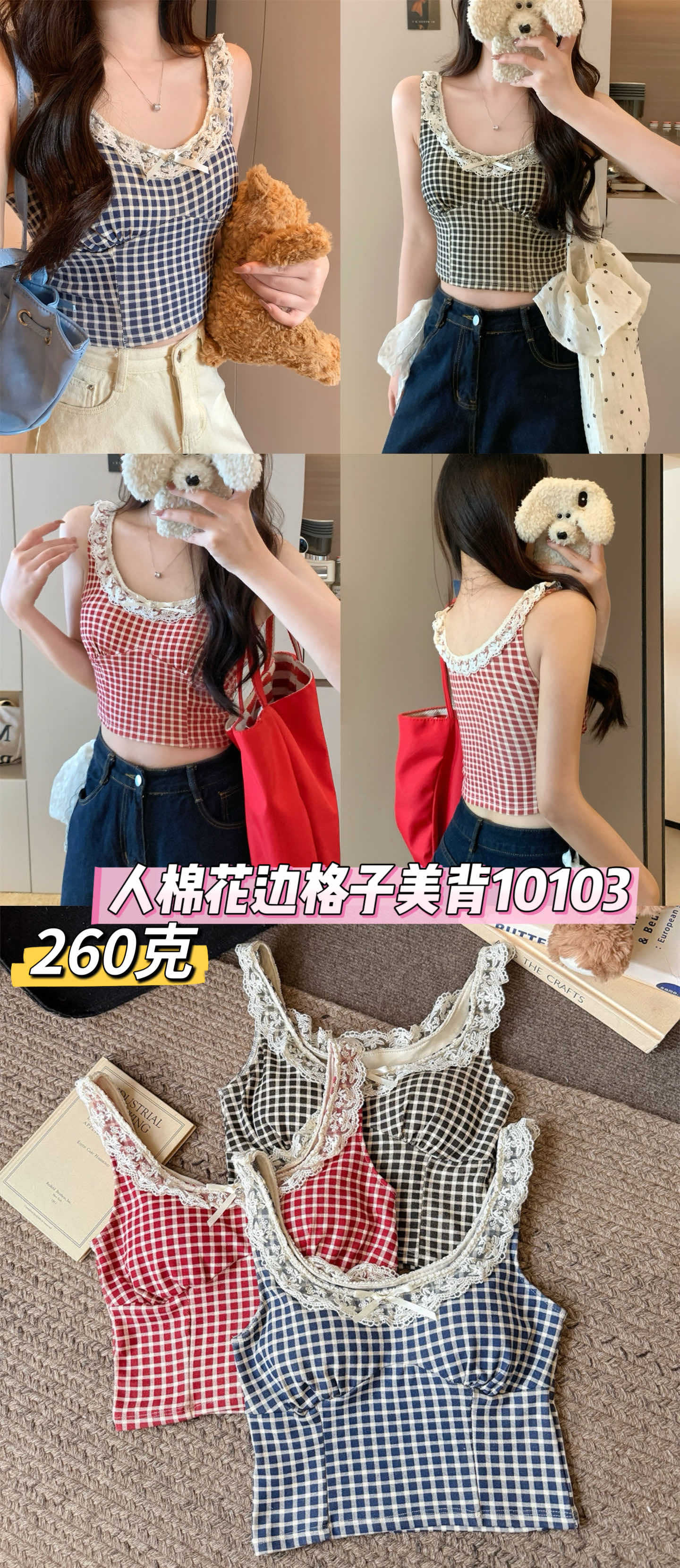 10103 # 레트로 가리 레이스 스티칭 활 작은 슬링 탑 여름 달콤한 격자 무늬 짧은 조끼스토어 가기