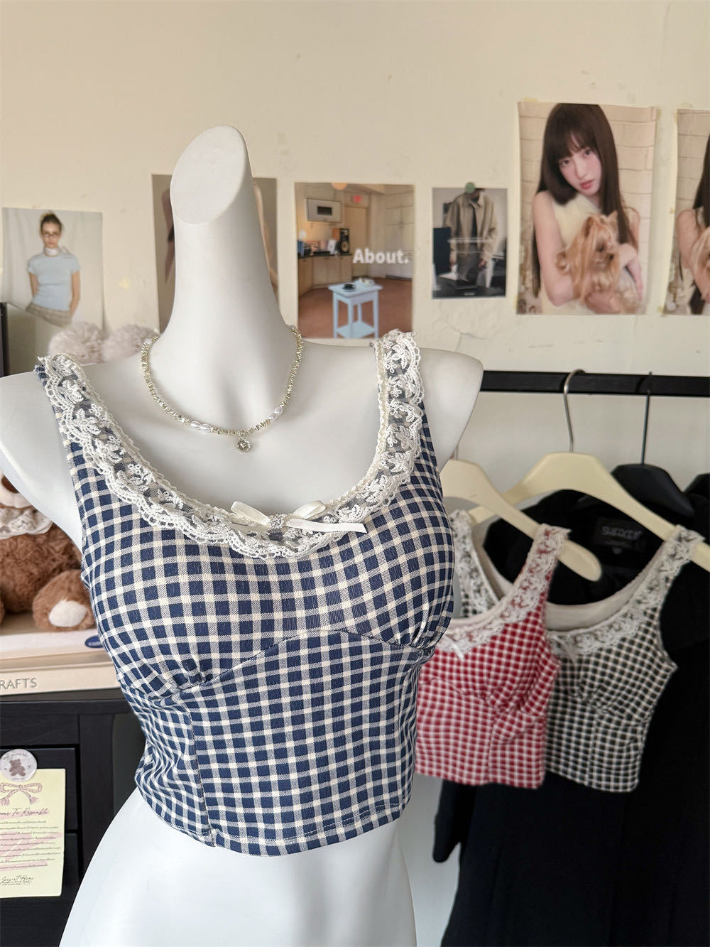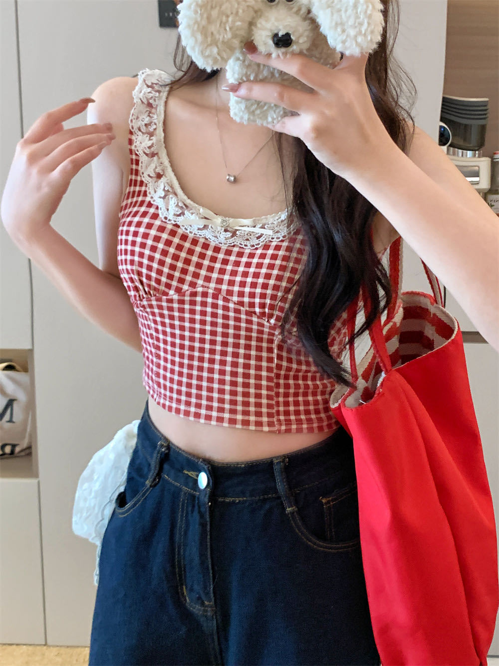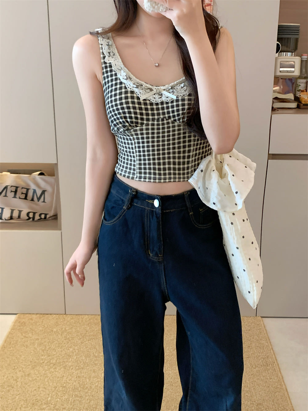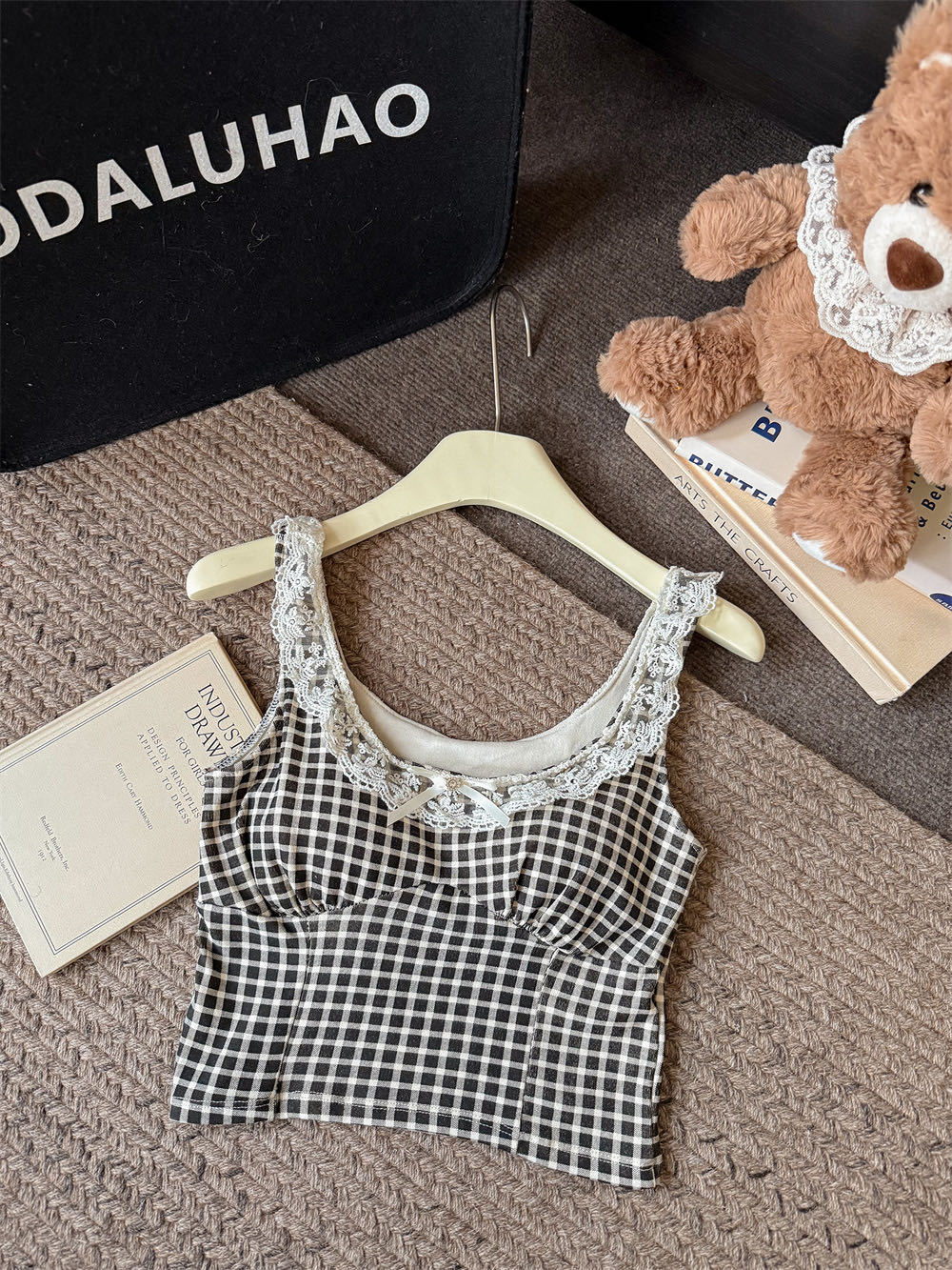 10103 # 레트로 가리 레이스 스티칭 활 작은 슬링 탑 여름 달콤한 격자 무늬 짧은 조끼스토어 가기