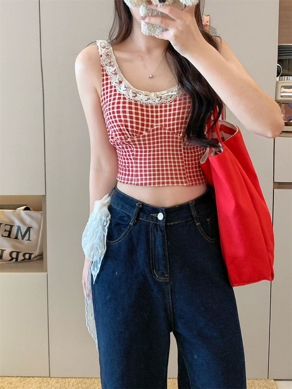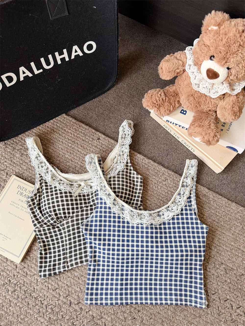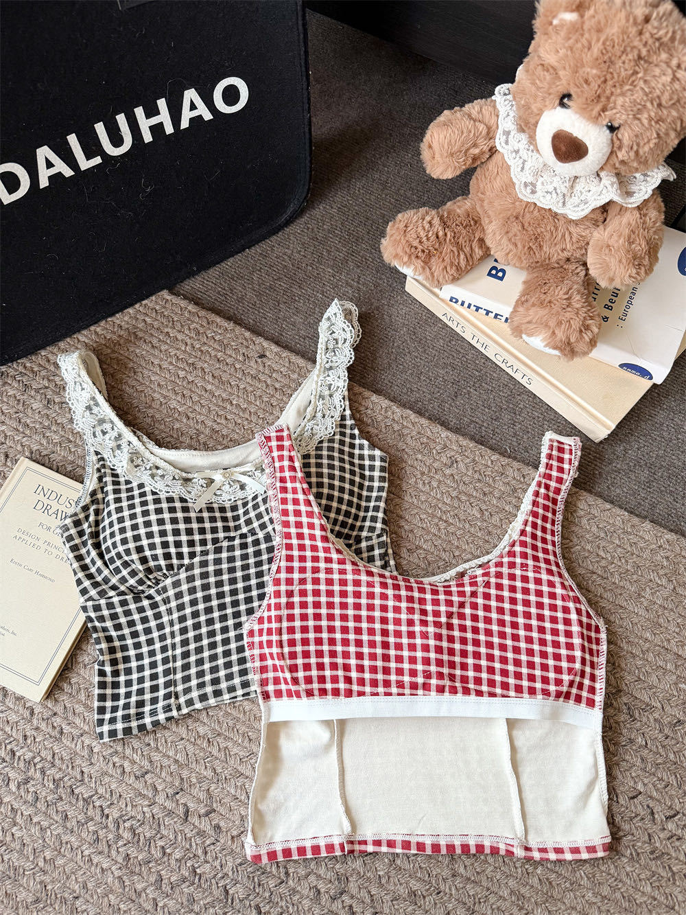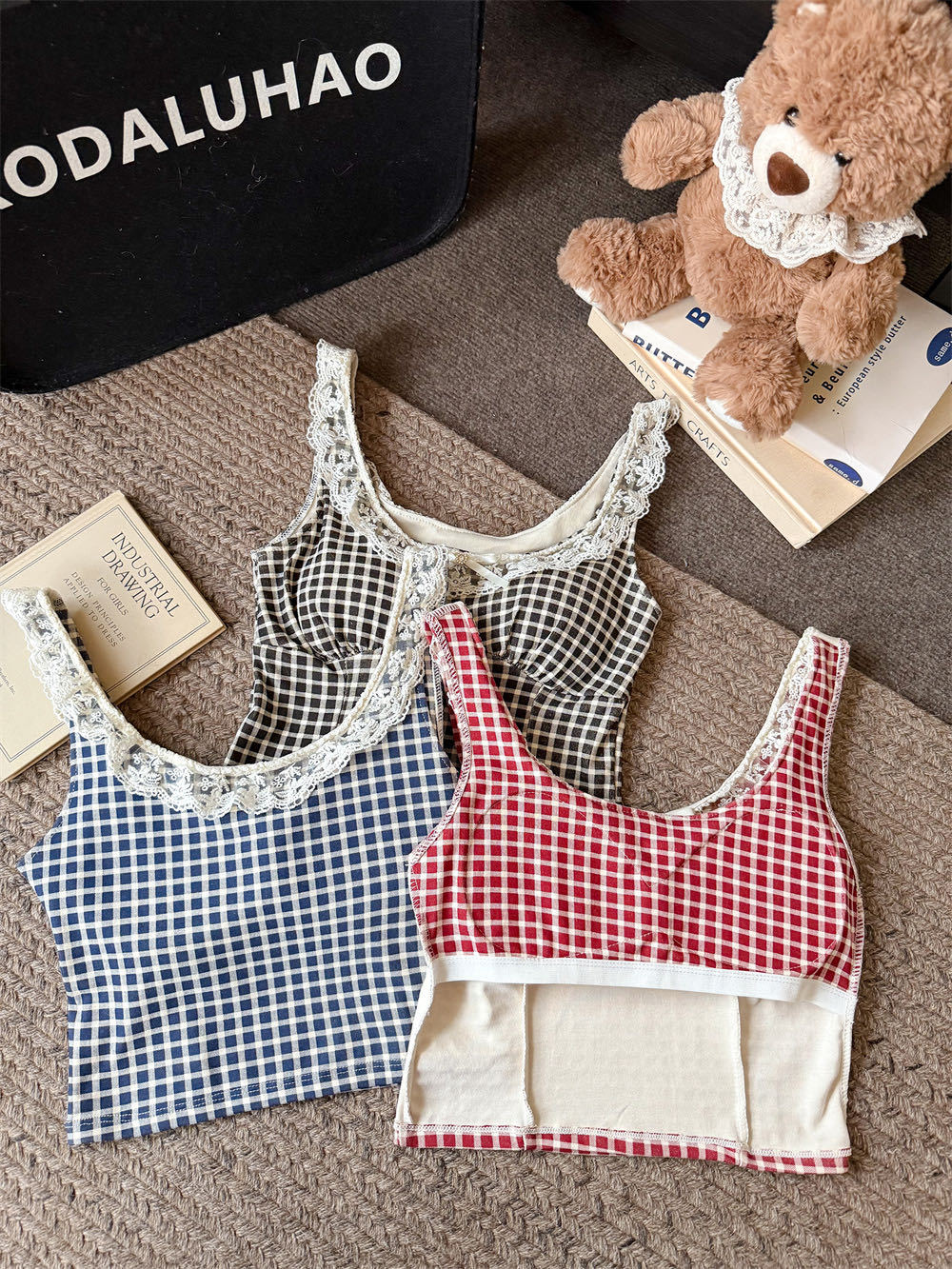 10103 # 레트로 가리 레이스 스티칭 활 작은 슬링 탑 여름 달콤한 격자 무늬 짧은 조끼스토어 가기