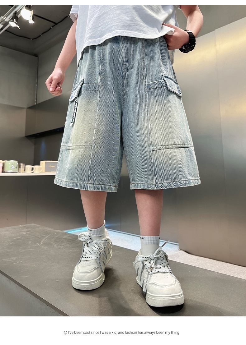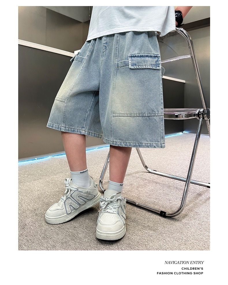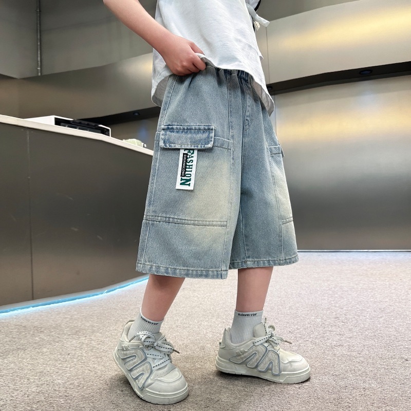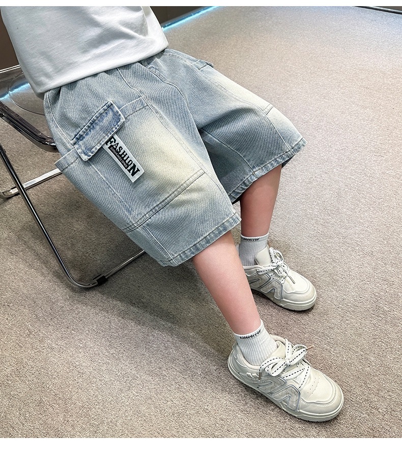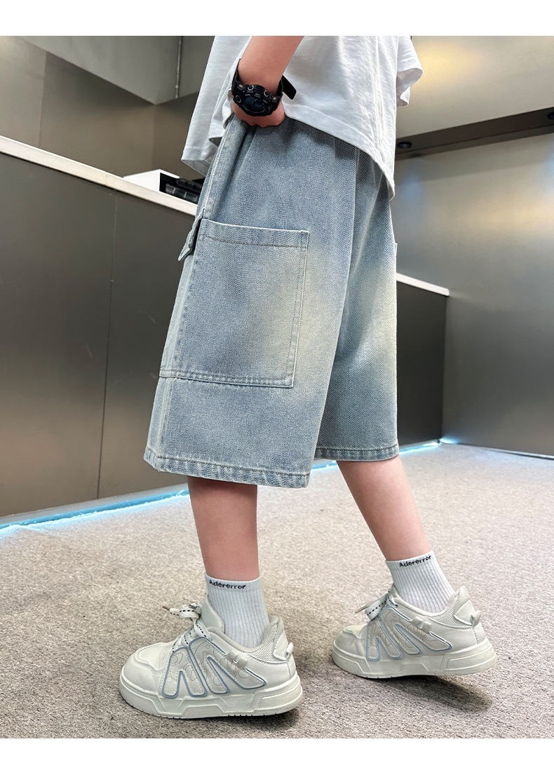 소년 블루 툴링 데님 바지 2025 새로운 어린이 5 점 바지 어린이 소년 느슨한 5 점 바지스토어 가기