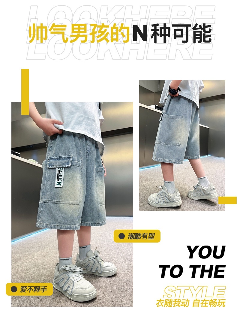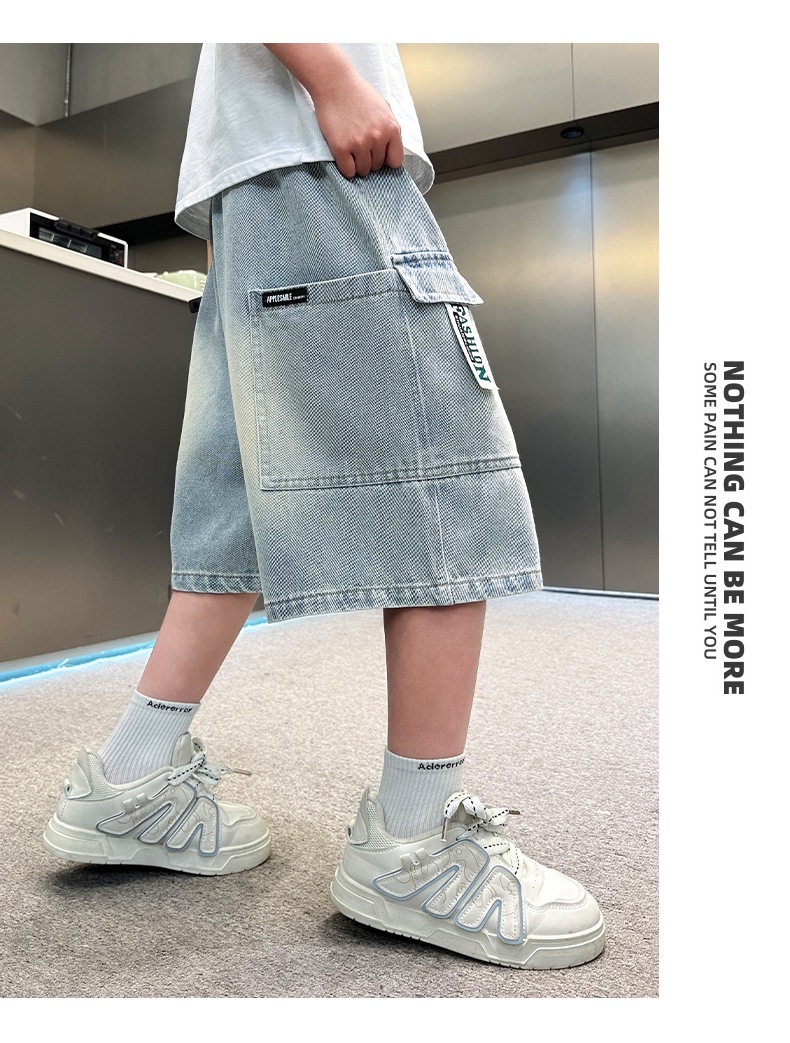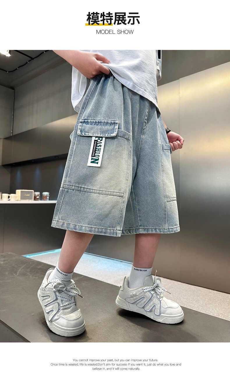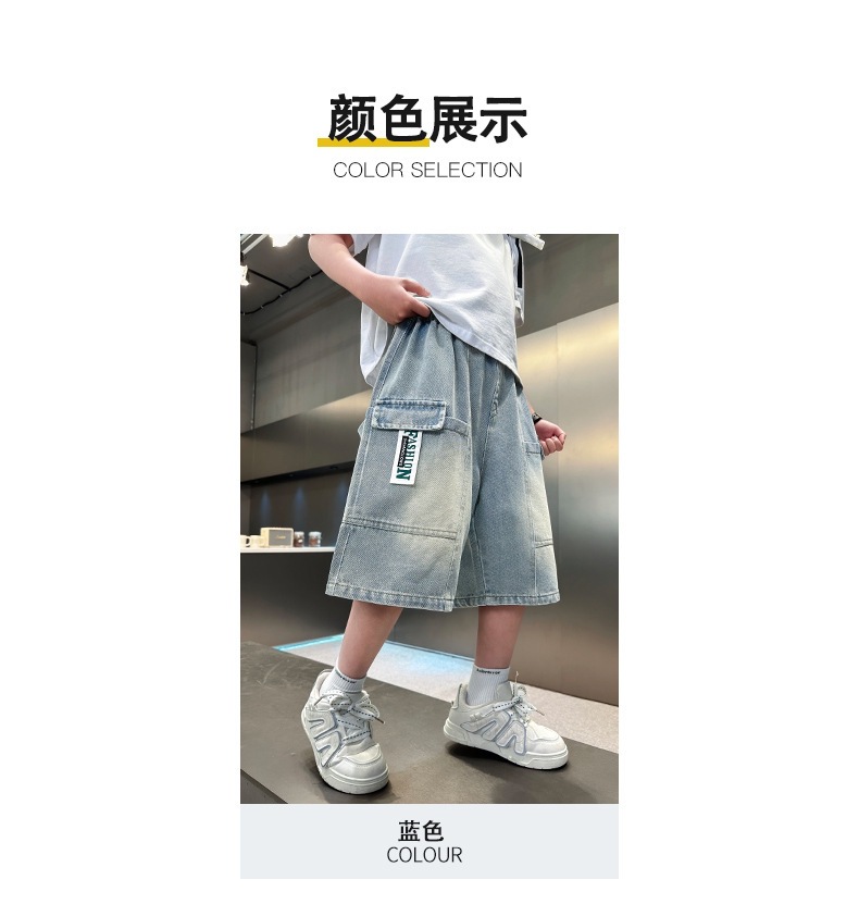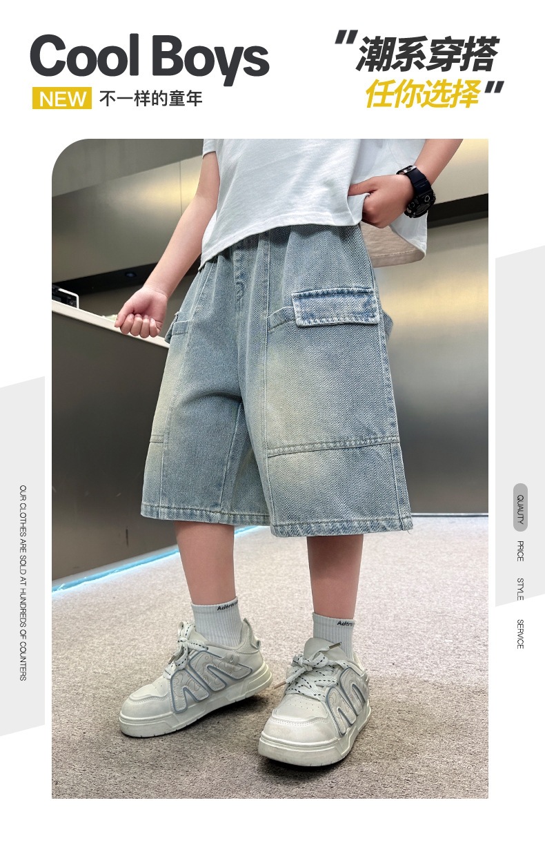 소년 블루 툴링 데님 바지 2025 새로운 어린이 5 점 바지 어린이 소년 느슨한 5 점 바지스토어 가기