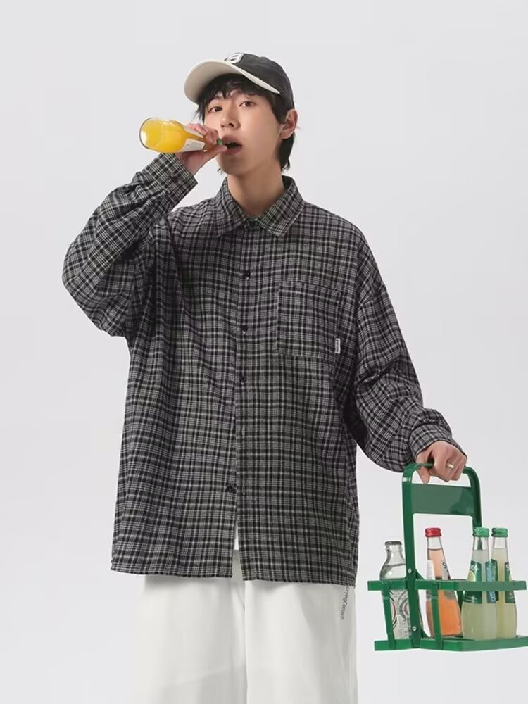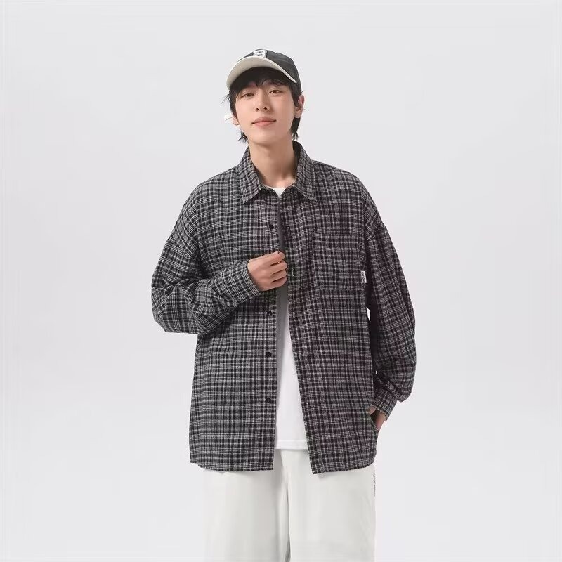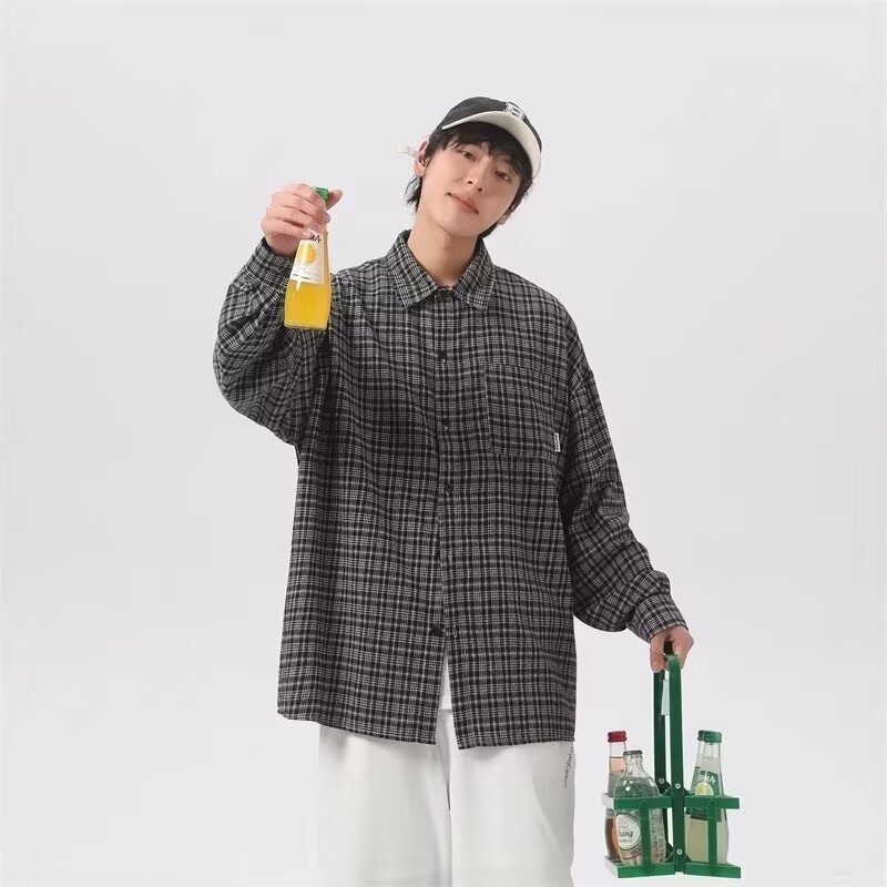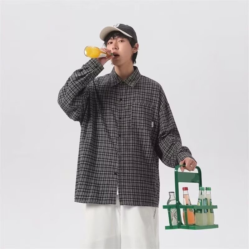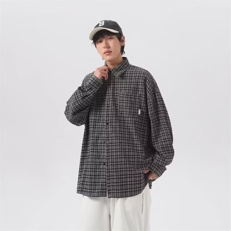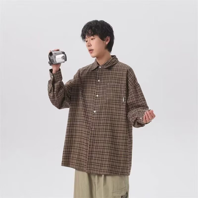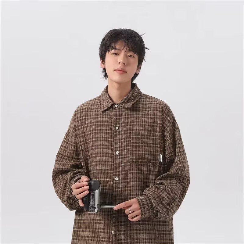 일본 거리 격자 무늬 색상 대비 느슨한 긴 소매 셔츠 남성과 여성을위한 레트로 느슨한 Bf 스타일 커플 캐주얼 재킷 트렌디 브랜드스토어 가기