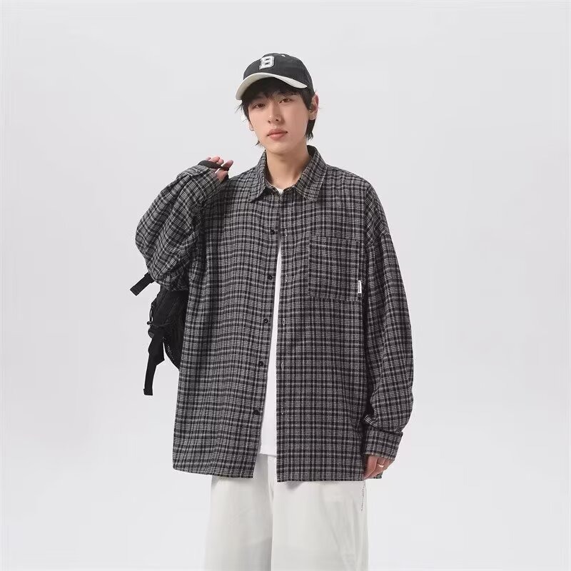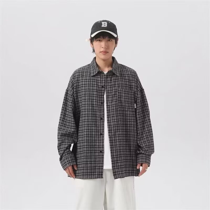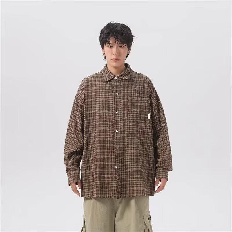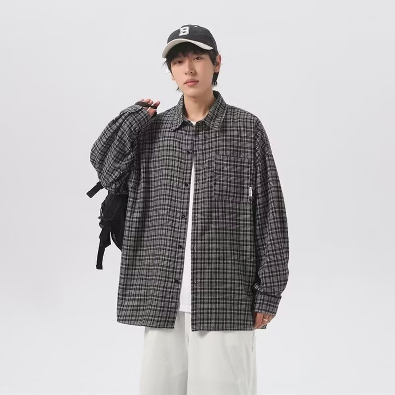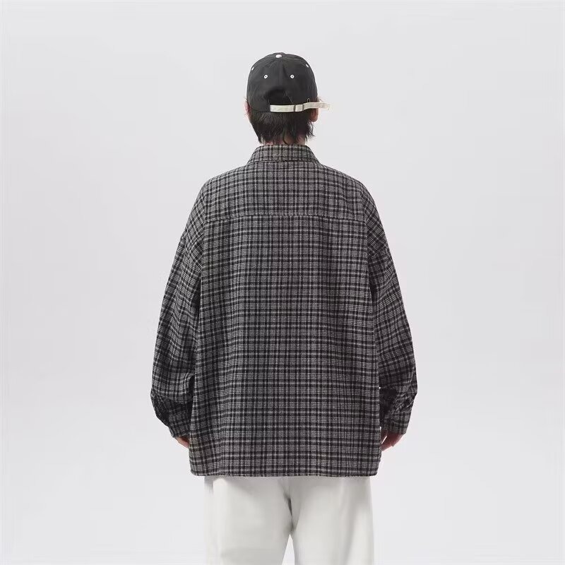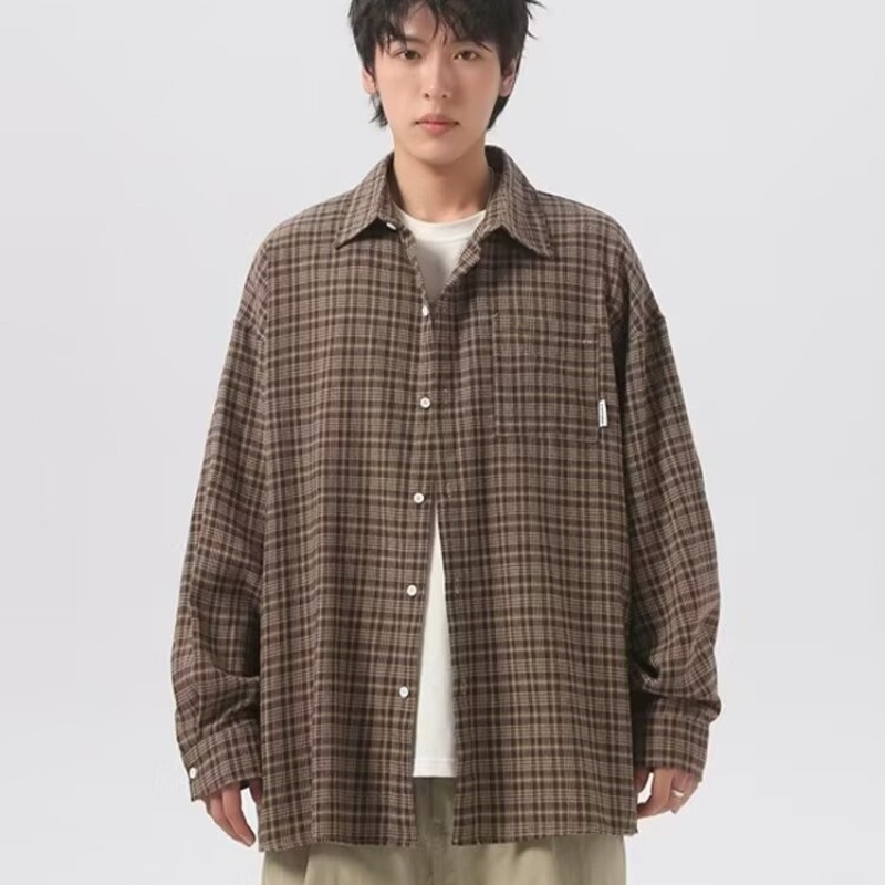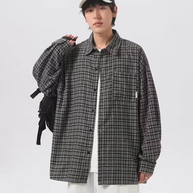 일본 거리 격자 무늬 색상 대비 느슨한 긴 소매 셔츠 남성과 여성을위한 레트로 느슨한 Bf 스타일 커플 캐주얼 재킷 트렌디 브랜드스토어 가기