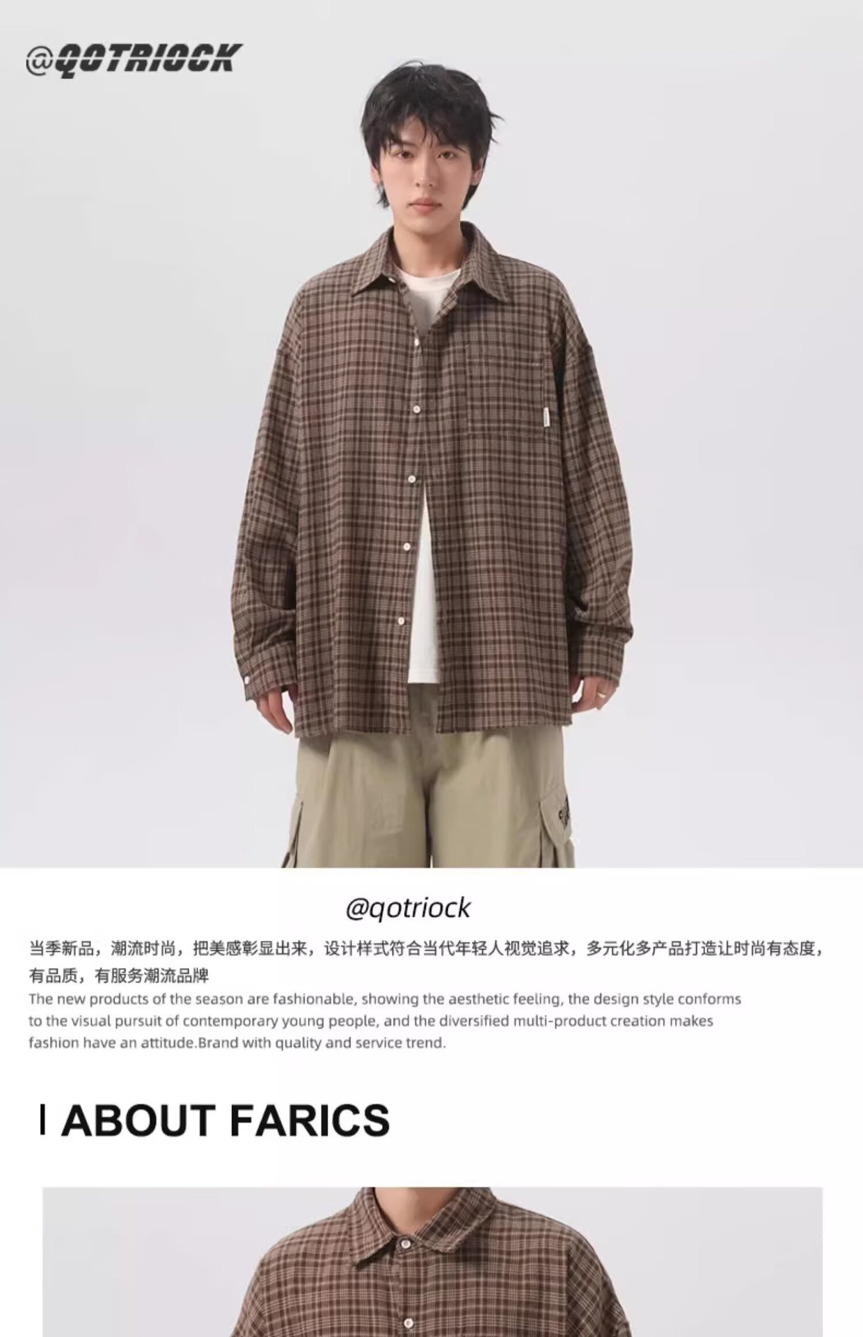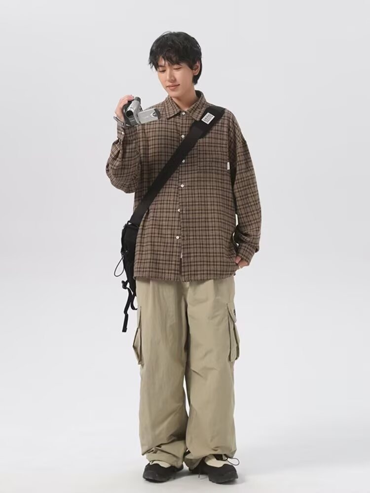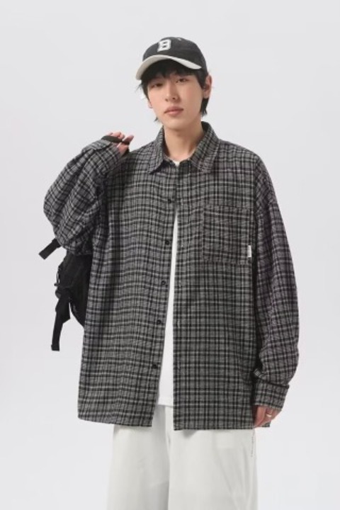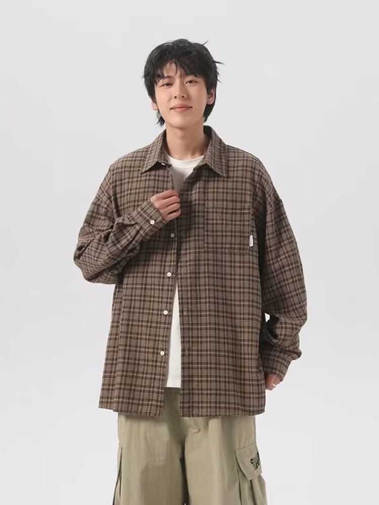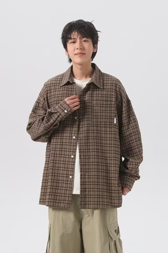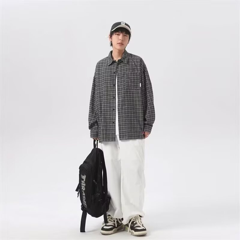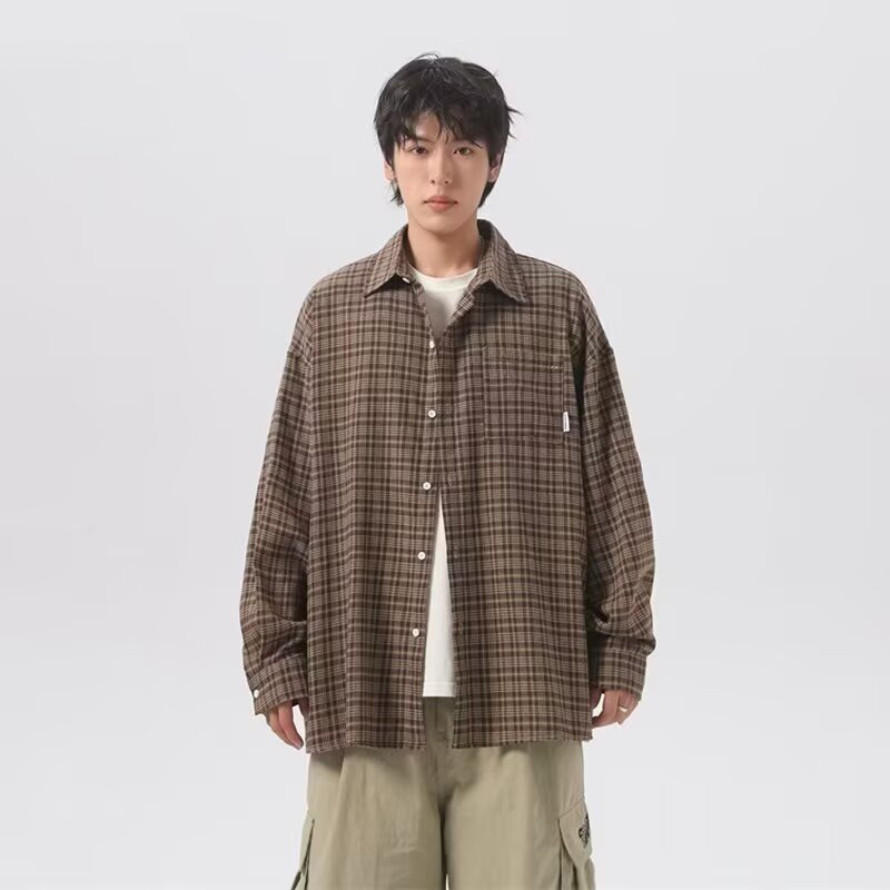일본 거리 격자 무늬 색상 대비 느슨한 긴 소매 셔츠 남성과 여성을위한 레트로 느슨한 Bf 스타일 커플 캐주얼 재킷 트렌디 브랜드스토어 가기