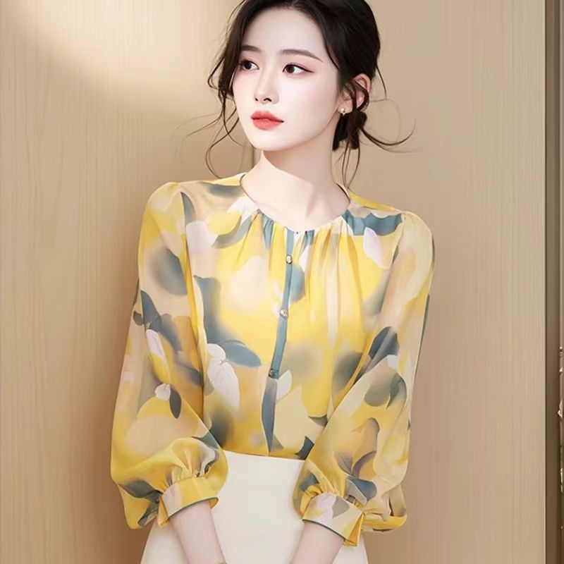 프랑스 꽃 쉬폰 셔츠 7 점 소매 초가을 2025 새로운 아름다운 느슨한 슬림 모양 서양식 작은 셔츠