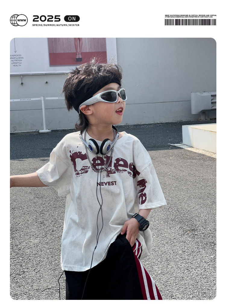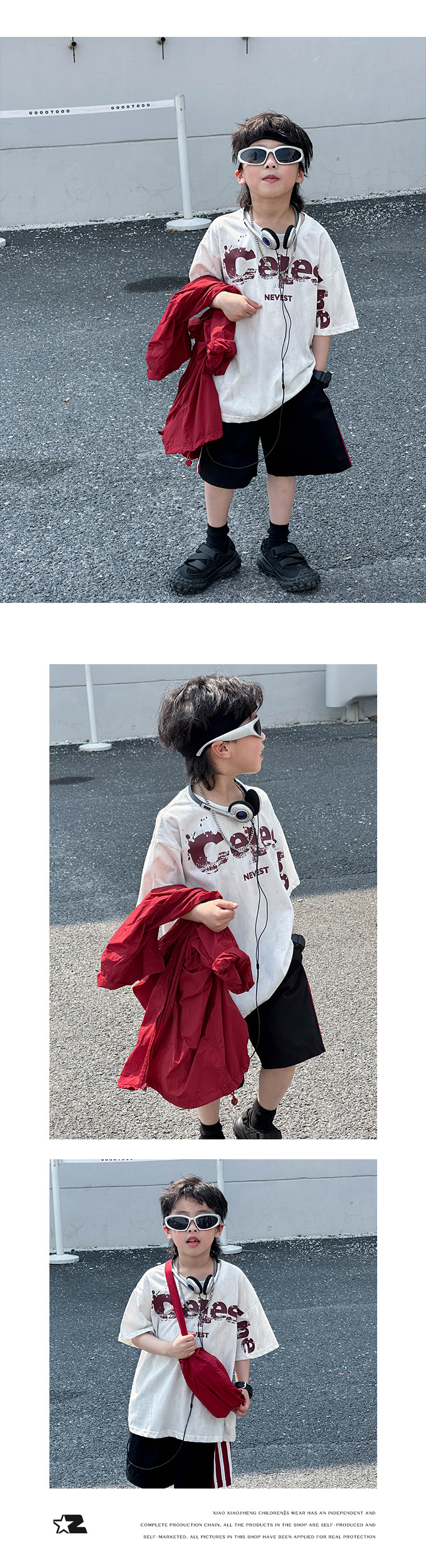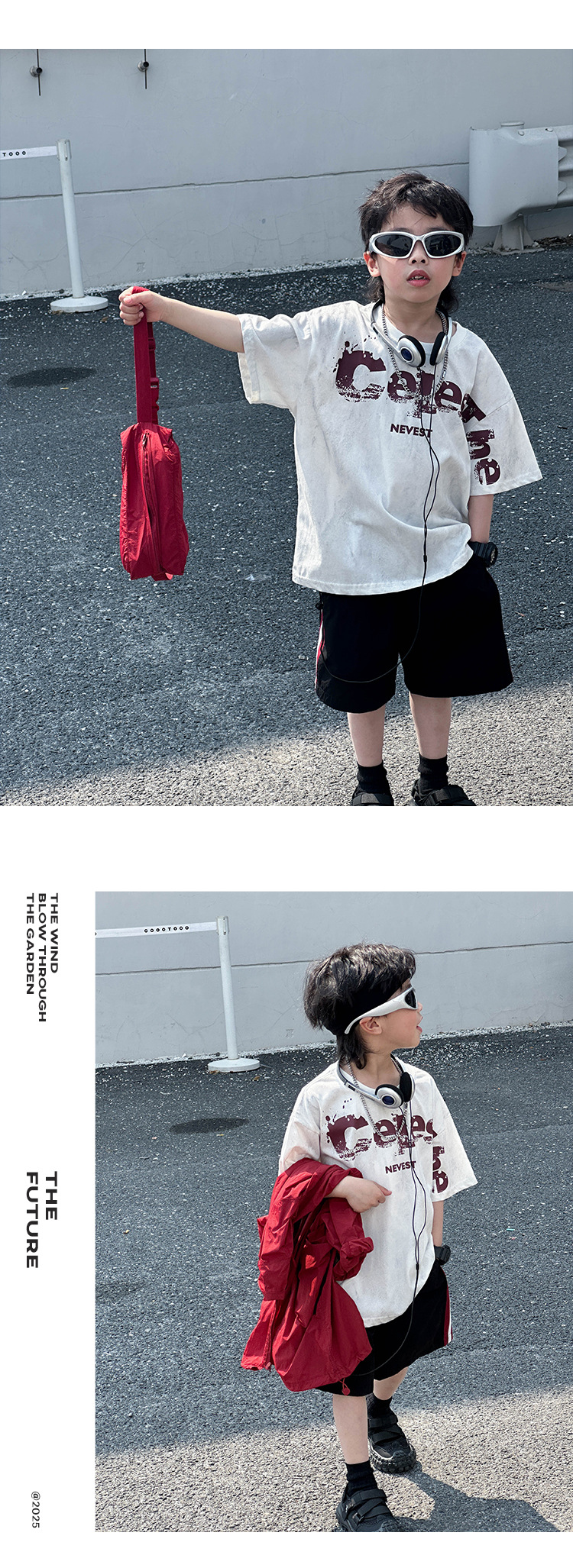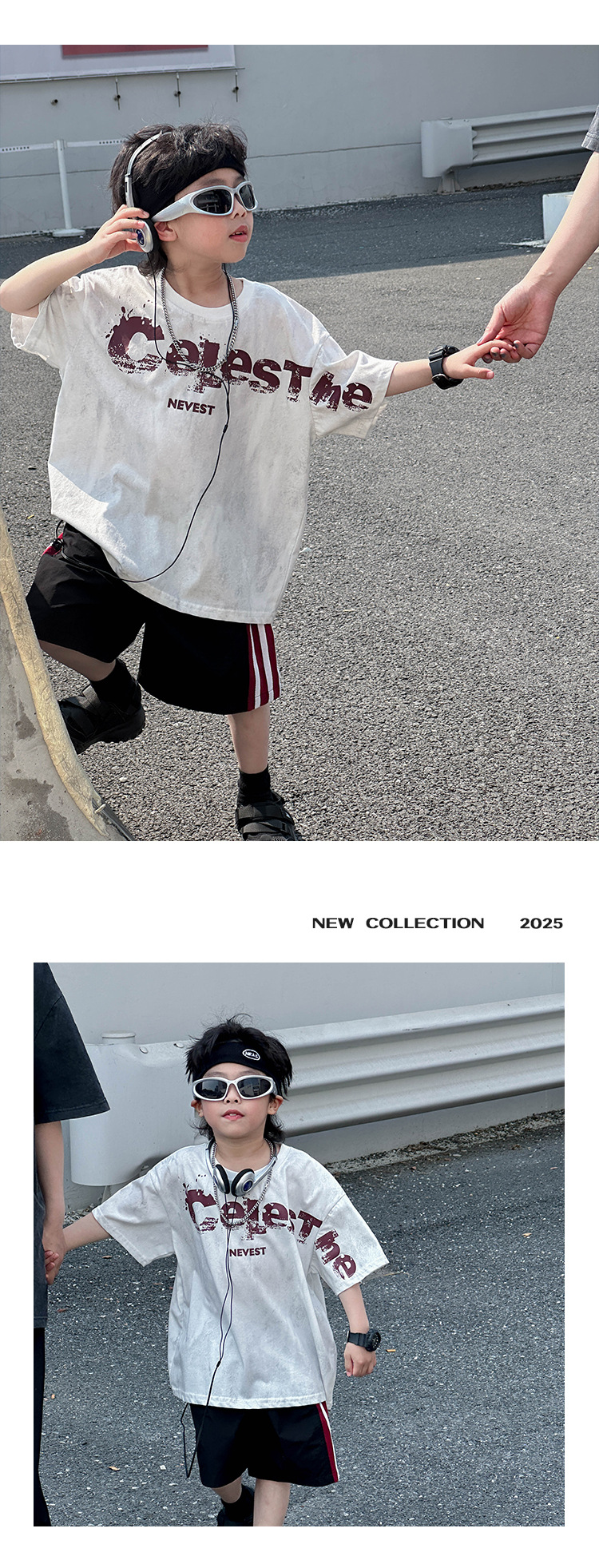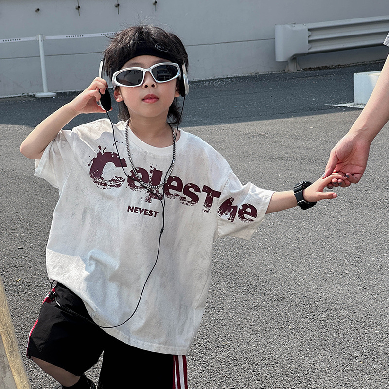 남학생 올매치 티셔츠 2025 년 여름 새 어린이 한국식 편지 인쇄 탑 어린이 느슨한 여름 패션