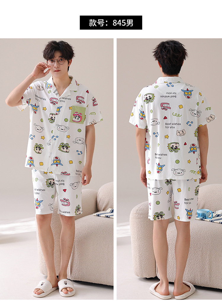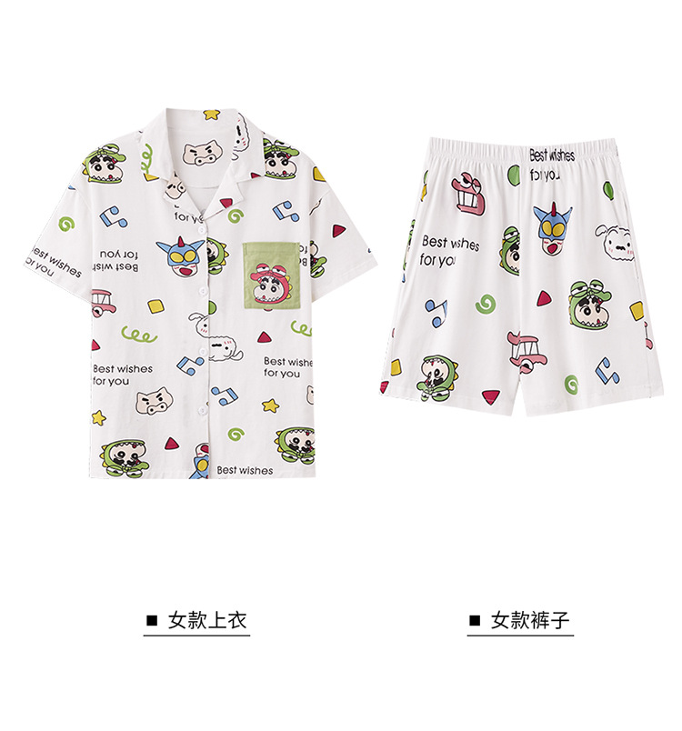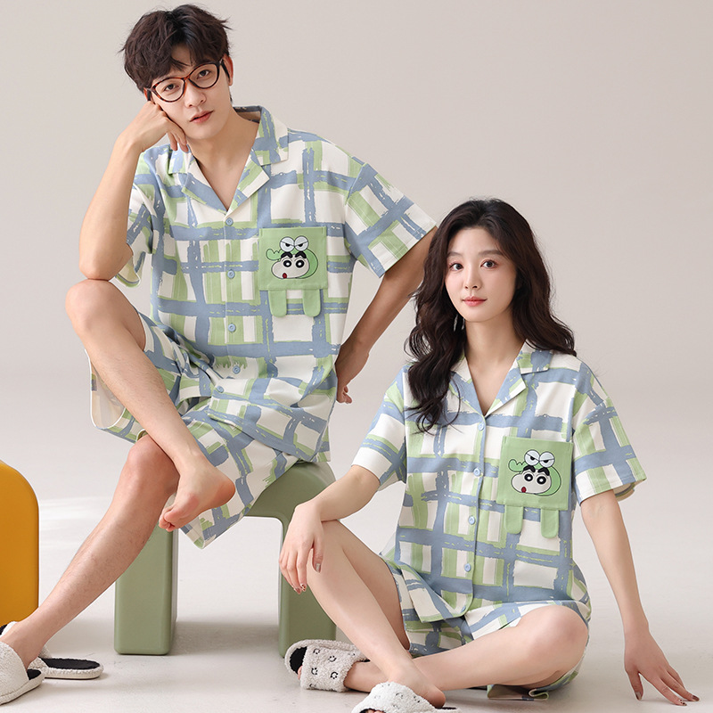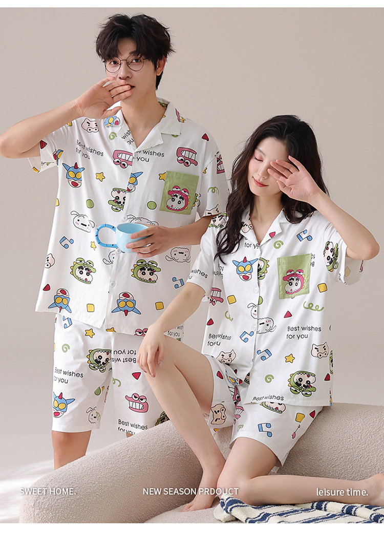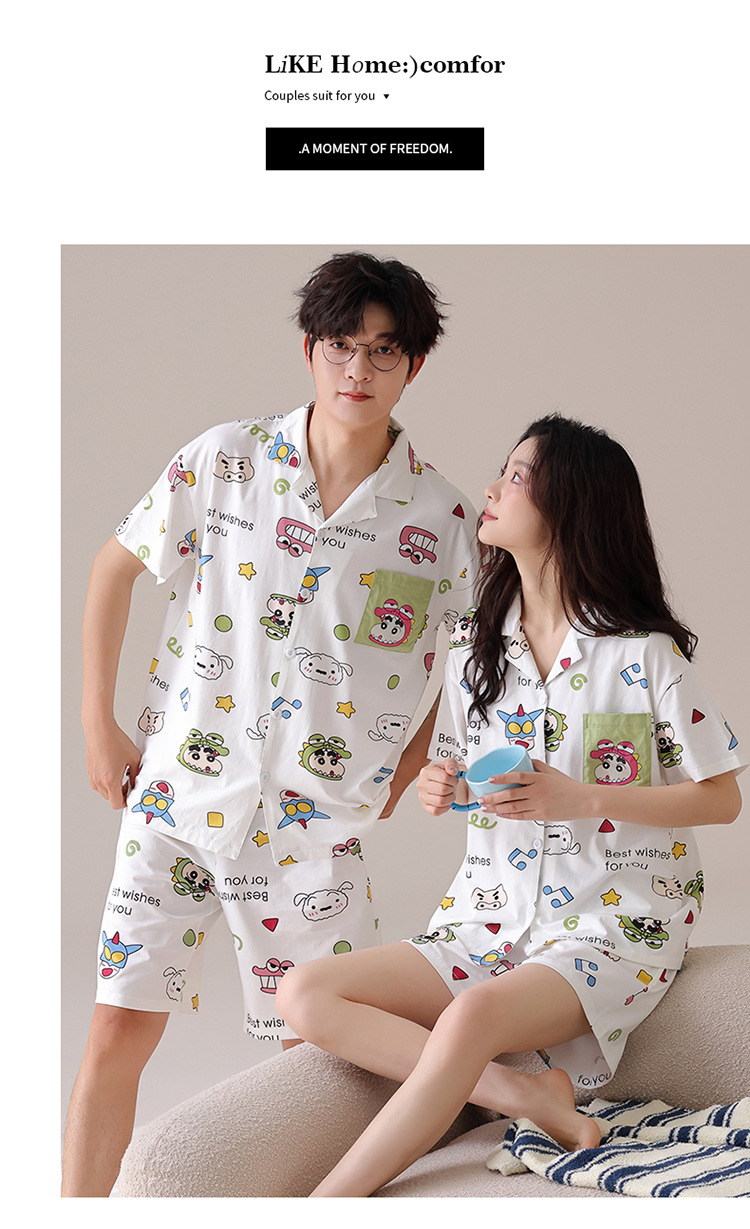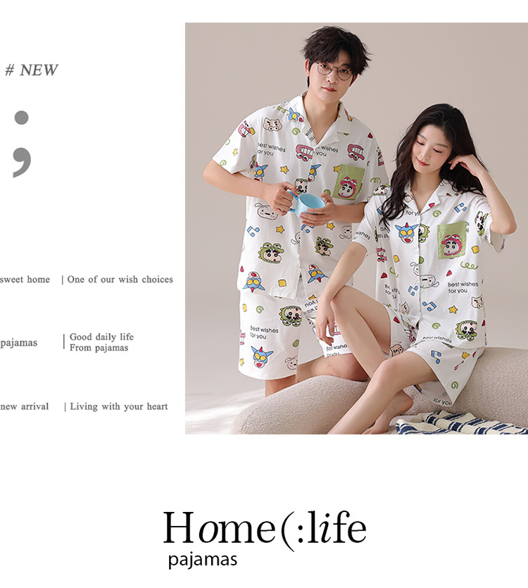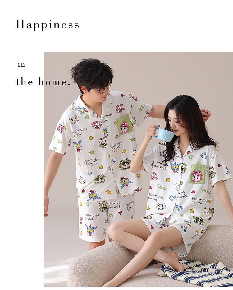 새로운 코튼 옷깃 카디건 커플 만화 잠옷 여름 겉옷 캐주얼 한 느슨한 남녀 홈 의류 배치