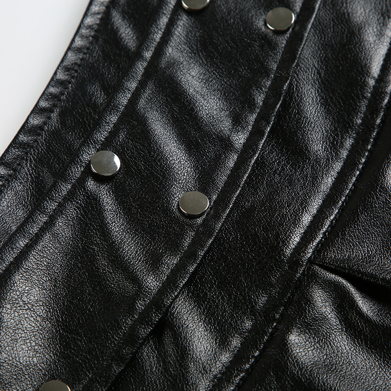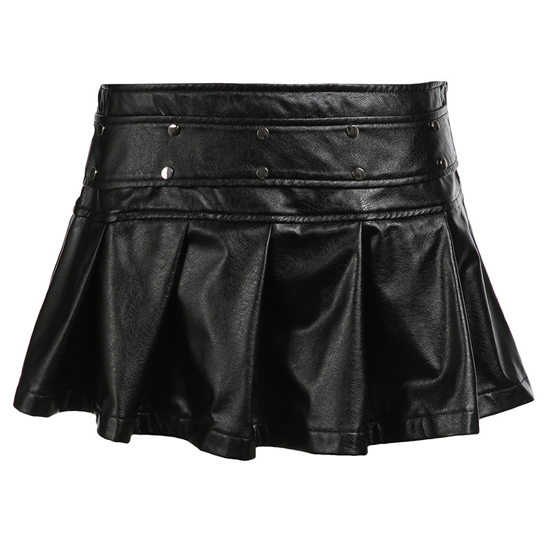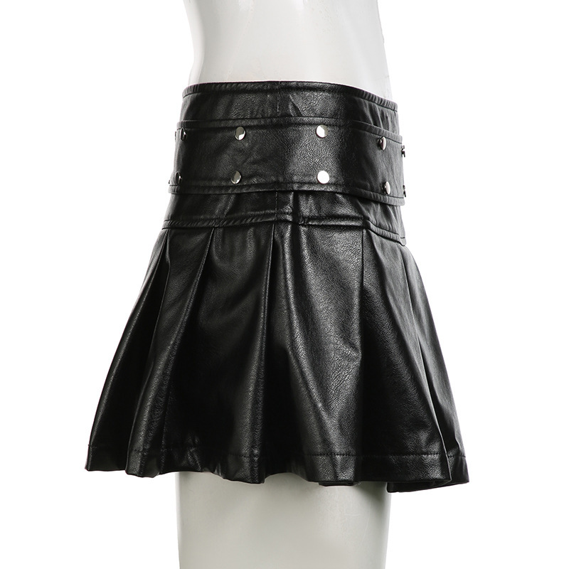 유럽과 미국의 스트리트 바이커 스타일 스플라이스 리벳 가죽 미니 스커트 핫 소녀 섹시한 지퍼 허리 스커트 플리츠 스커트