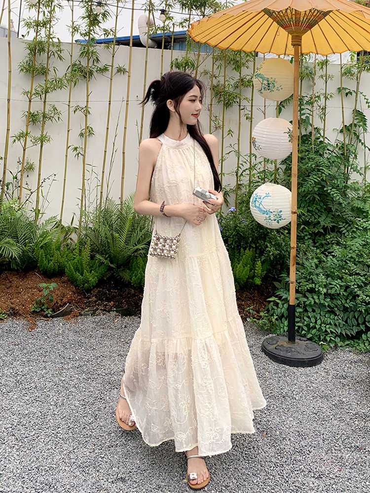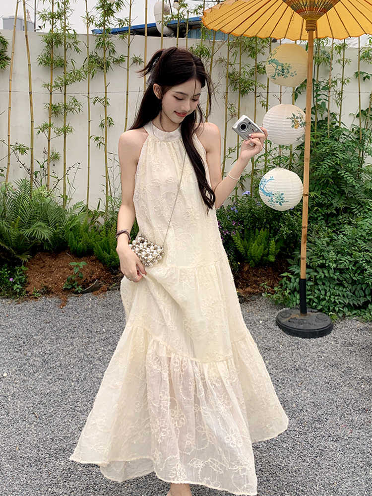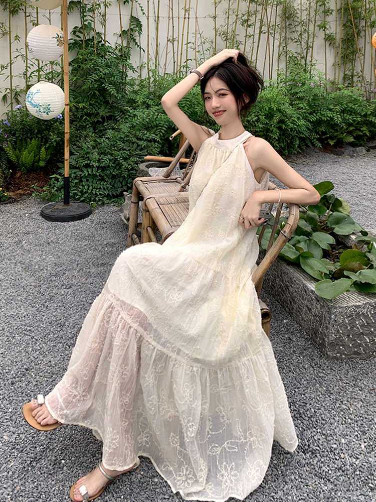 요정 화이트 레이스 숄더 비치 롱 원피스 해변 휴가 스트랩 스커트 프렌치 레트로 넥 원피스 여름