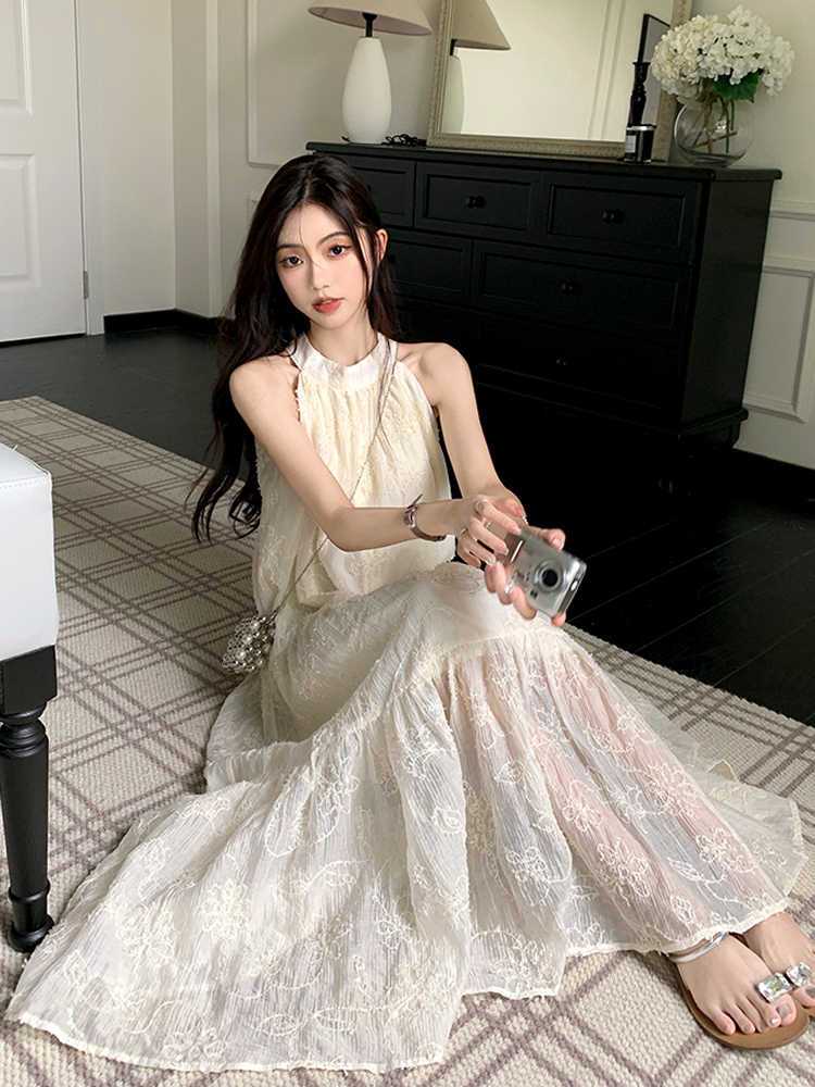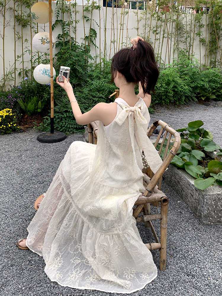 요정 화이트 레이스 숄더 비치 롱 원피스 해변 휴가 스트랩 스커트 프렌치 레트로 넥 원피스 여름스토어 가기