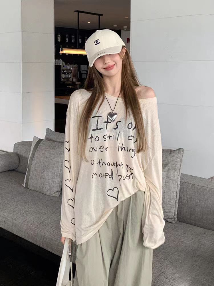 미국 편지 사랑 인쇄 된 선 스크린 티셔츠 여성의 2025 여름 새로운 게으른 스타일 얇은 느슨한 에어컨 블라우스스토어 가기