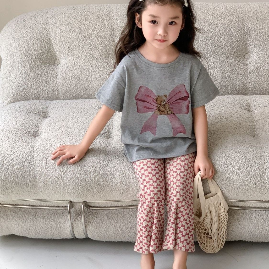 어린이 외국 스타일 세트 2024 여름 새 소녀 아기 짧은 소매 프린트 티셔츠 트럼펫 바지 투피스스토어 가기