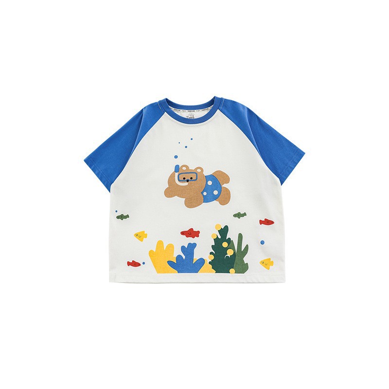 Wuri Boys의 2025 년 여름 새로운 수중 세계 라운드 넥 반팔 티셔츠 통기성 어린이 올매치 탑스토어 가기