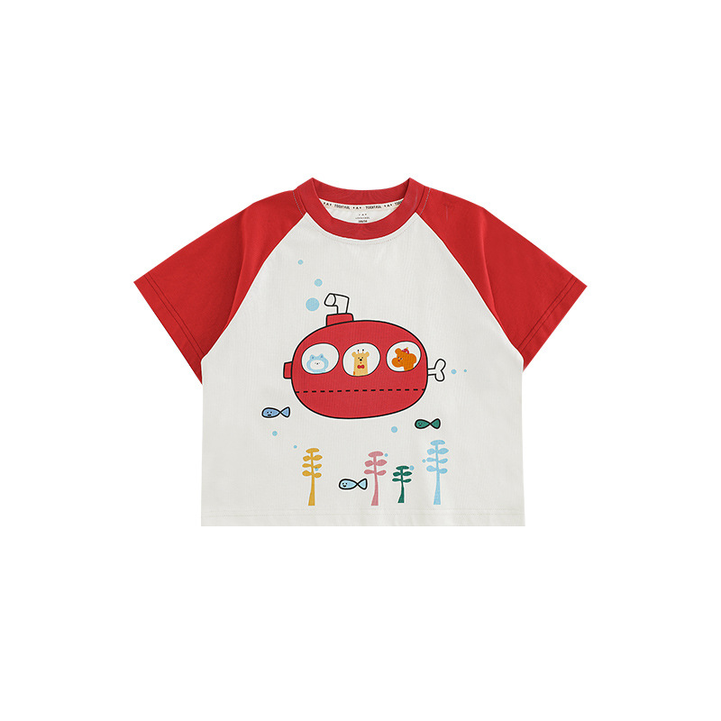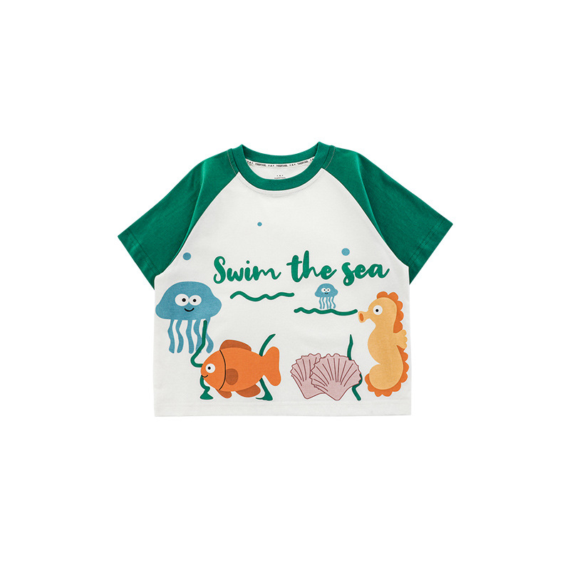 Wuri Boys의 2025 년 여름 새로운 수중 세계 라운드 넥 반팔 티셔츠 통기성 어린이 올매치 탑