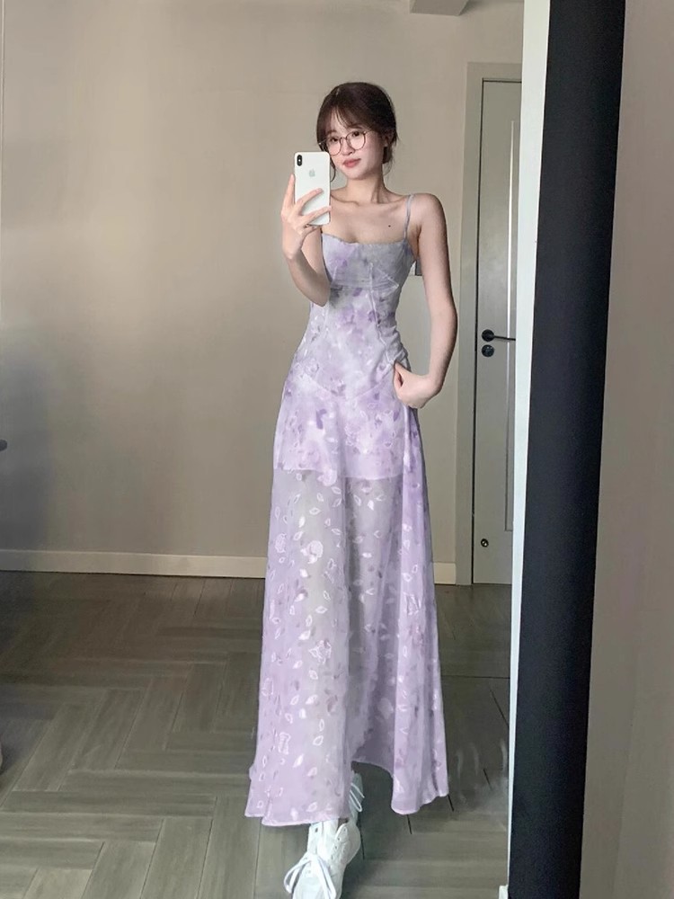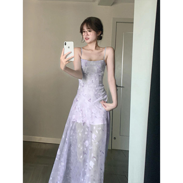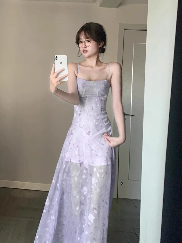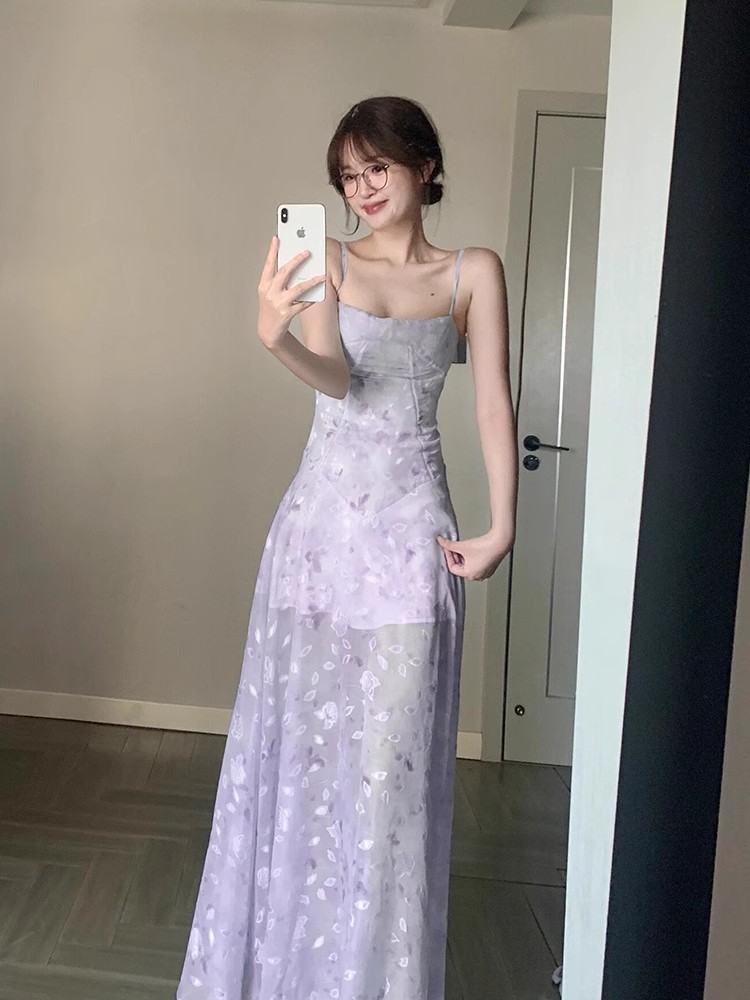 야심 찬 보라색 꽃 원피스 여성의 여름 새로운 순수한 욕망 하이 엔드 절묘하고 아름다운 긴 원피스스토어 가기