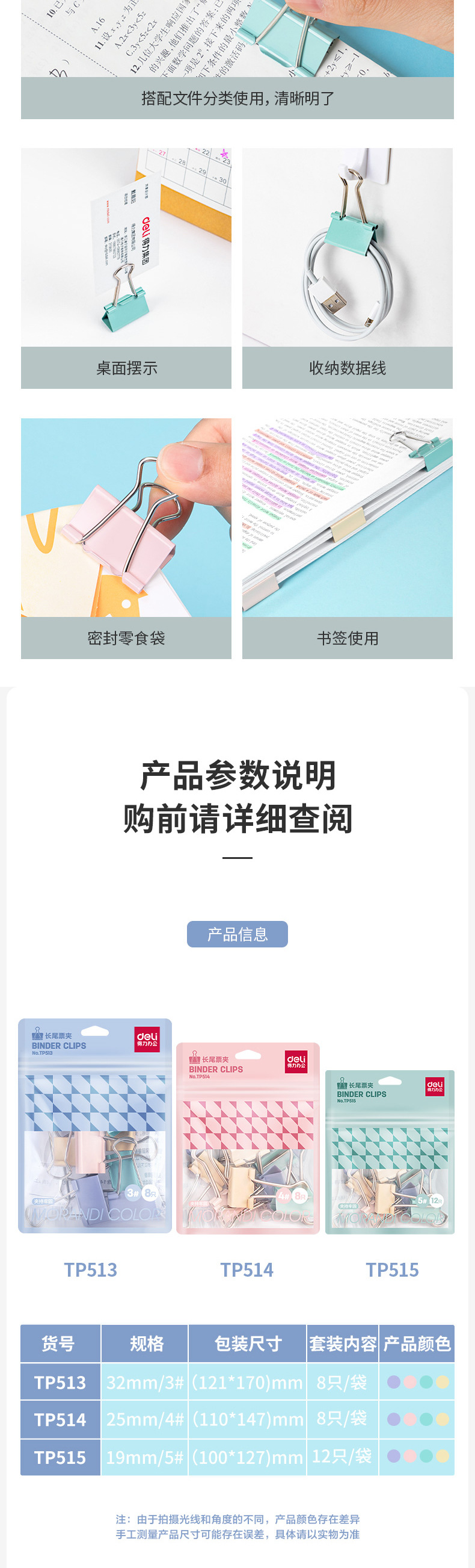 델리 TP515/514/513 모란디 롱테일 클립 금속 스왈로우테일 클립 티켓 클립 크고 작은 사무실 폴더스토어 가기