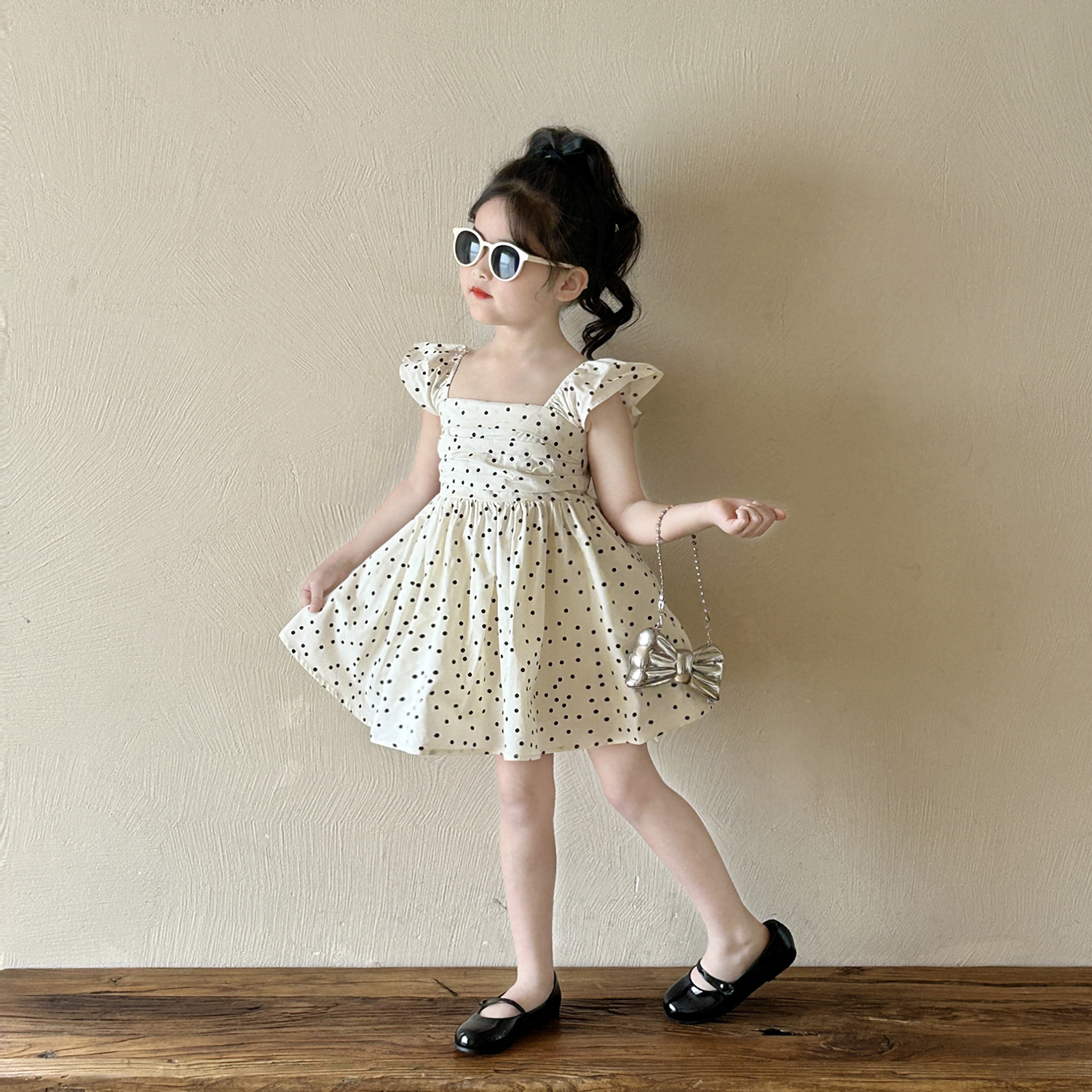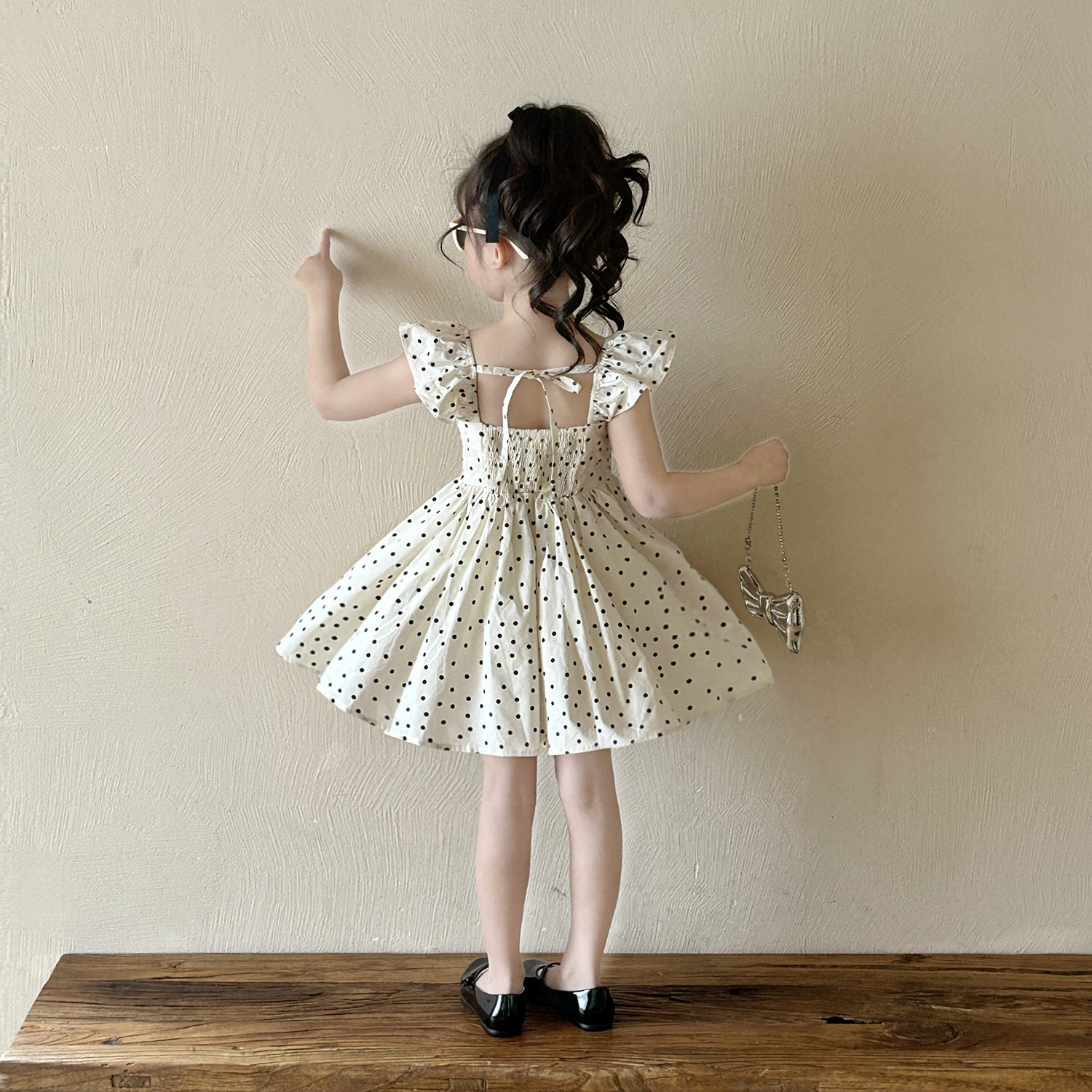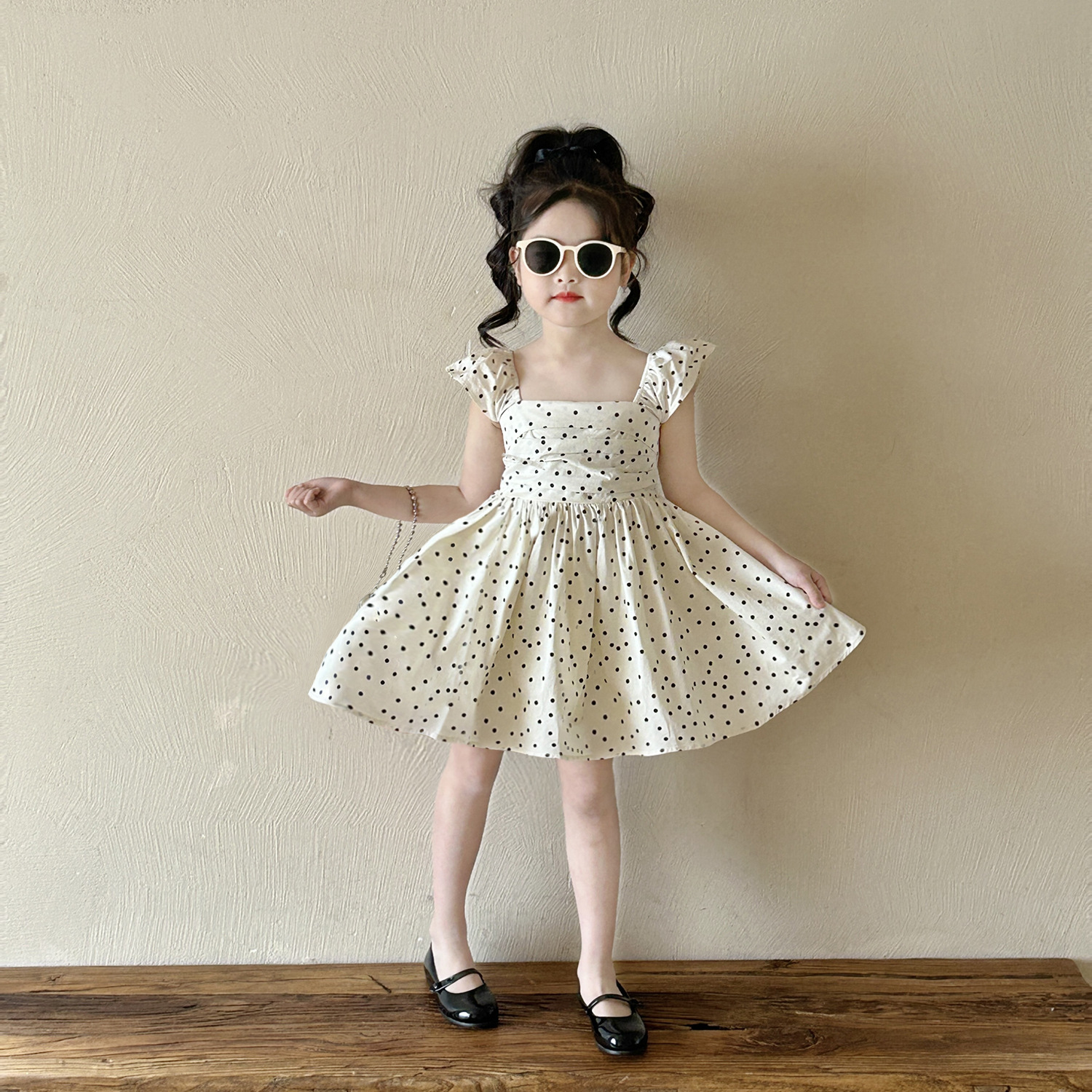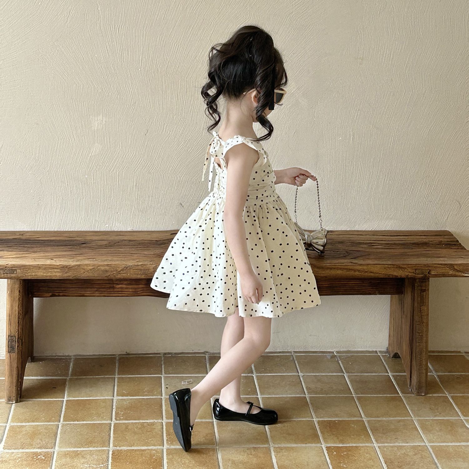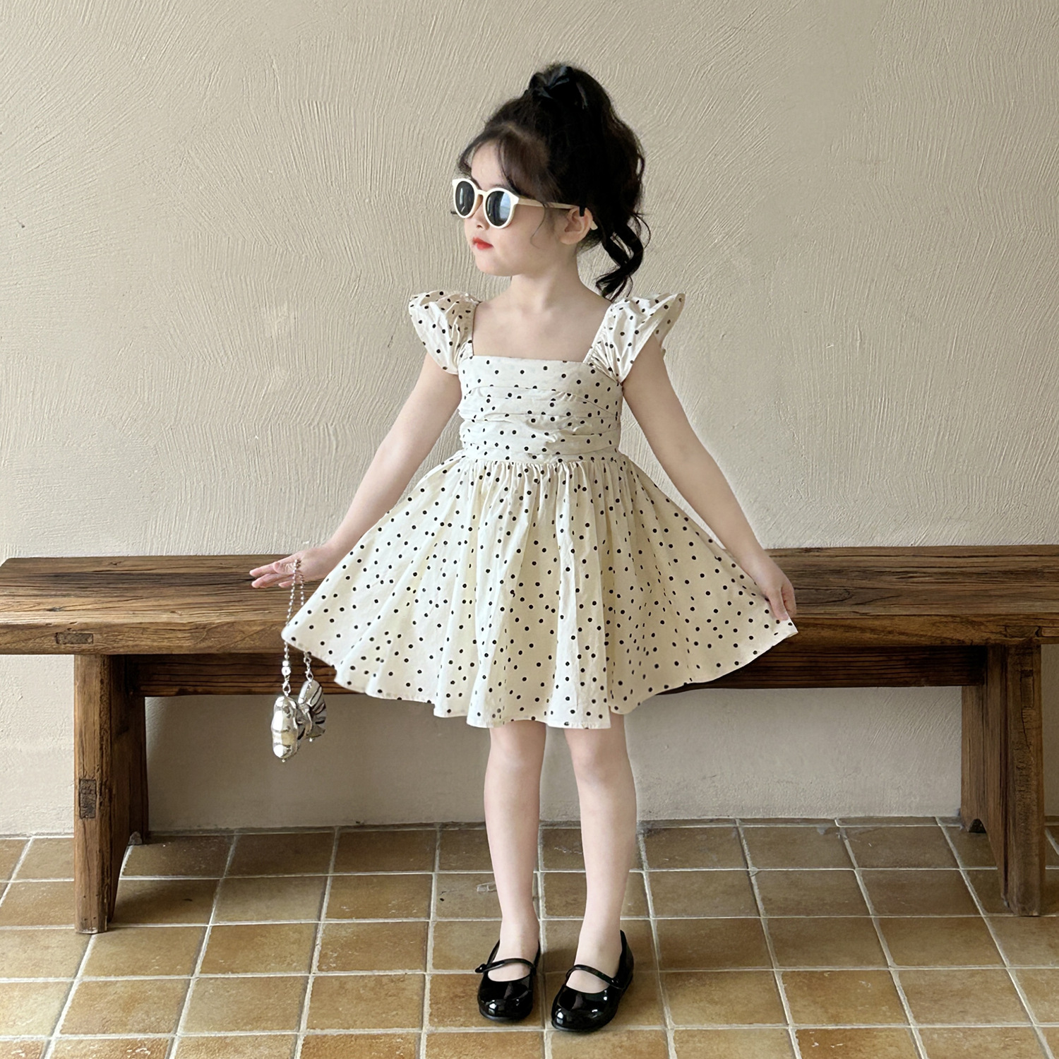 소녀 웨이브 도트 작은 플라이 슬리브 Vise 치마 원피스 2025 여름 소녀 백리스 공주 스커트 퍼프 큰 스윙 스커트스토어 가기