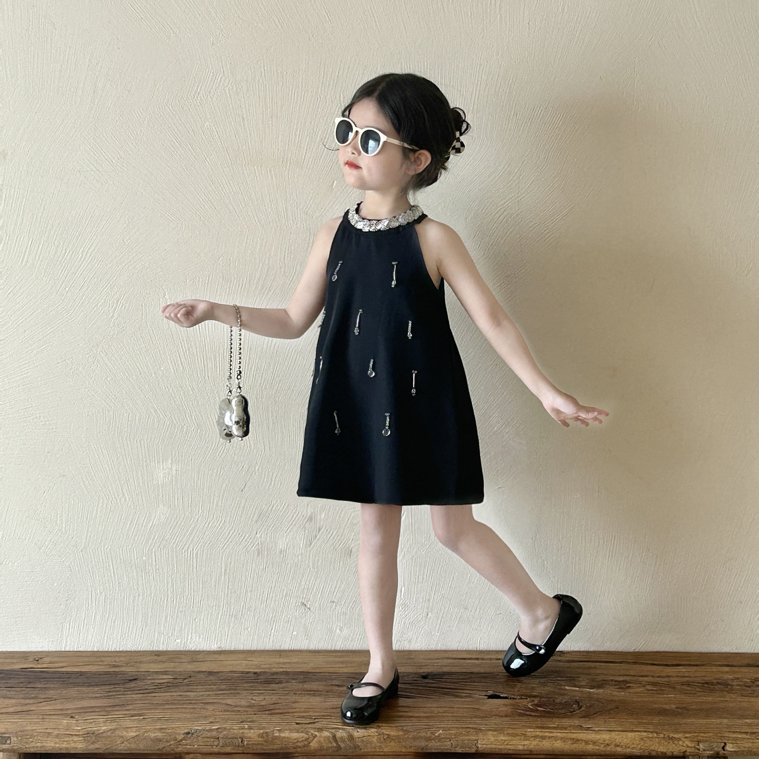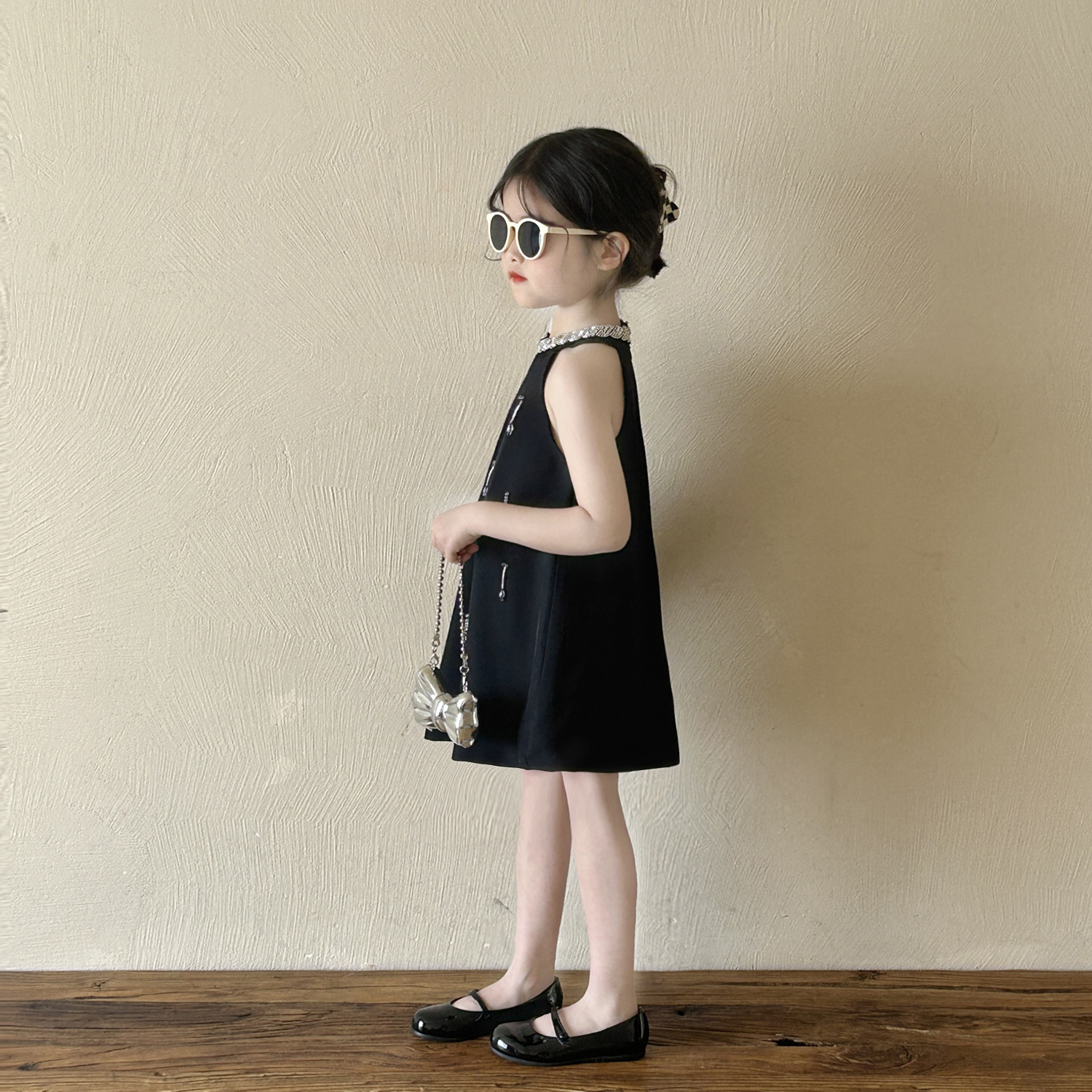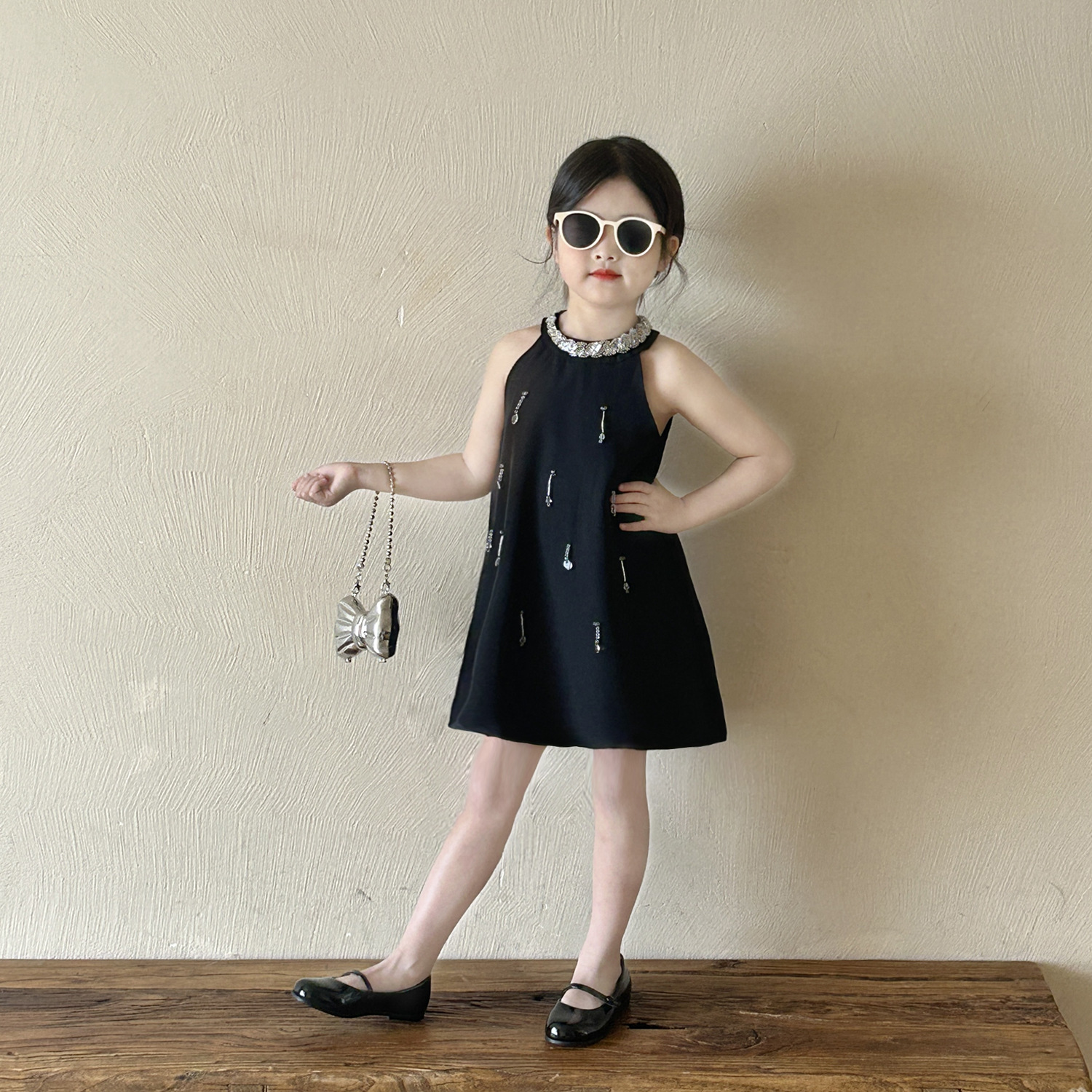 소녀 목 세트 다이아몬드 리틀 블랙 원피스 원피스 2025 여름 새 소녀 헵번 스타일 생일 원피스 공주 원피스스토어 가기