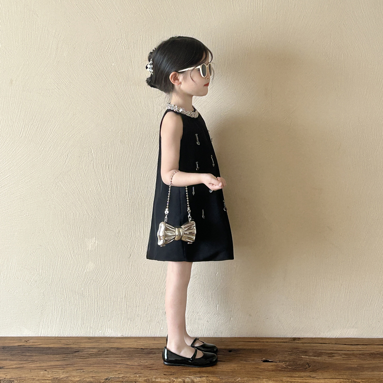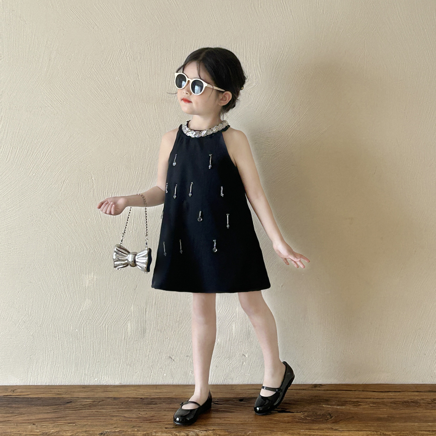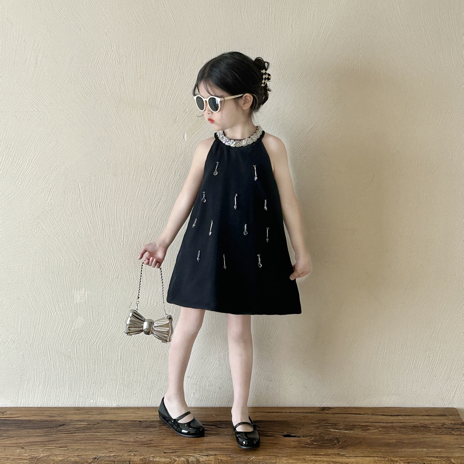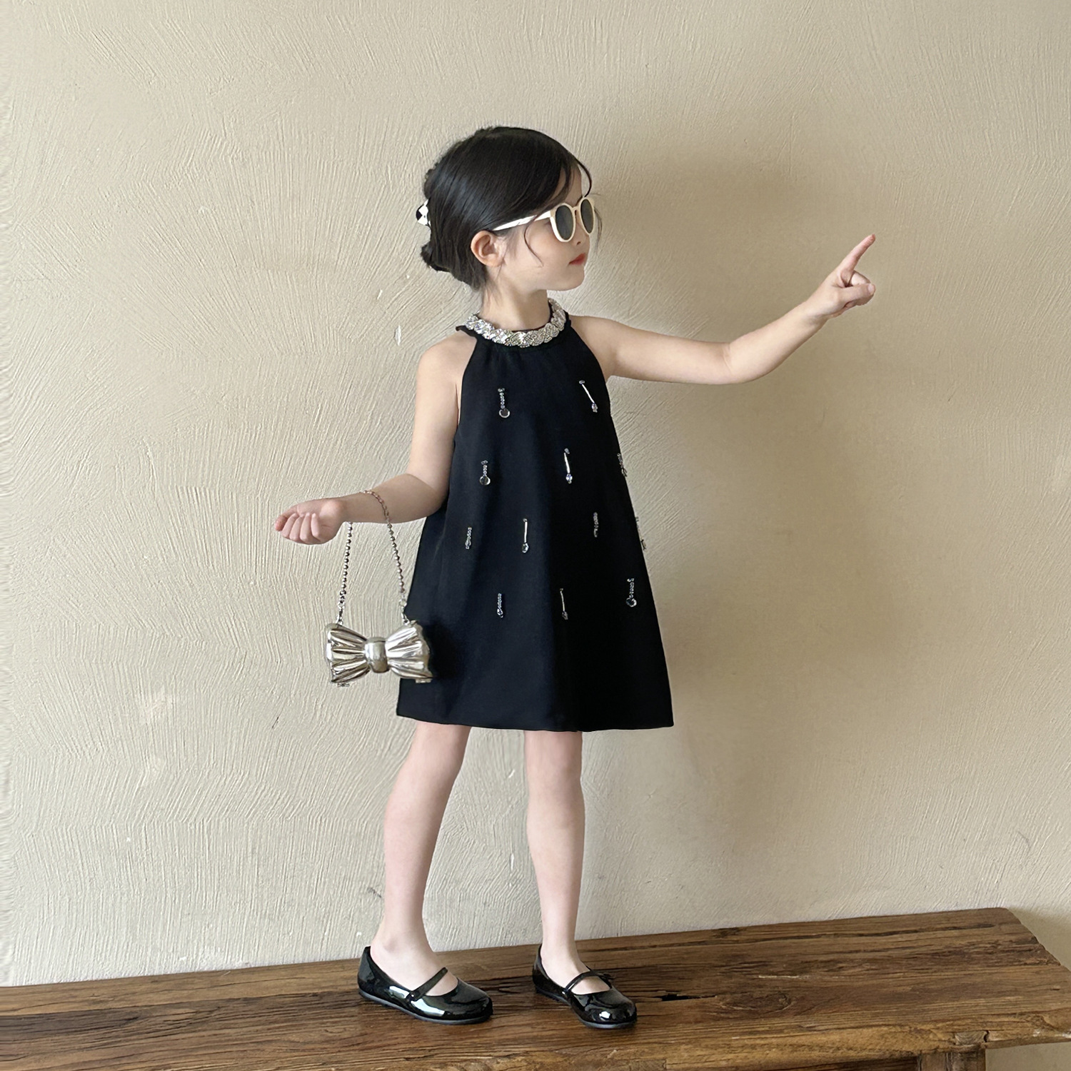 소녀 목 세트 다이아몬드 리틀 블랙 원피스 원피스 2025 여름 새 소녀 헵번 스타일 생일 원피스 공주 원피스스토어 가기