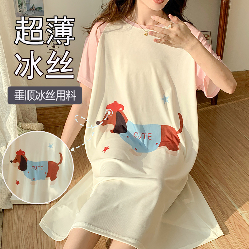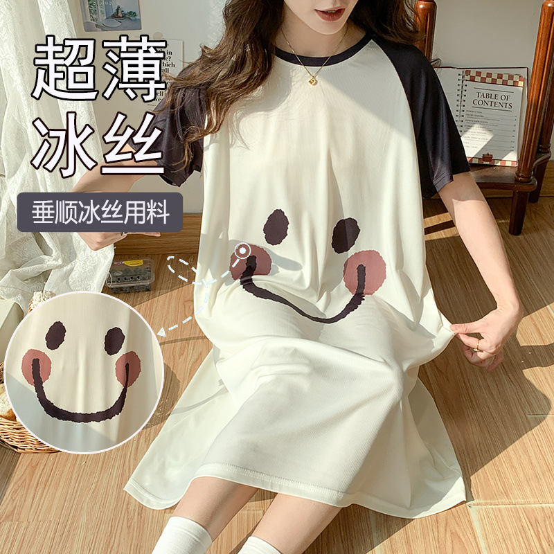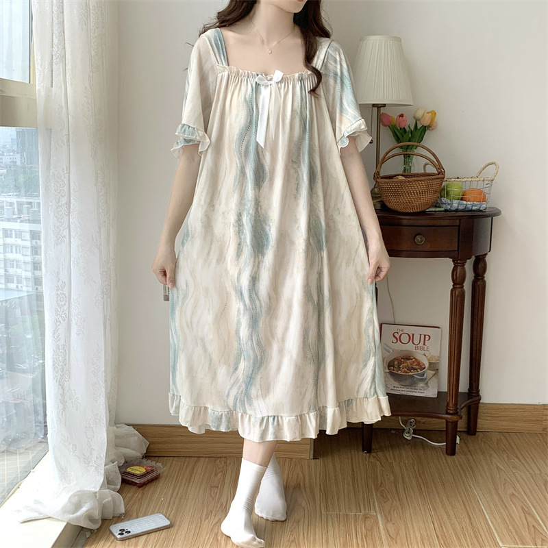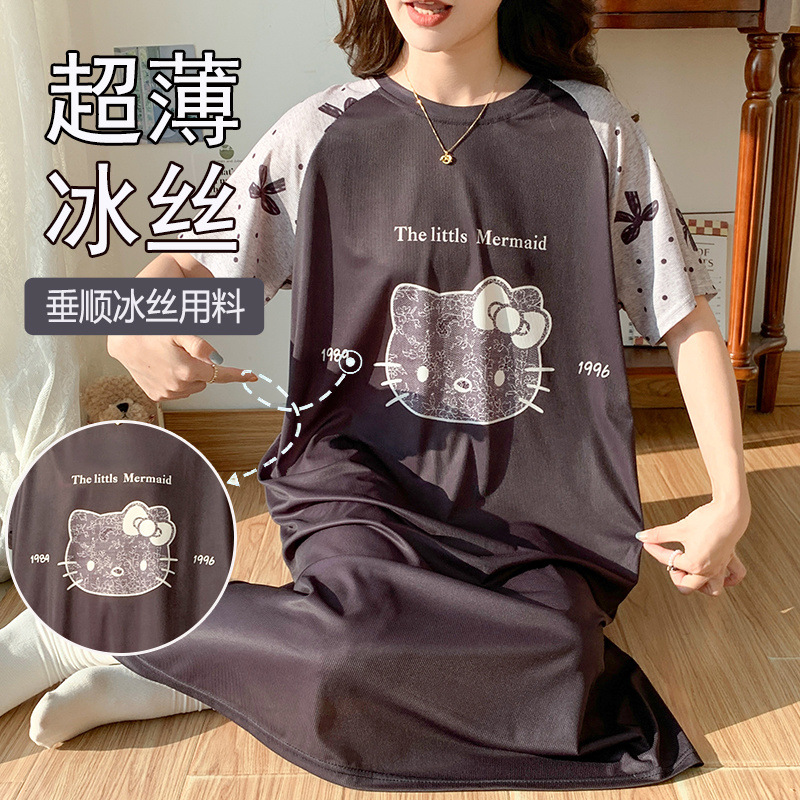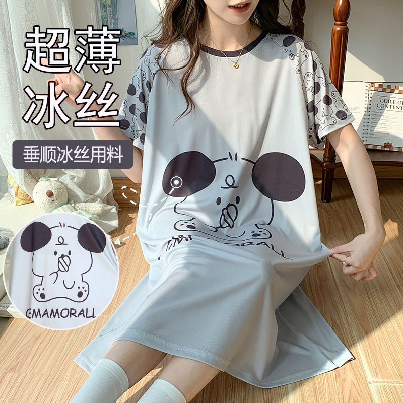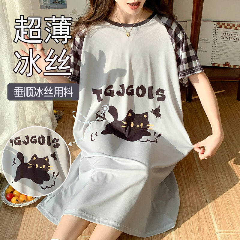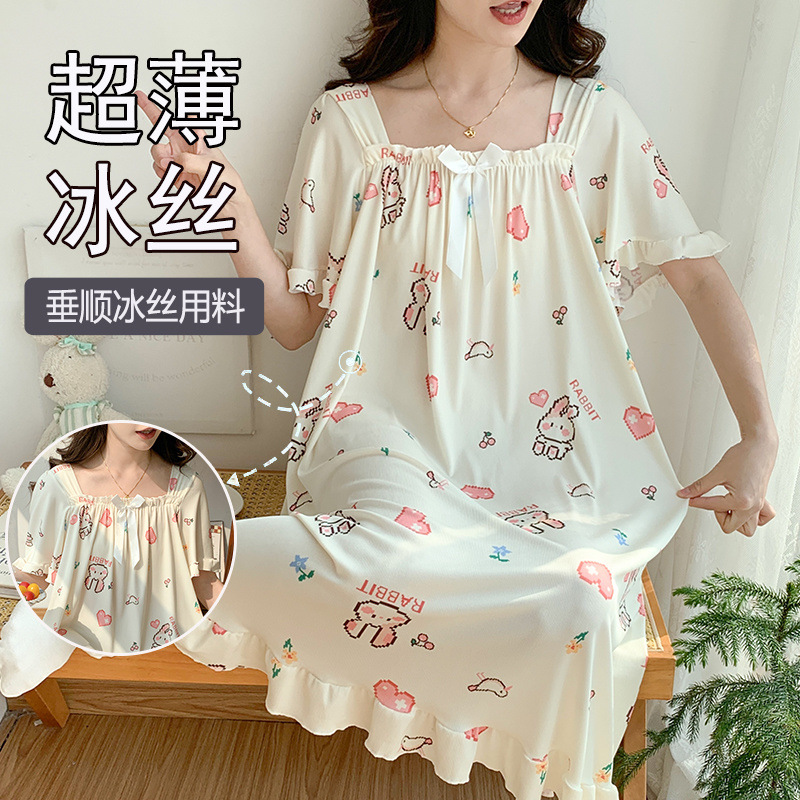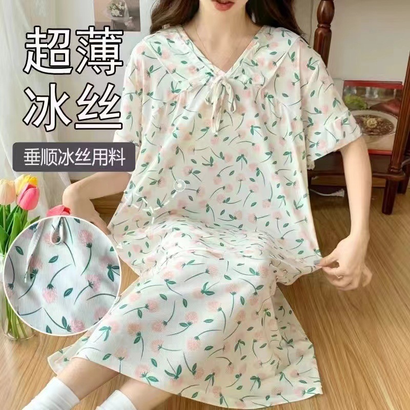 반팔 아이스 실크 잠옷 여름 150.00kg 플러스 사이즈 느슨한 얇은 통통녀 공주 잠옷 달콤한 무릎 원피스스토어 가기