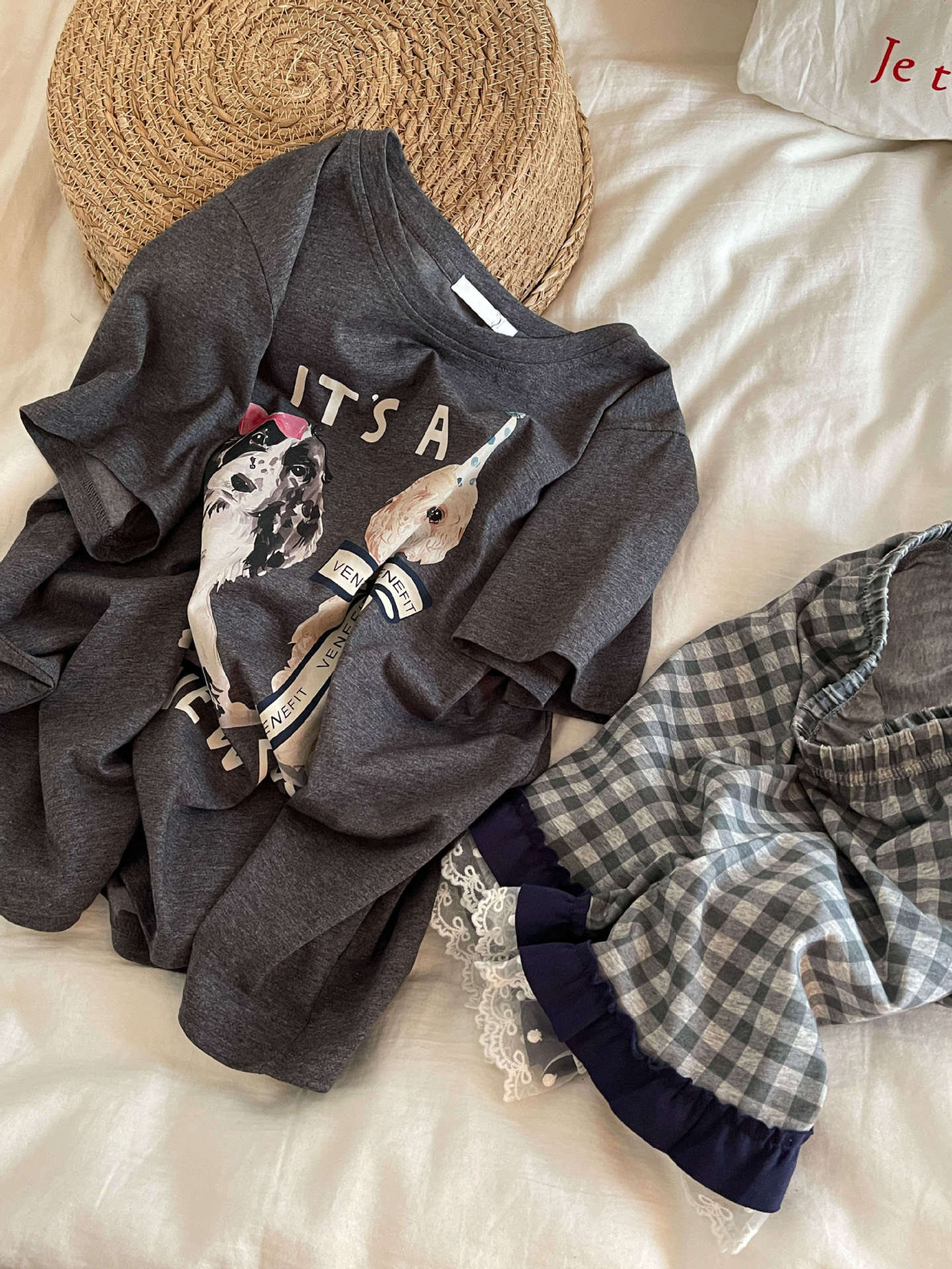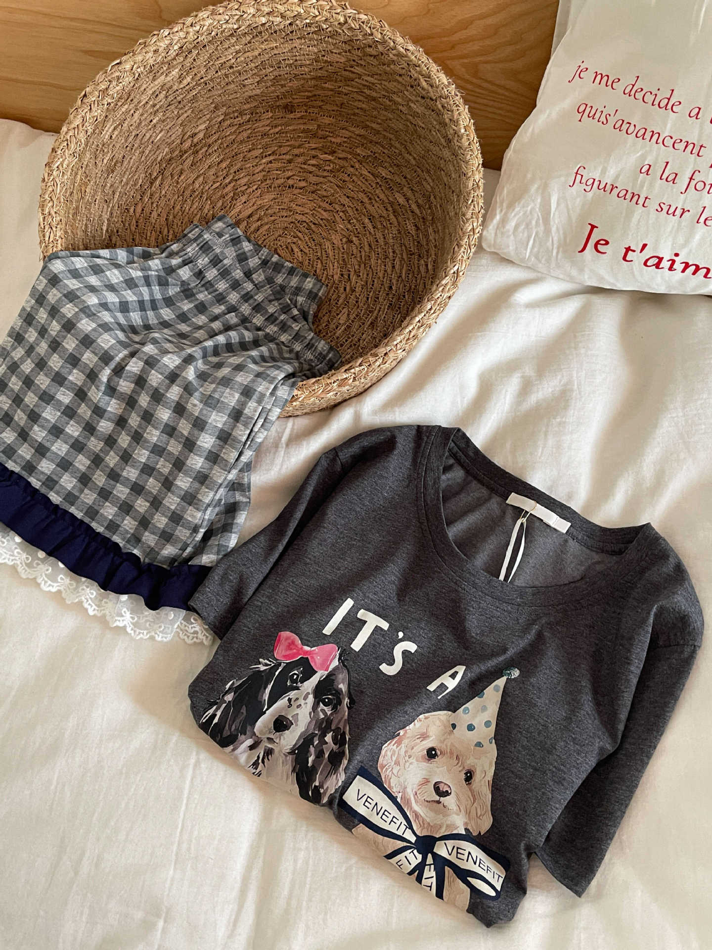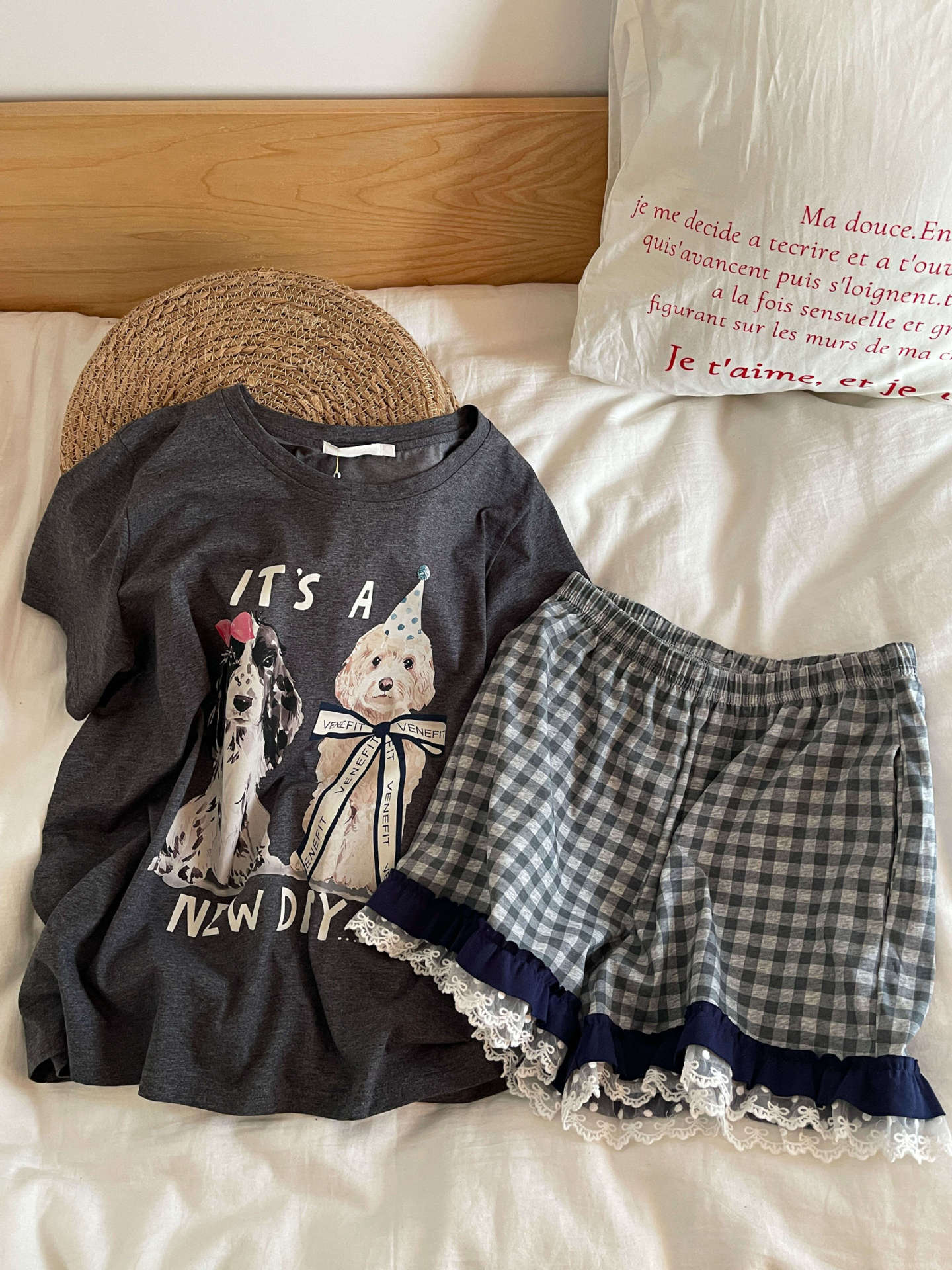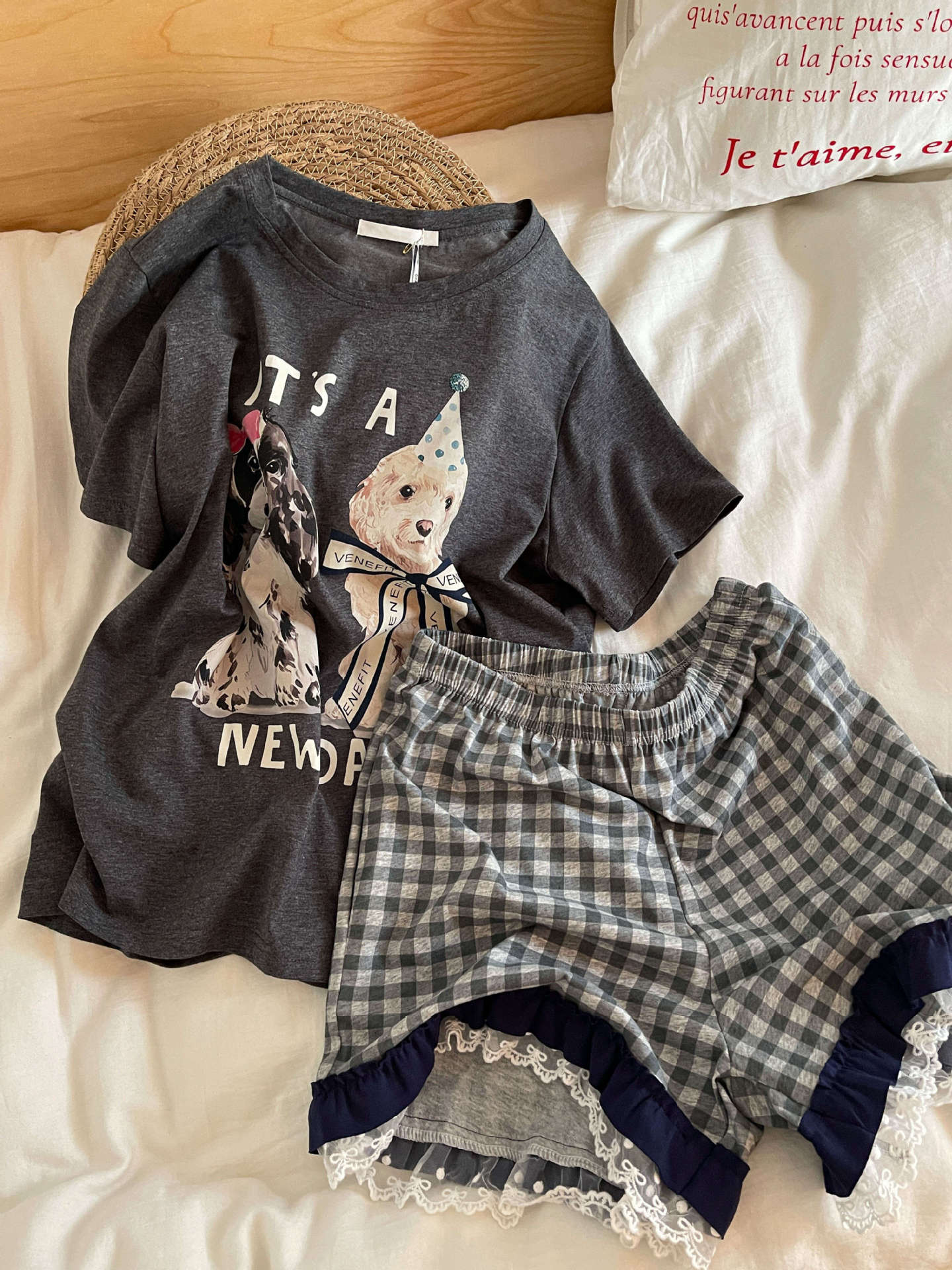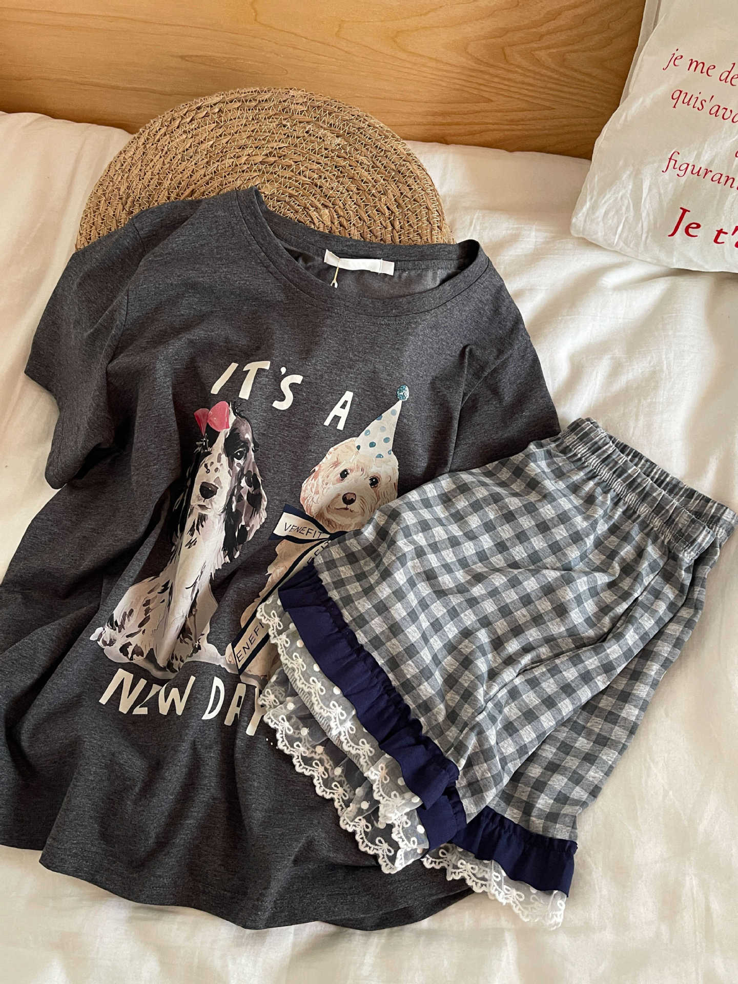 한국 스타일 느슨한 강아지 크루 넥 짧은 소매 잠옷 여성 2025 년 여름 새로운 핑크 격자 반바지 세트 착용 가능