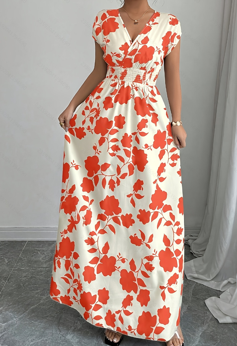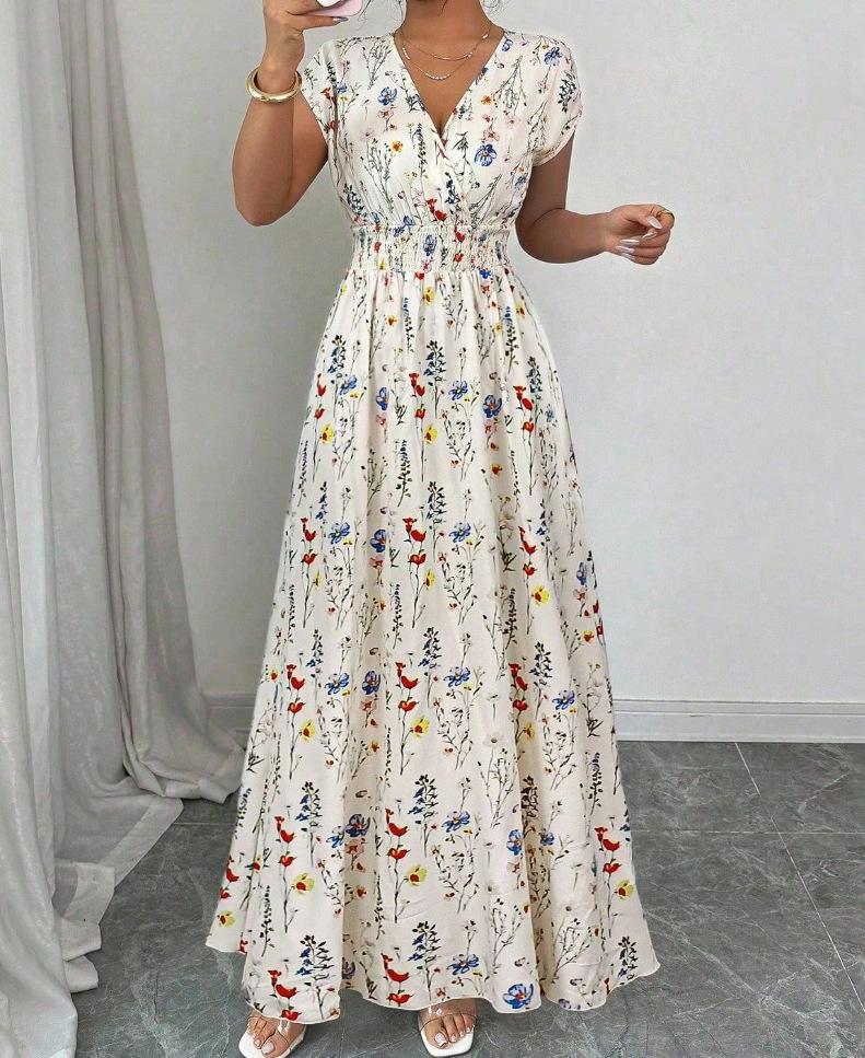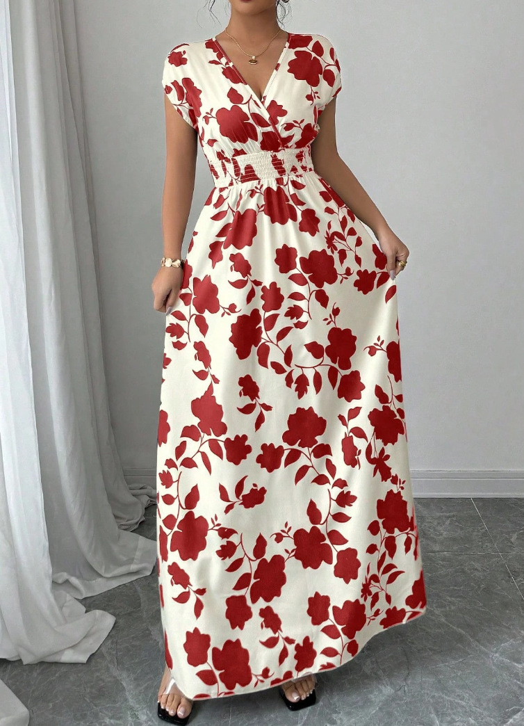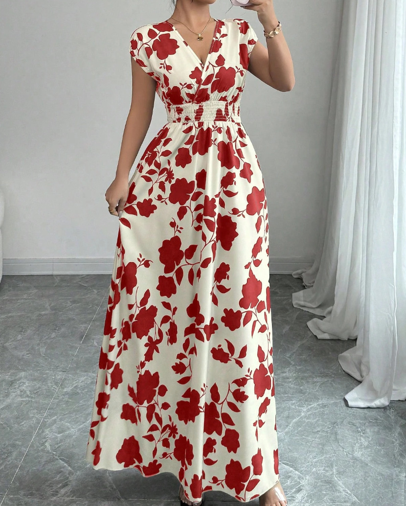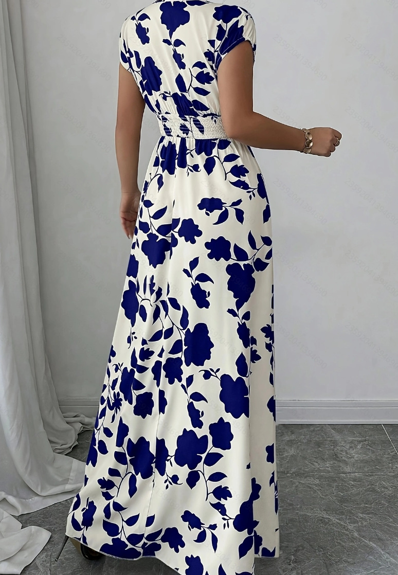반팔 레이스 업 원피스 아마존 새로운 인쇄 된 V-목 긴 원피스 국경 여름 허리 여성복
