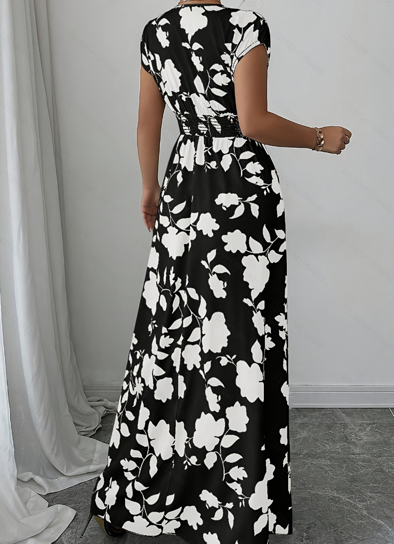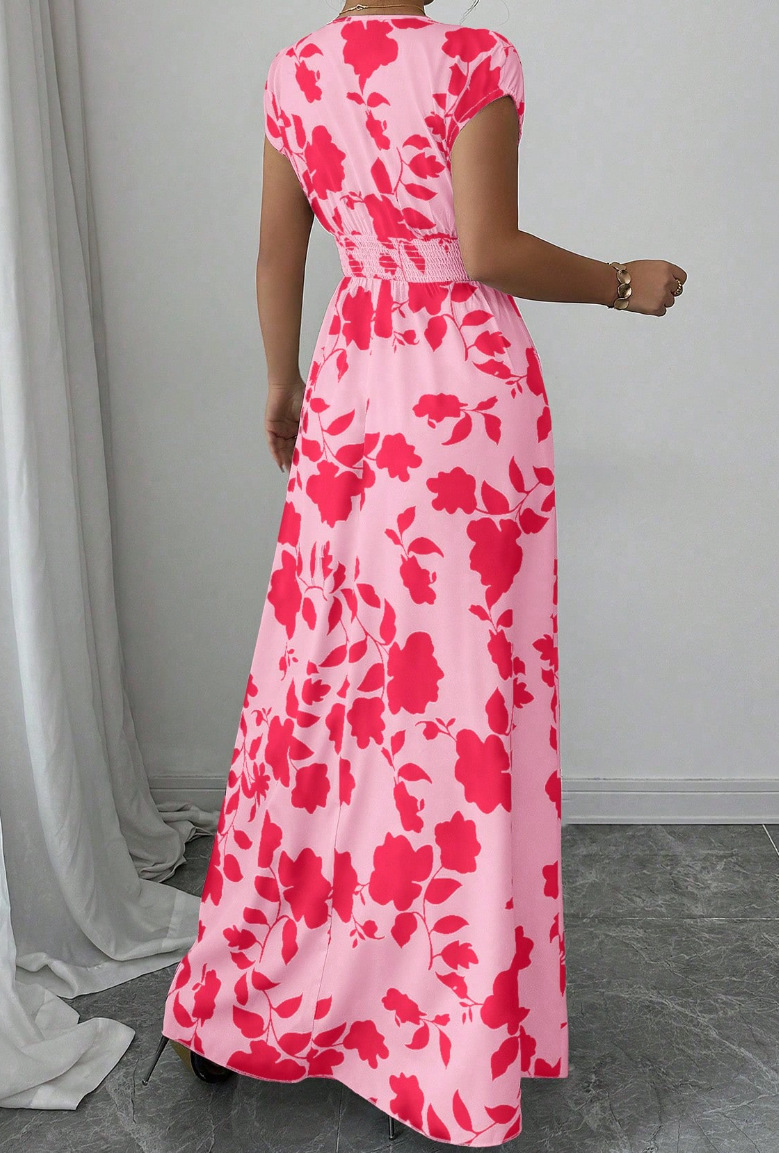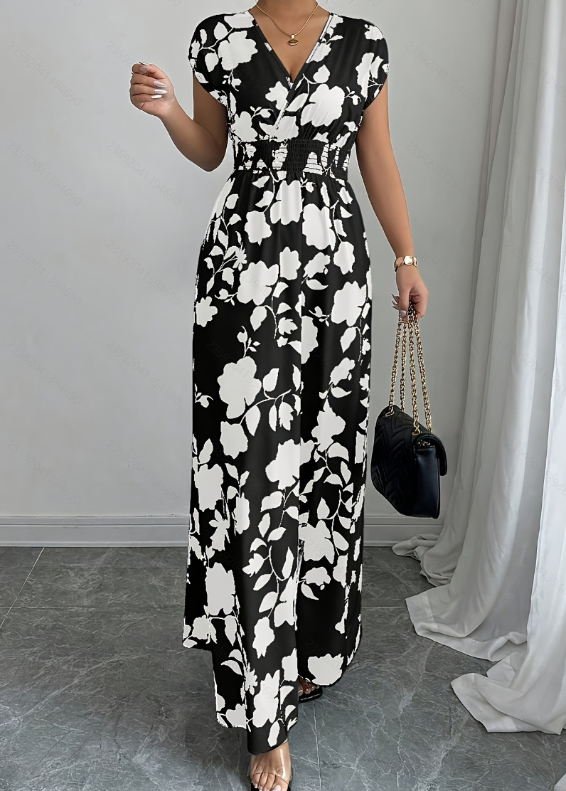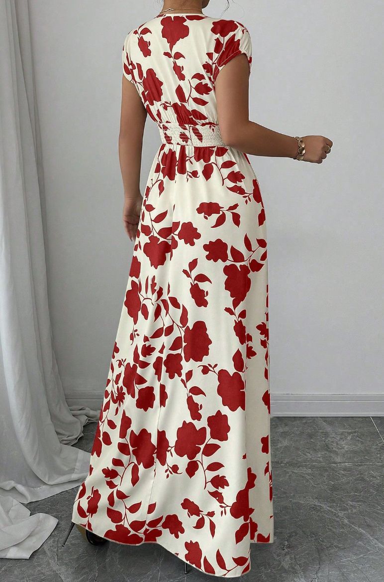 반팔 레이스 업 원피스 아마존 새로운 인쇄 된 V-목 긴 원피스 국경 여름 허리 여성복