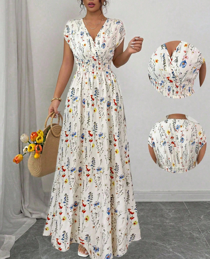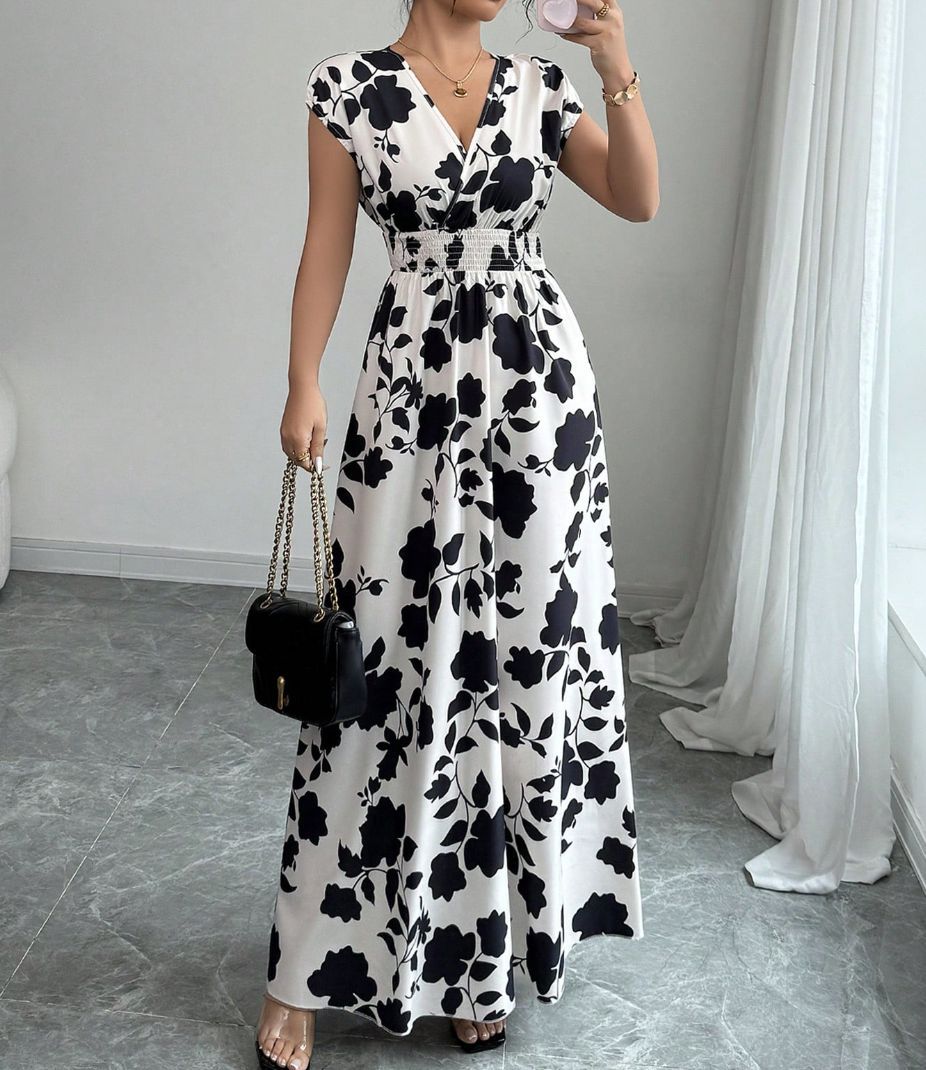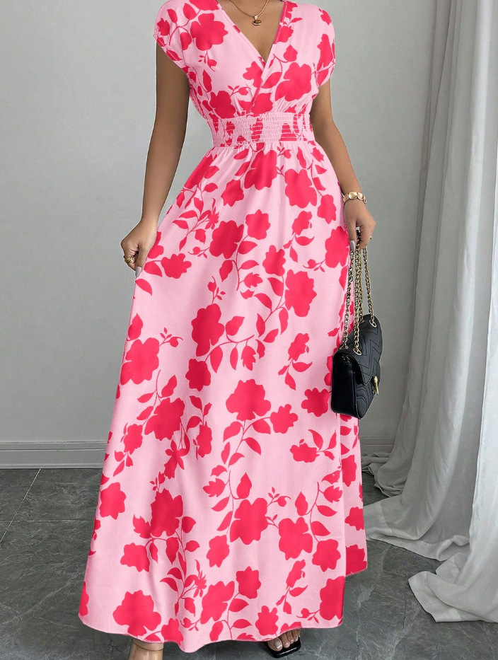 반팔 레이스 업 원피스 아마존 새로운 인쇄 된 V-목 긴 원피스 국경 여름 허리 여성복스토어 가기