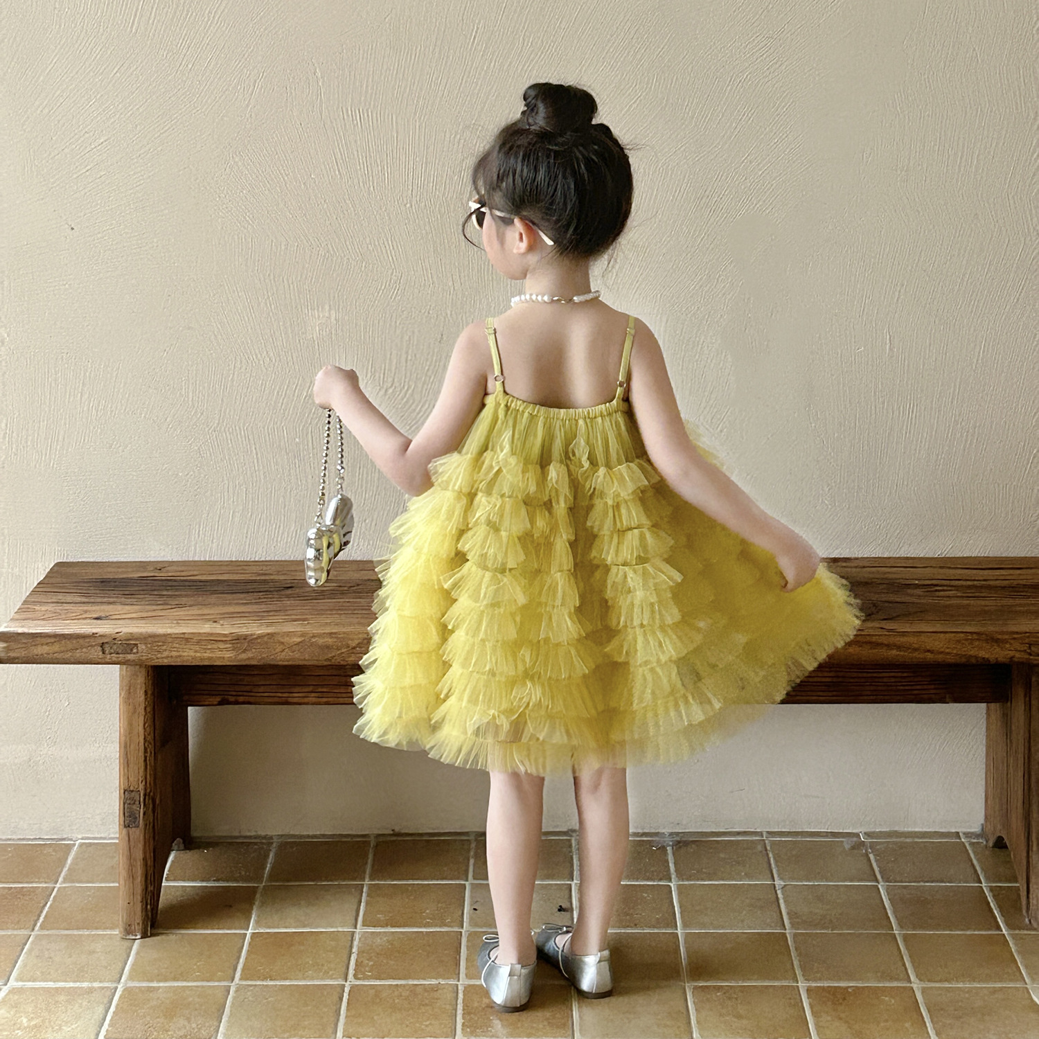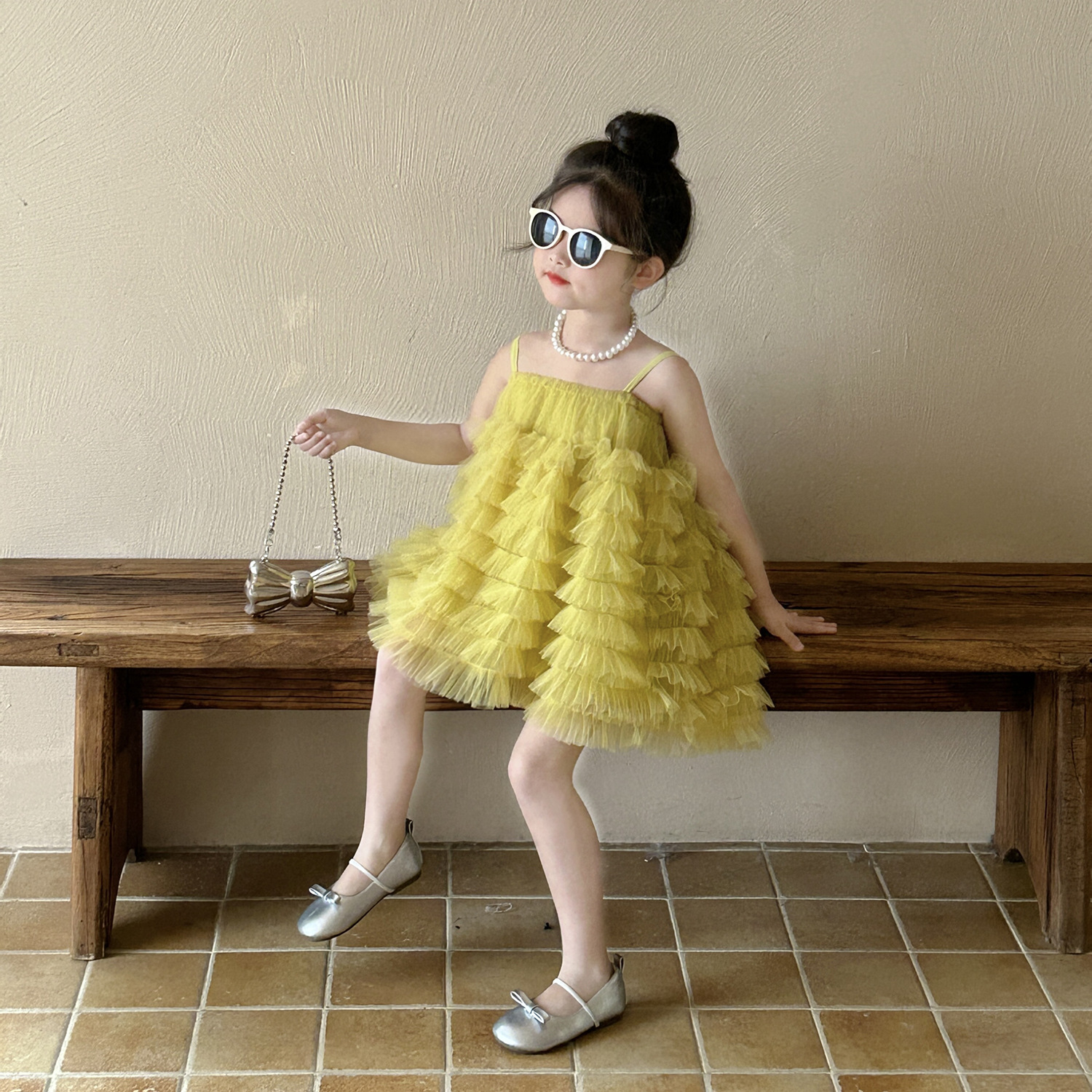 여자 프렌치 스타일 우아한 메쉬 슬링 원피스 2025 여름 새 소녀의 푹신한 케이크 스커트 공주 스커트스토어 가기